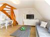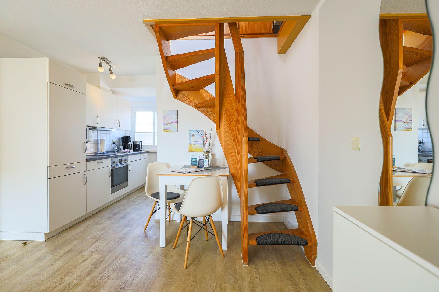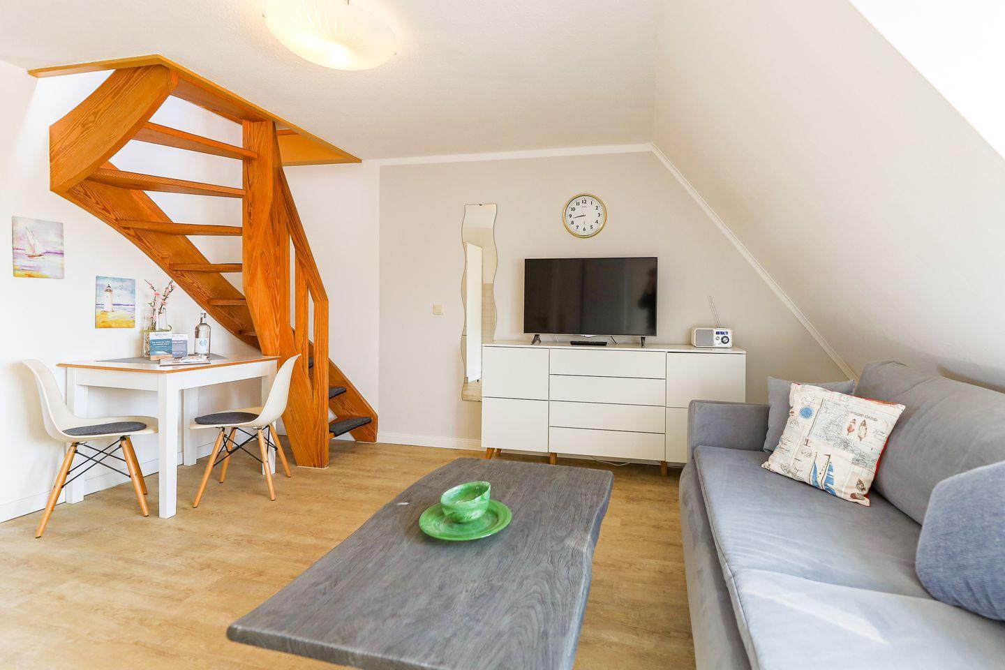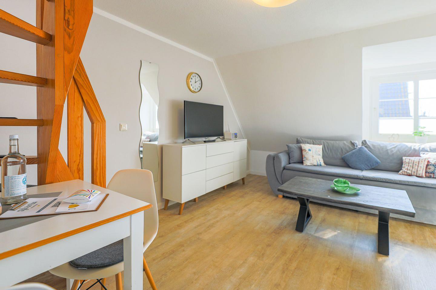Im Appartement Wanderdüne sorgt frisch-nordisch-gemütliches Flair - verteilt auf zwei Ebenen - für schöne Urlaubstage.
