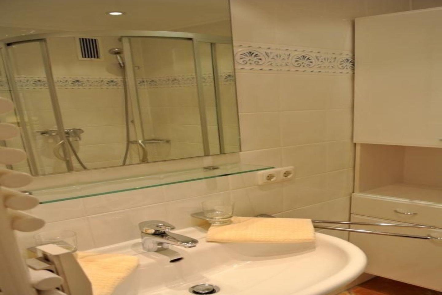 Das Badezimmer ist mit einer Dusche, einem Haartrockner und weiteren Annehmlichkeiten wie einem Handtuchwärmer ausgestattet. Für die tägliche Hygiene und zusätzliche Bequemlichkeit bestehen gemeinschaftlich nutzbare Waschmaschinen- und Trocknermöglichkeiten im Haus.