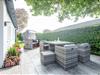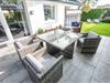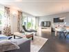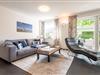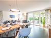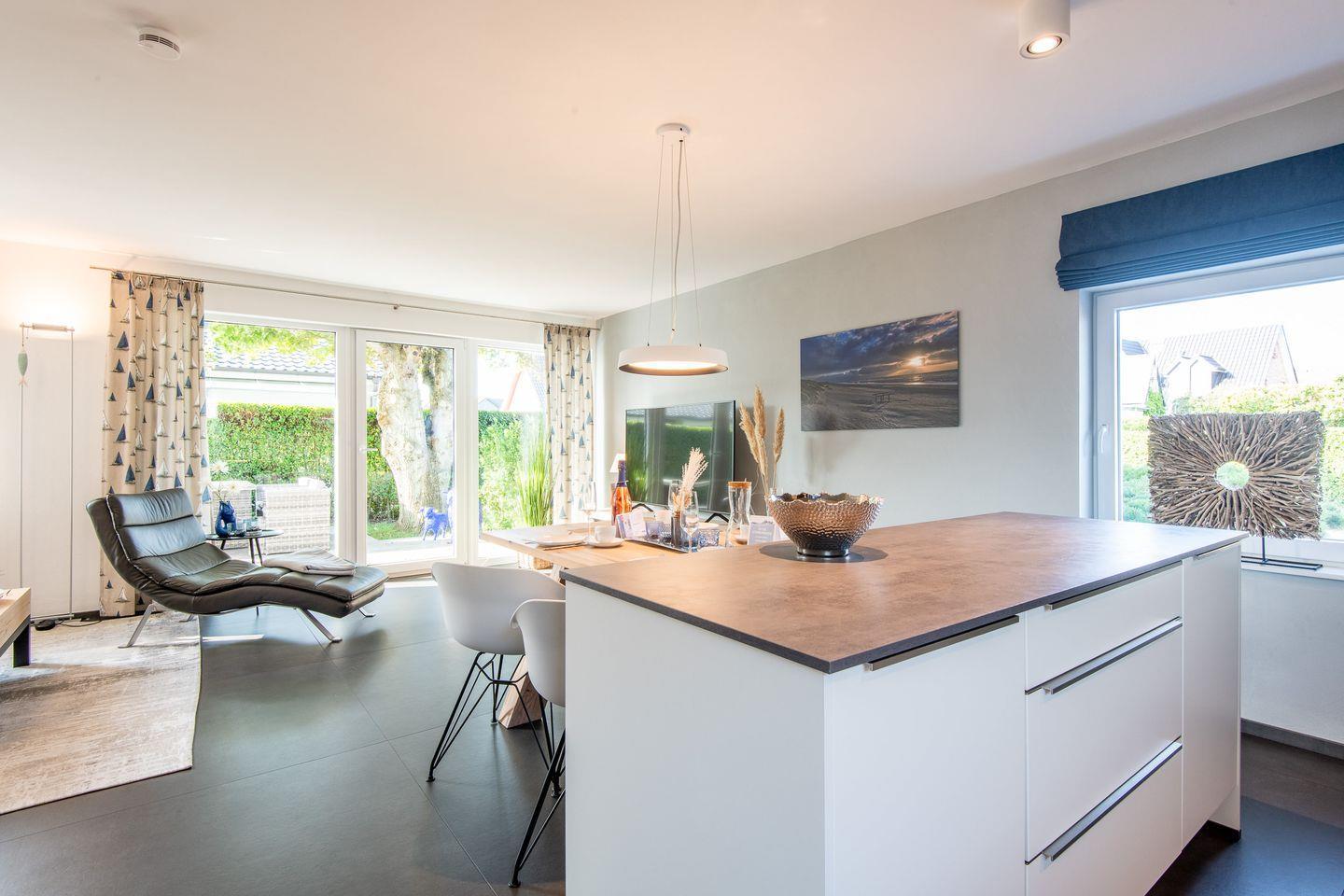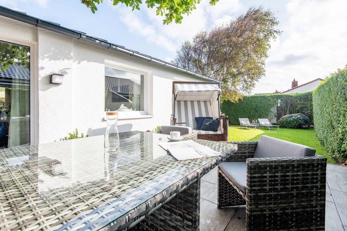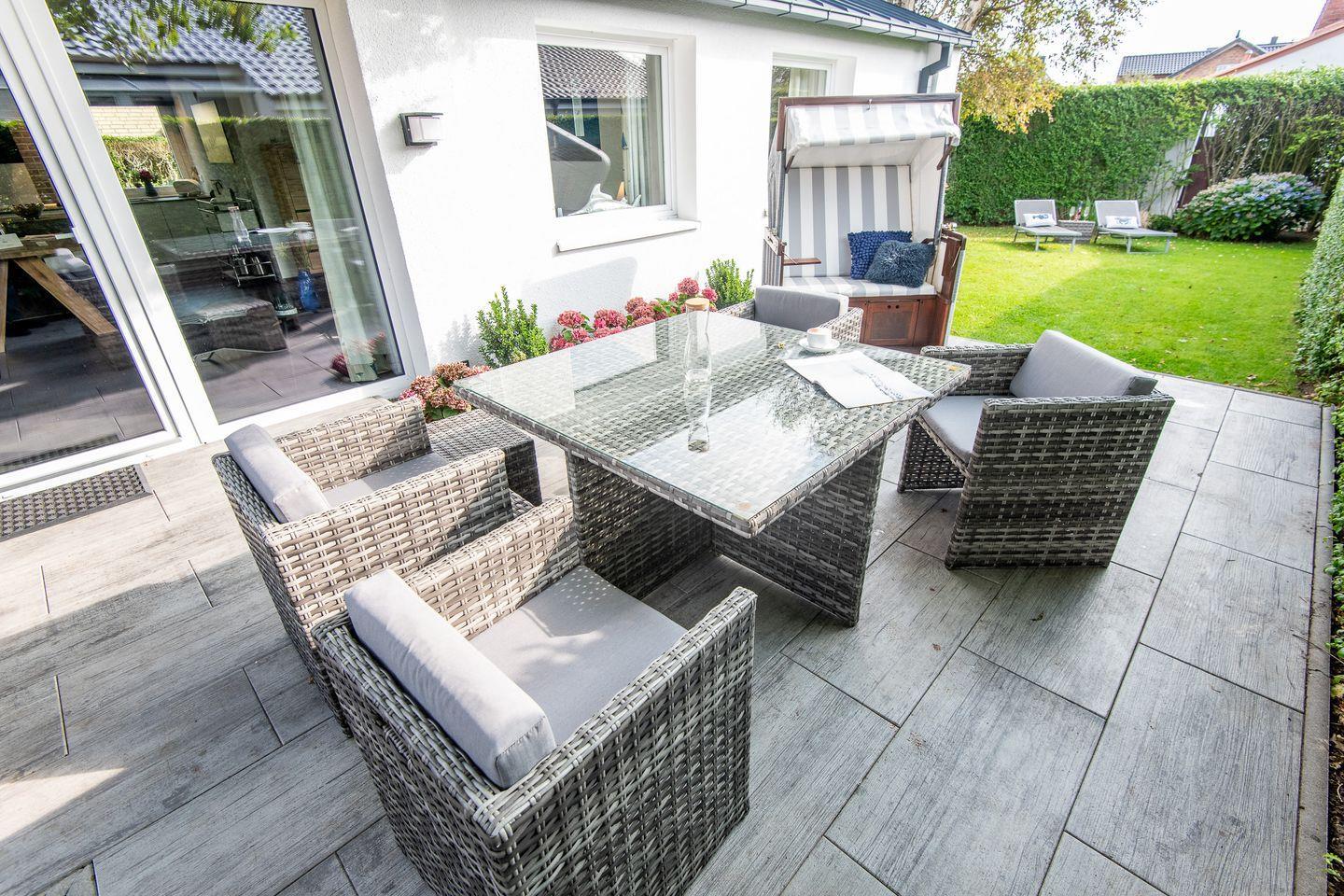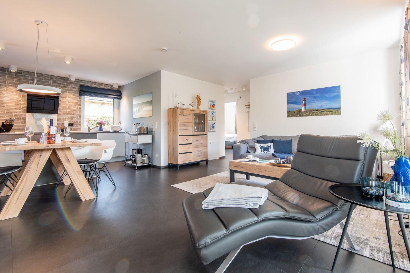 Das lichtdurchflutete Wohnzimmer ist stilvoll eingerichtet und lädt mit komfortablen Sofas und einem LED-TV zu entspannten Stunden ein. Der Essbereich, der sich harmonisch in den Wohnraum einfügt, bietet Platz für gemeinsame Mahlzeiten. Von hier aus haben Sie direkten Zugang zur möblierten Südterrasse mit Strandkorb und einem gepflegten Garten – ideal für sonnige Stunden und laue Abende in privater Atmosphäre.