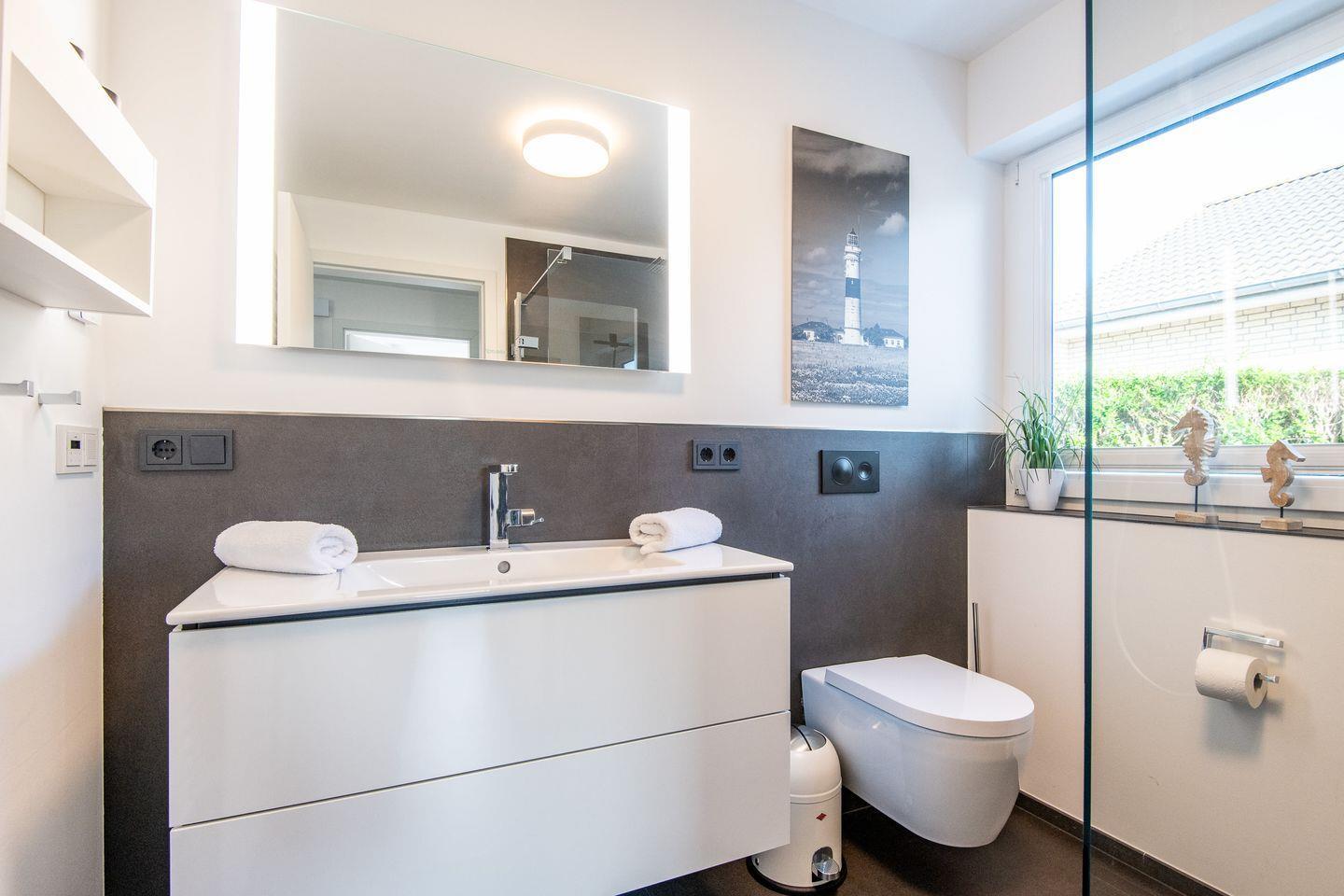 Das elegante Badezimmer ist mit einer ebenerdigen Rainshower-Dusche, WC, Handtuchheizkörper, Föhn und integriertem Radio ausgestattet – ideal für einen erfrischenden Start in den Tag oder entspannte Abendmomente.
