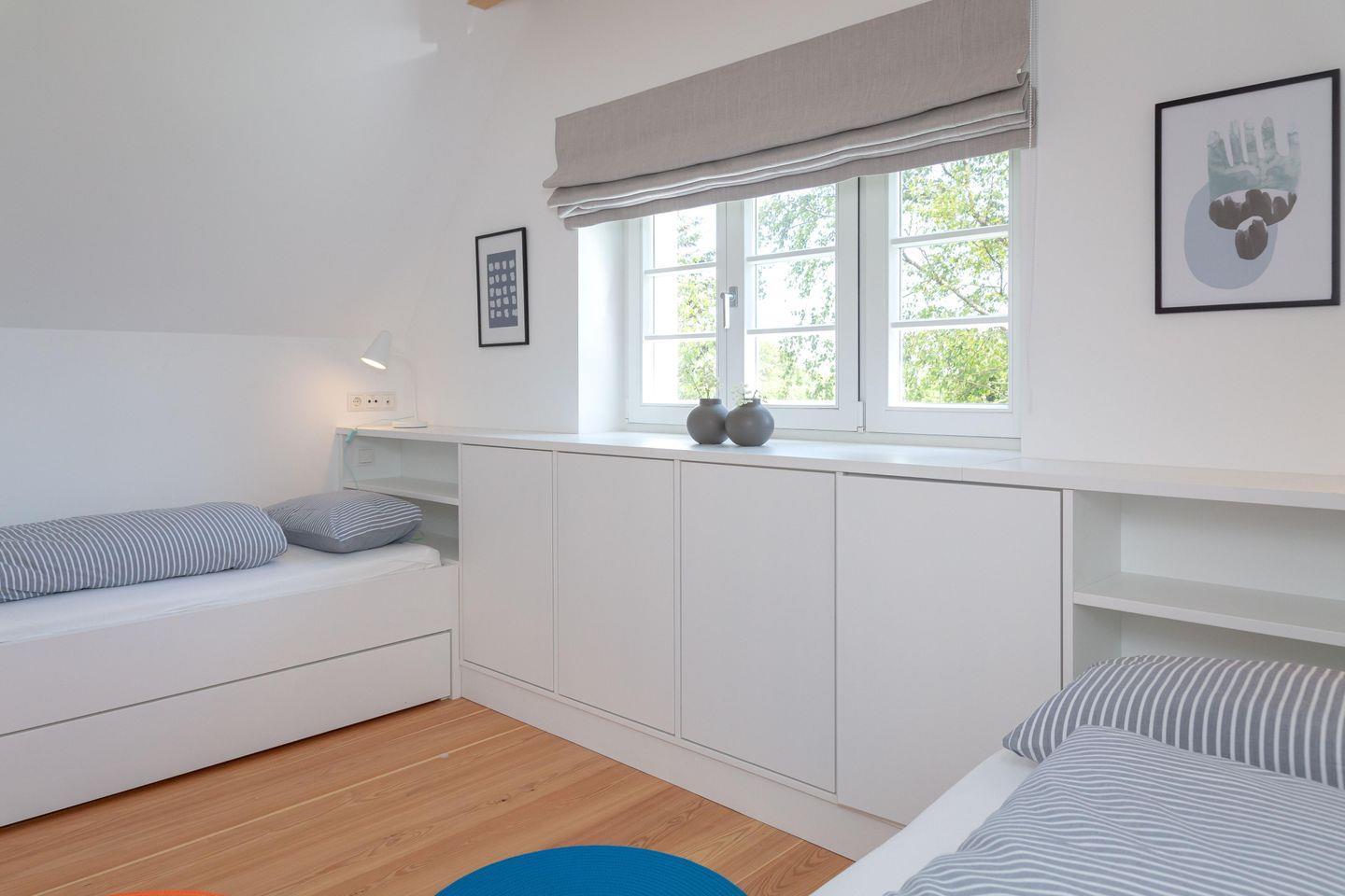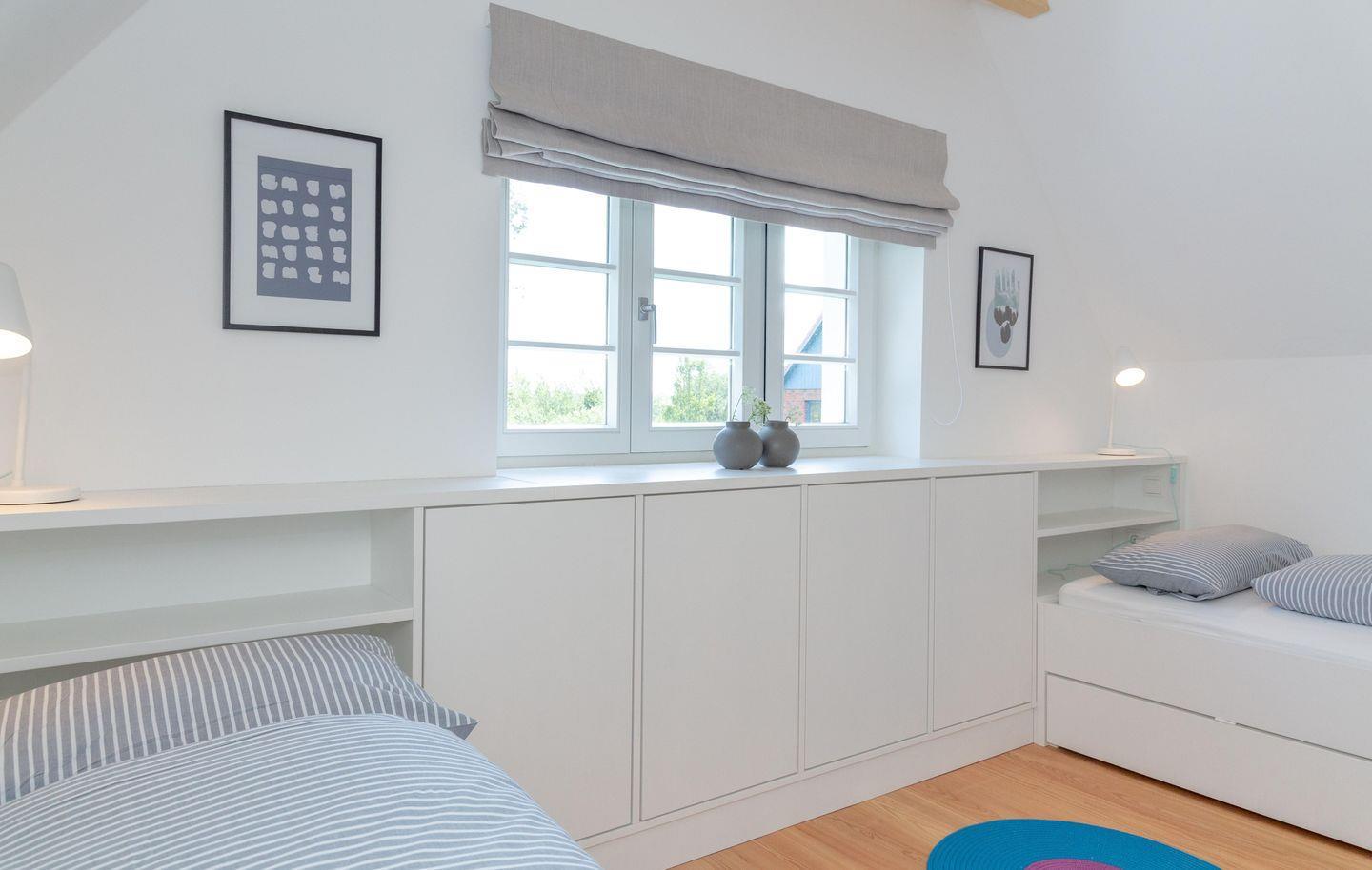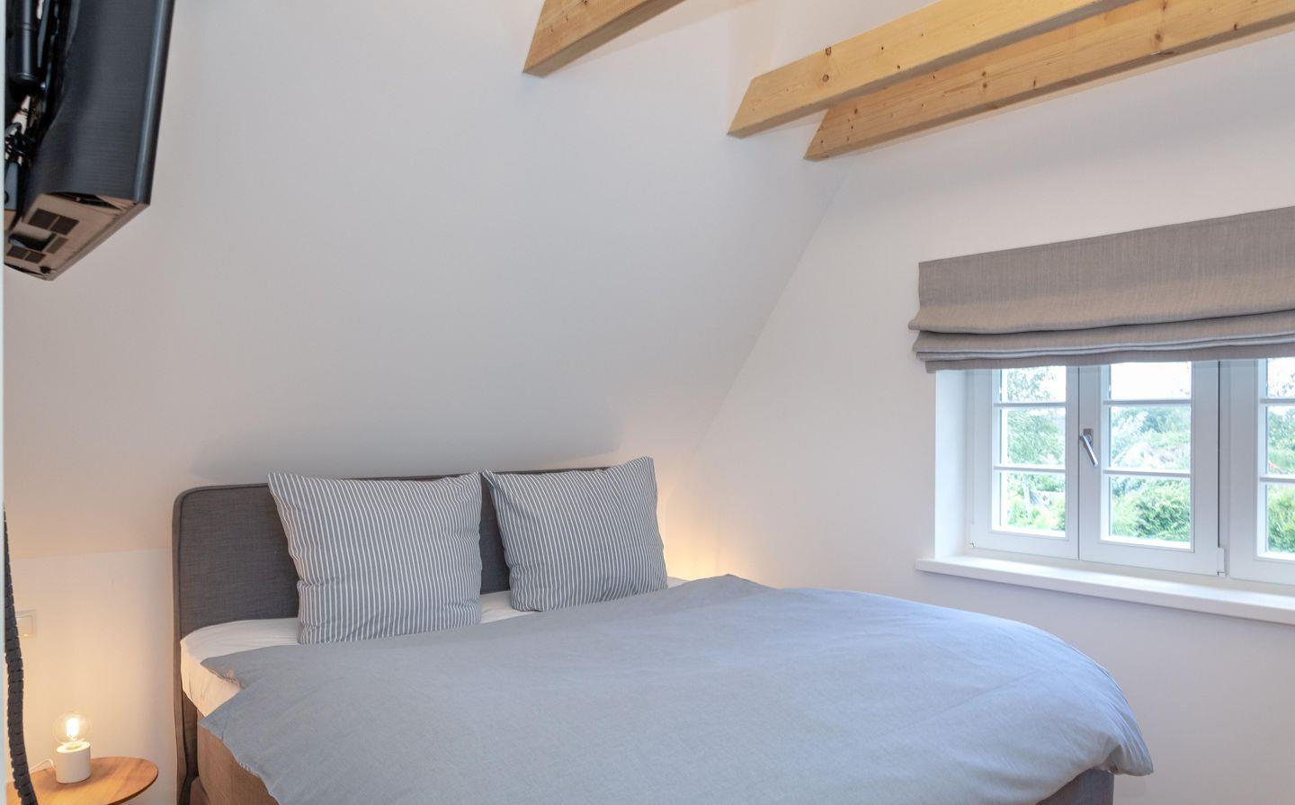 Die drei Schlafzimmer des Ferienhauses bieten ausreichend Platz und Komfort für bis zu 6 Personen. Im Obergeschoss erwartet Sie das Hauptschlafzimmer mit einem gemütlichen Boxspringbett (170x200 cm) und einem eigenen TV, ideal für erholsame Nächte. Ein weiteres Schlafzimmer ist mit zwei Einzelbetten (je 80x200 cm) ausgestattet und eignet sich perfekt für Kinder oder Begleitpersonen. Das dritte Schlafzimmer bietet ein Doppelbett (140x200 cm), einen kleinen Arbeitsplatz und einen direkten Zugang zum Garten – der ideale Rückzugsort, um Ruhe und Natur zu genießen.