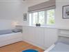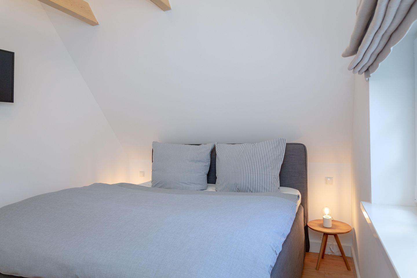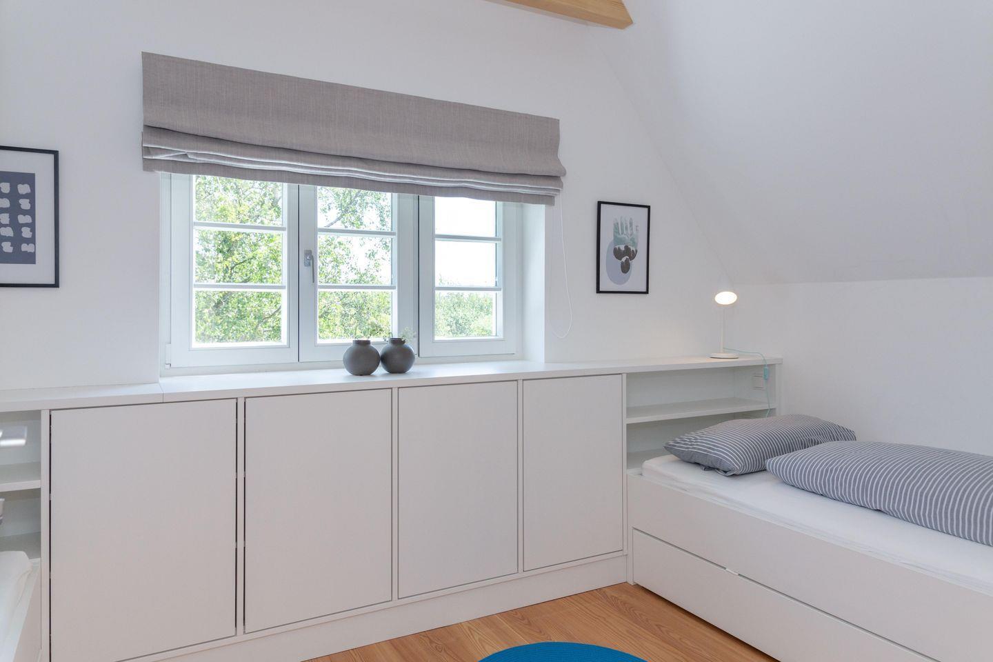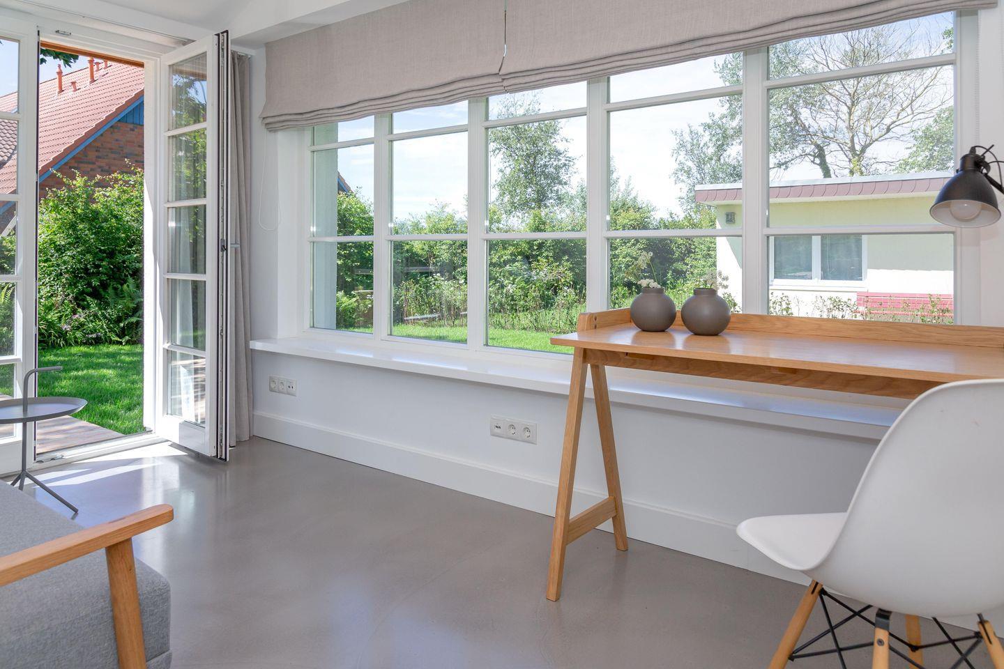 Die drei Schlafzimmer des Ferienhauses bieten ausreichend Platz und Komfort für bis zu 6 Personen. Im Obergeschoss erwartet Sie das Hauptschlafzimmer mit einem gemütlichen Boxspringbett (170x200 cm) und einem eigenen TV, ideal für erholsame Nächte. Ein weiteres Schlafzimmer ist mit zwei Einzelbetten (je 80x200 cm) ausgestattet und eignet sich perfekt für Kinder oder Begleitpersonen. Das dritte Schlafzimmer bietet ein Doppelbett (140x200 cm), einen kleinen Arbeitsplatz und einen direkten Zugang zum Garten – der ideale Rückzugsort, um Ruhe und Natur zu genießen.