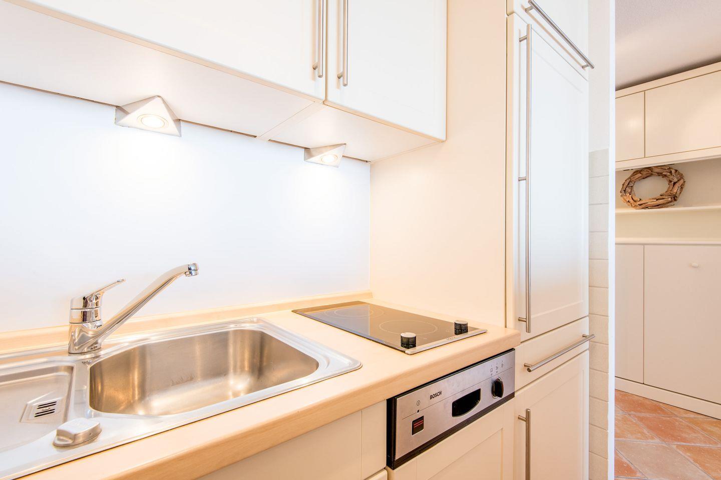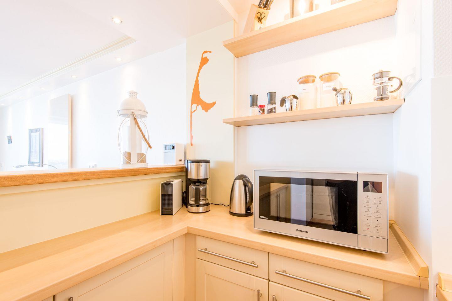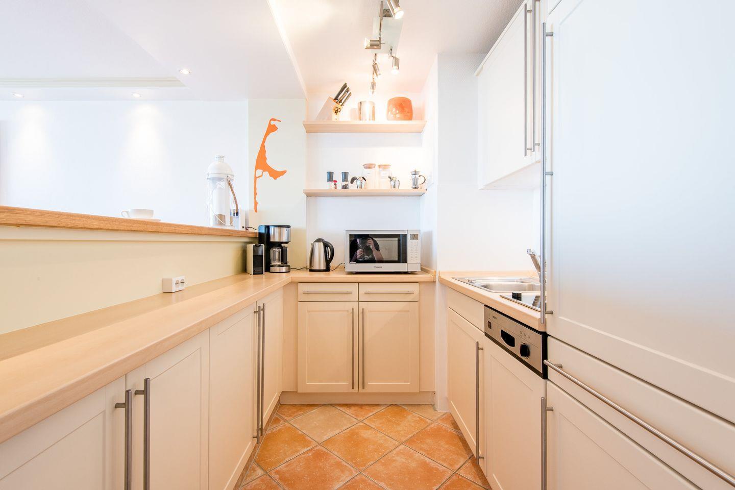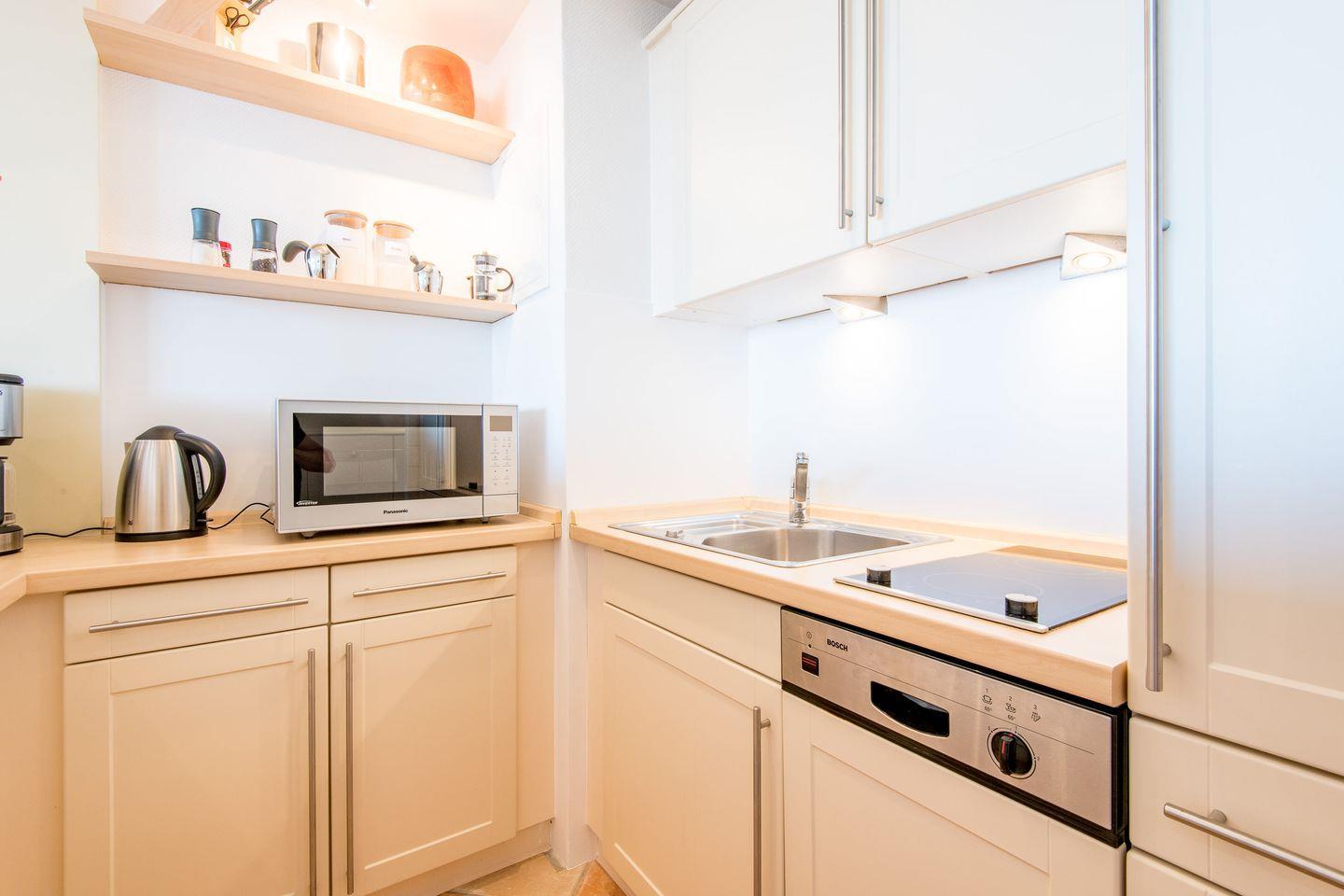 Die offene Küche ist voll ausgestattet und verfügt über ein Cerankochfeld, eine Mikrowelle, einen Geschirrspüler und alle notwendigen Küchenutensilien, um Ihnen einen komfortablen Aufenthalt zu ermöglichen.