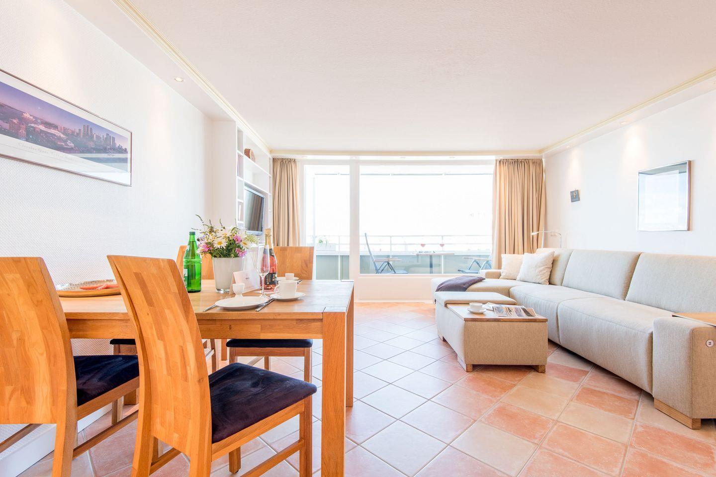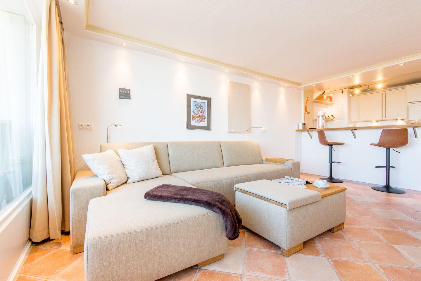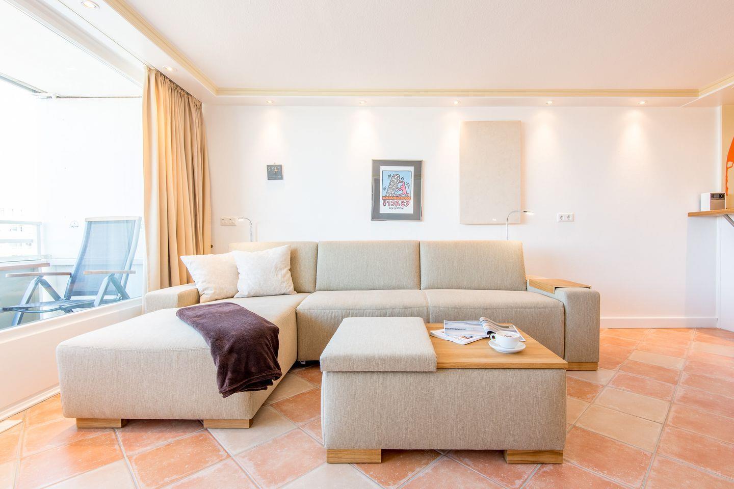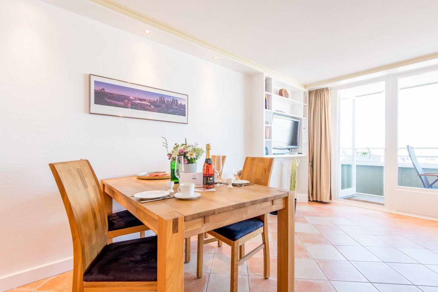 Der großzügige Wohn-/Schlafbereich ist mit einem bequemen Schlafsofa (160x200 cm) und einem TV ausgestattet. Ein Essbereich für 2 Personen lädt zu entspannten Mahlzeiten ein. Vom Wohnbereich haben Sie direkten Zugang zum möblierten Süd-/West-Balkon, von dem Sie einen einzigartigen Ausblick über die Dächer von Westerland bis hin zum Meer genießen können.