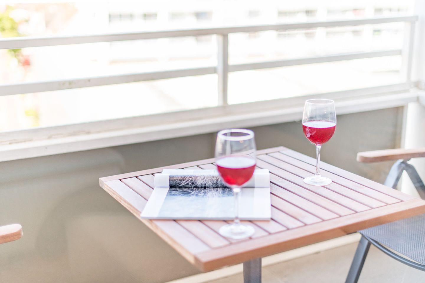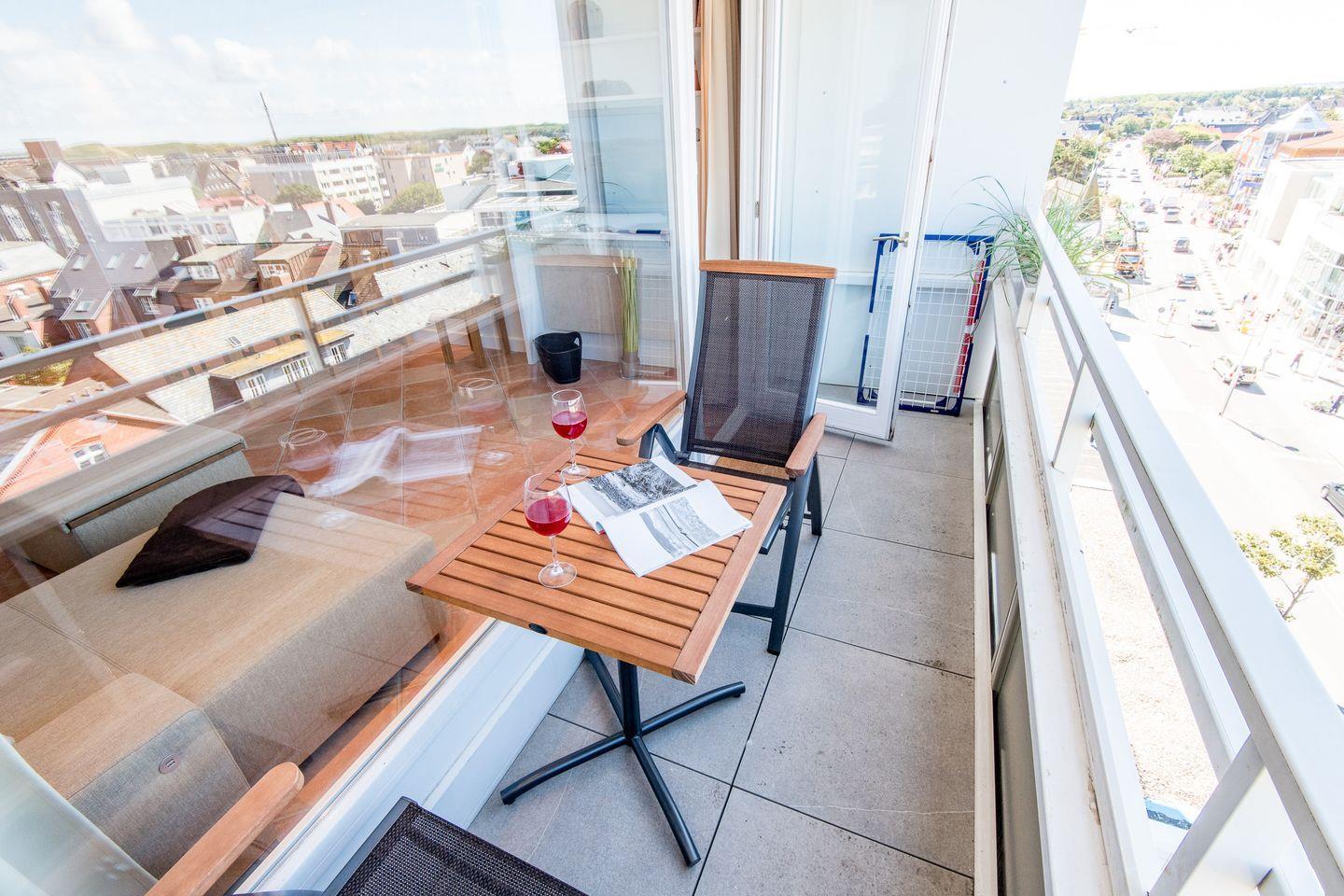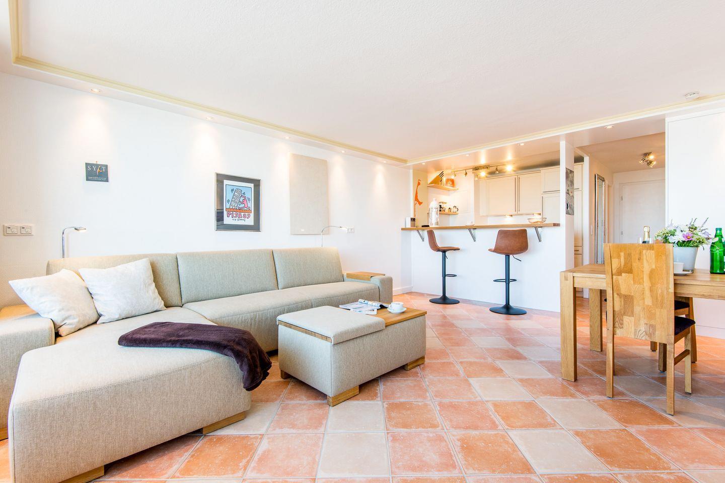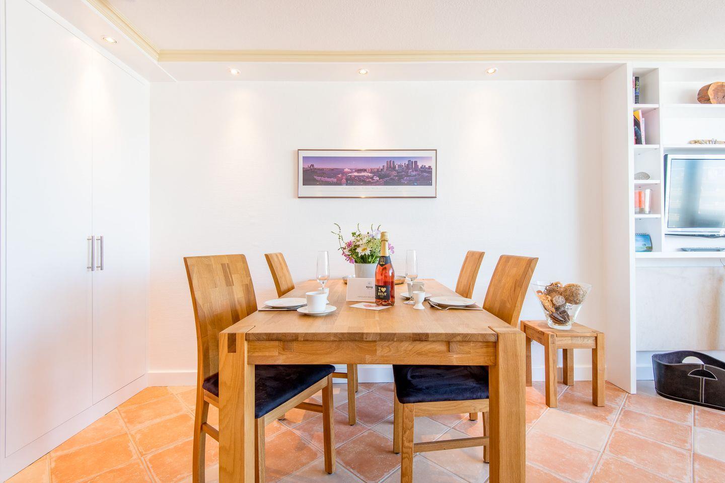 Der großzügige Wohn-/Schlafbereich ist mit einem bequemen Schlafsofa (160x200 cm) und einem TV ausgestattet. Ein Essbereich für 2 Personen lädt zu entspannten Mahlzeiten ein. Vom Wohnbereich haben Sie direkten Zugang zum möblierten Süd-/West-Balkon, von dem Sie einen einzigartigen Ausblick über die Dächer von Westerland bis hin zum Meer genießen können.