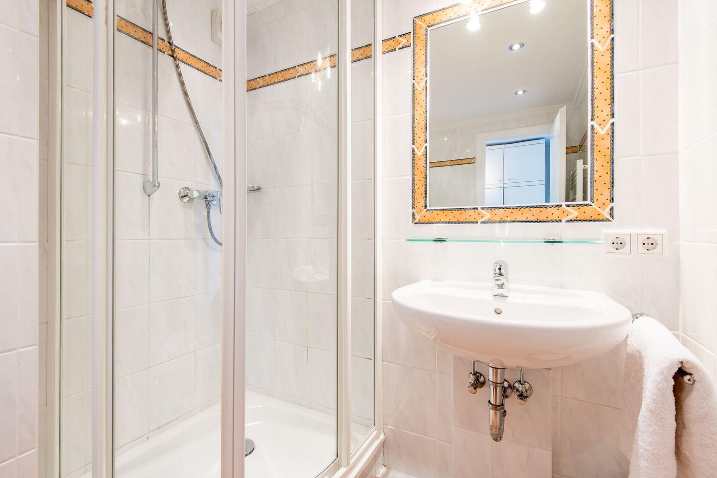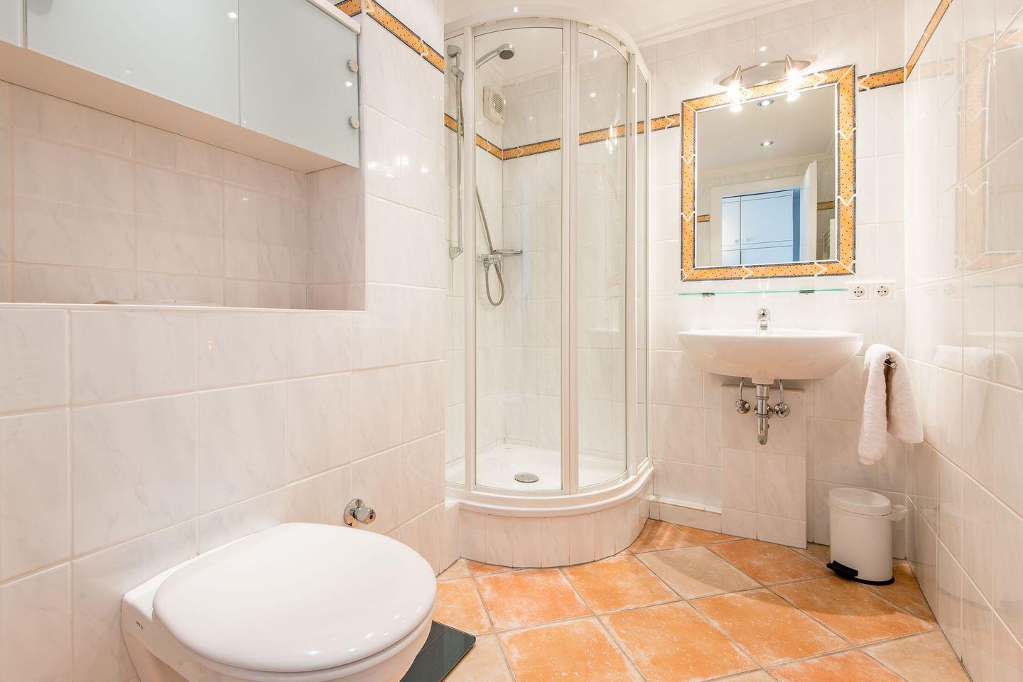 Das moderne Badezimmer ist mit einer Dusche, einem WC, einem Handtuchwärmer und einem Föhn ausgestattet.