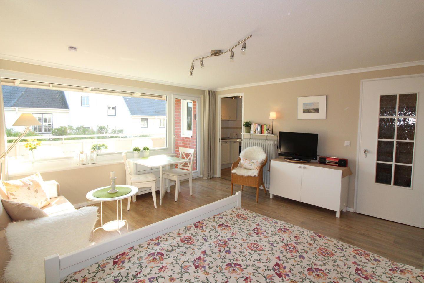 Dieses etwa 35 qm große 1-Zimmer-Appartement liegt in der 1. Etage mit Ausrichtung nach Osten und ist ideal für bis zu 2 Personen. Es bietet folgende Ausstattung:
