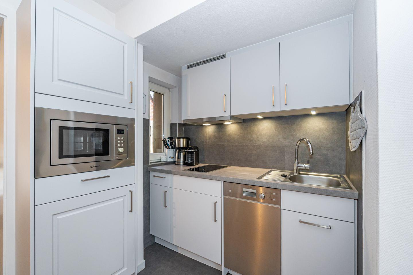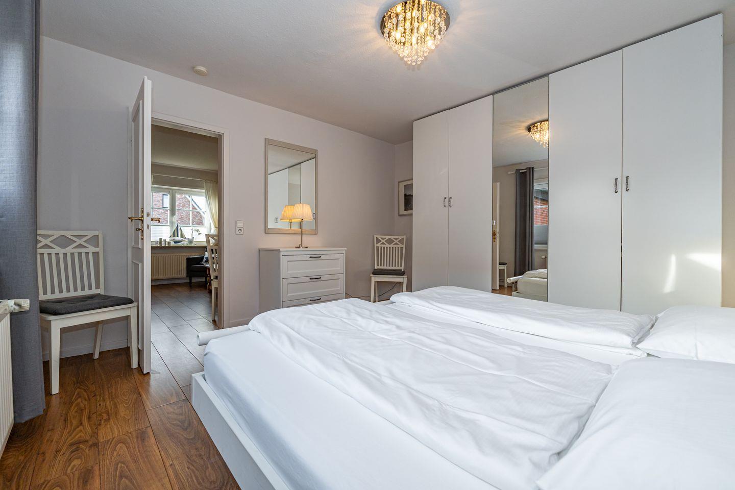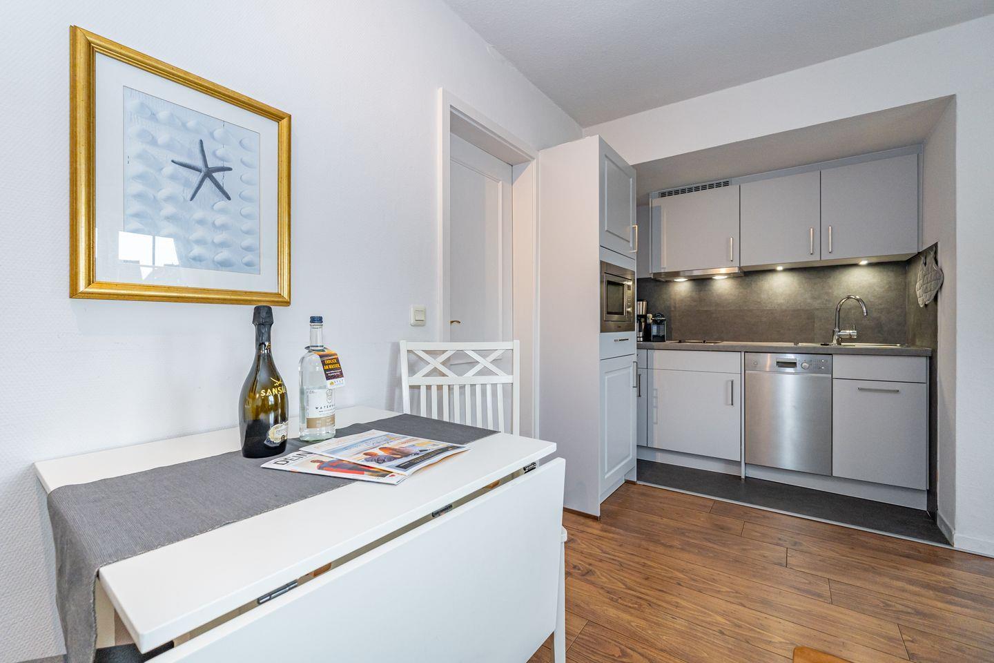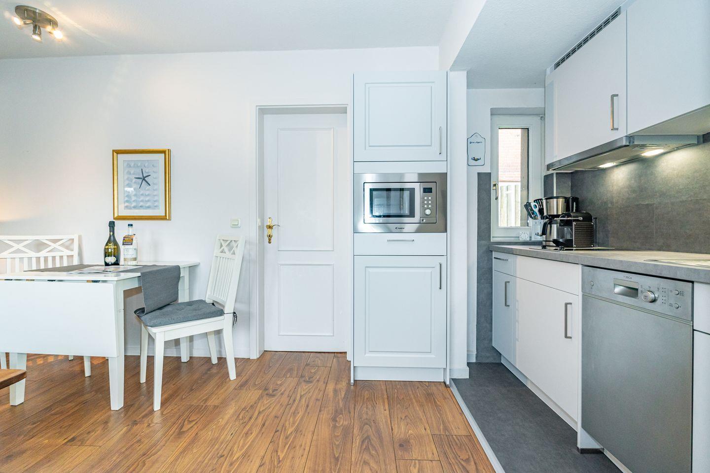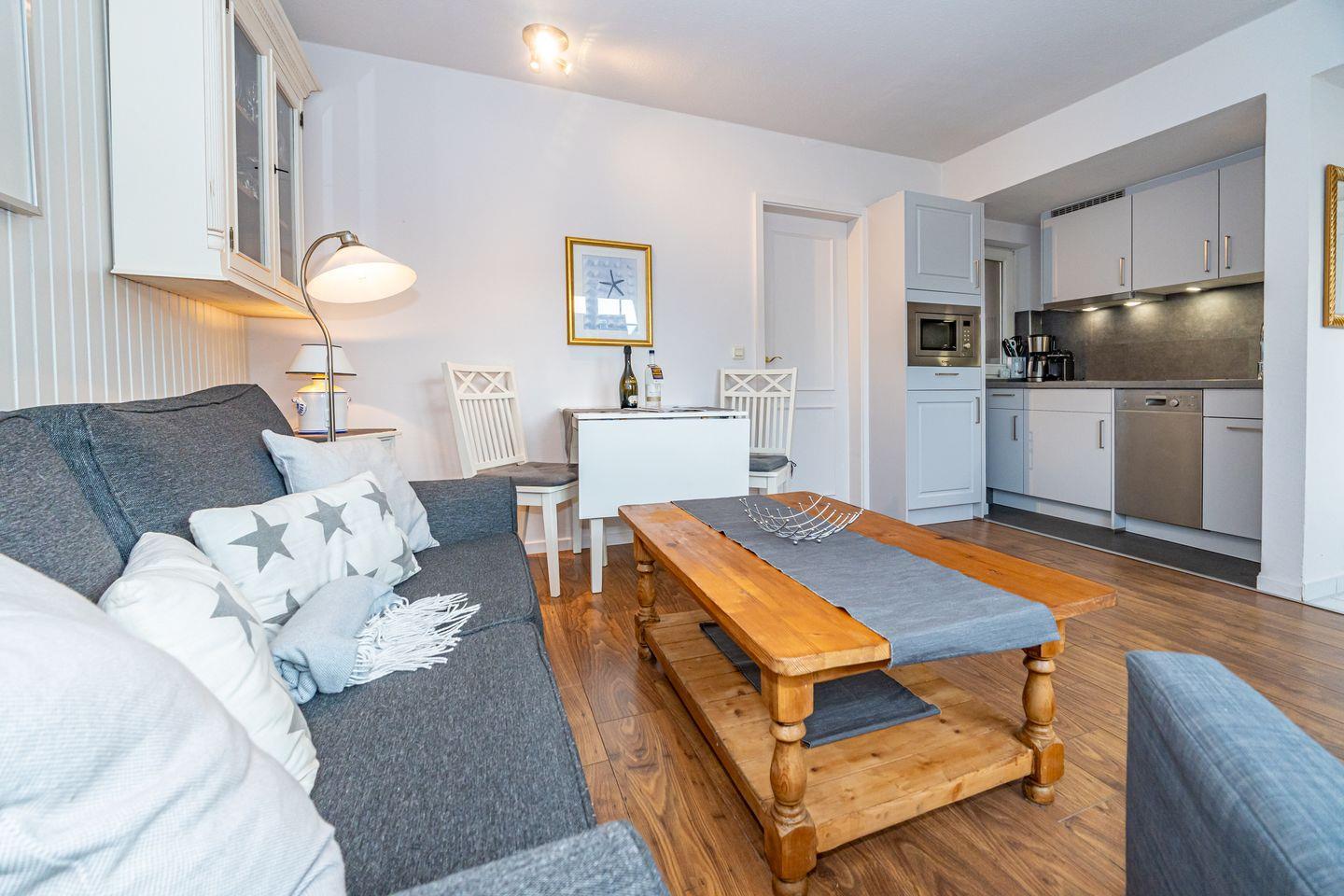 Die Ferienwohnung 3 im Haus Strandberg verfügt über einen Flur, über den man rechts in das Duschbad mit WC und links in den Wohnbereich mit offener Küche (Mikrowelle, Geschirrspüler, Kaffeemaschine, Nespressomaschine) und einem Essbereich gelangt. Das gemütlich eingerichtete offene Wohnzimmer ist mit einem Sofa und einem Fernseher ausgestattet. Das Schlafzimmer mit Doppelbett verfügt über einen geräumigen Kleiderschrank und ist über das Wohnzimmer erreichbar. Im Sommer stehen Ihnen 2 Strandkörbe zum Sonnenbaden im Gemeinschaftsgarten zur Verfügung. Der Garten kann von allen drei Parteien des Hauses genutzt werden.
