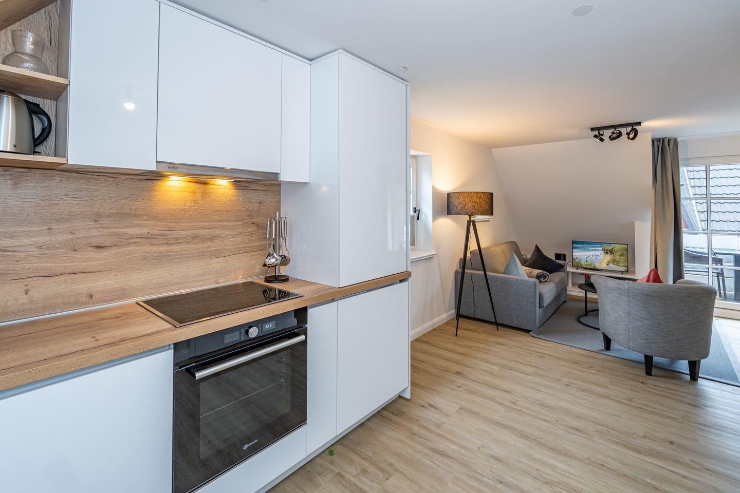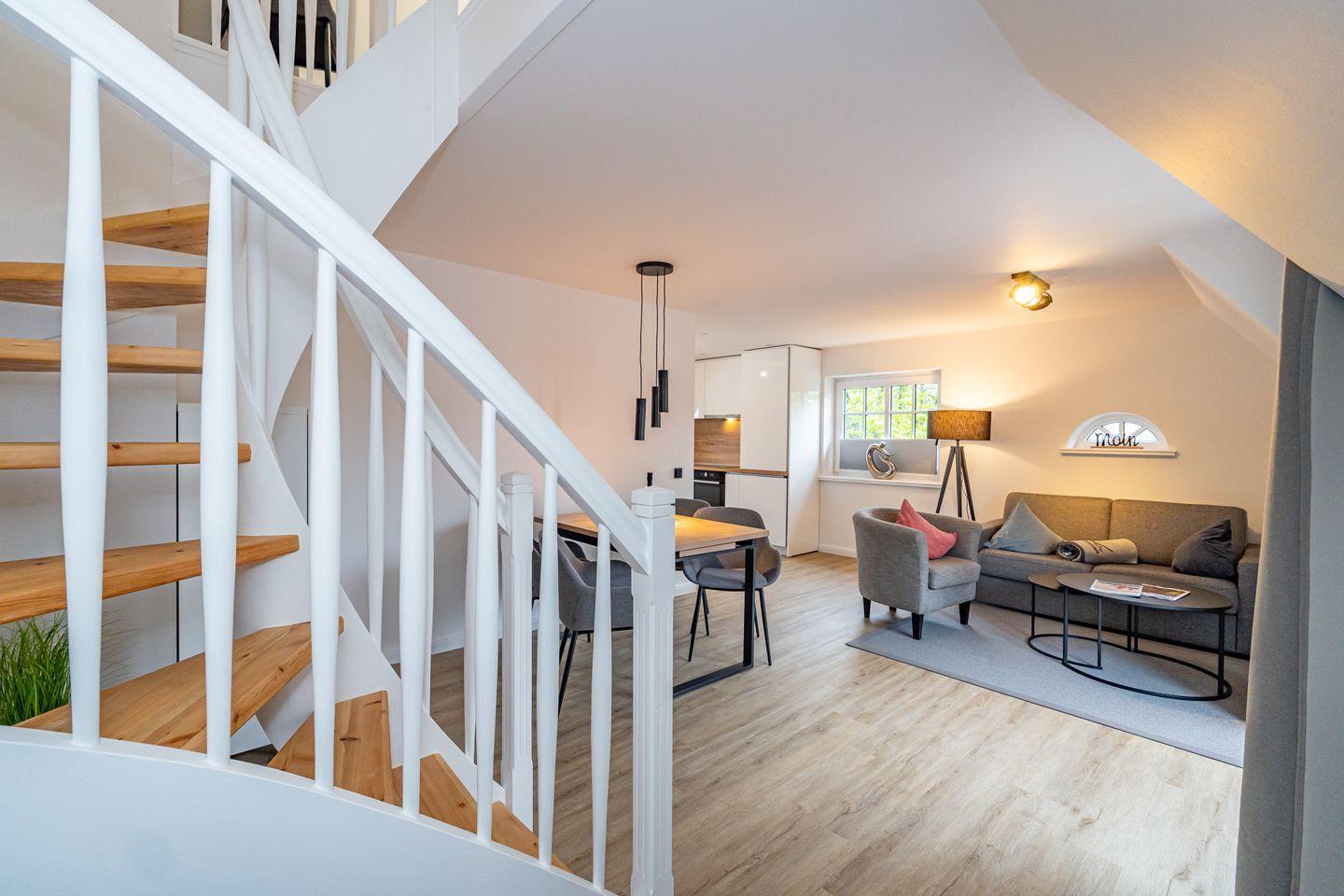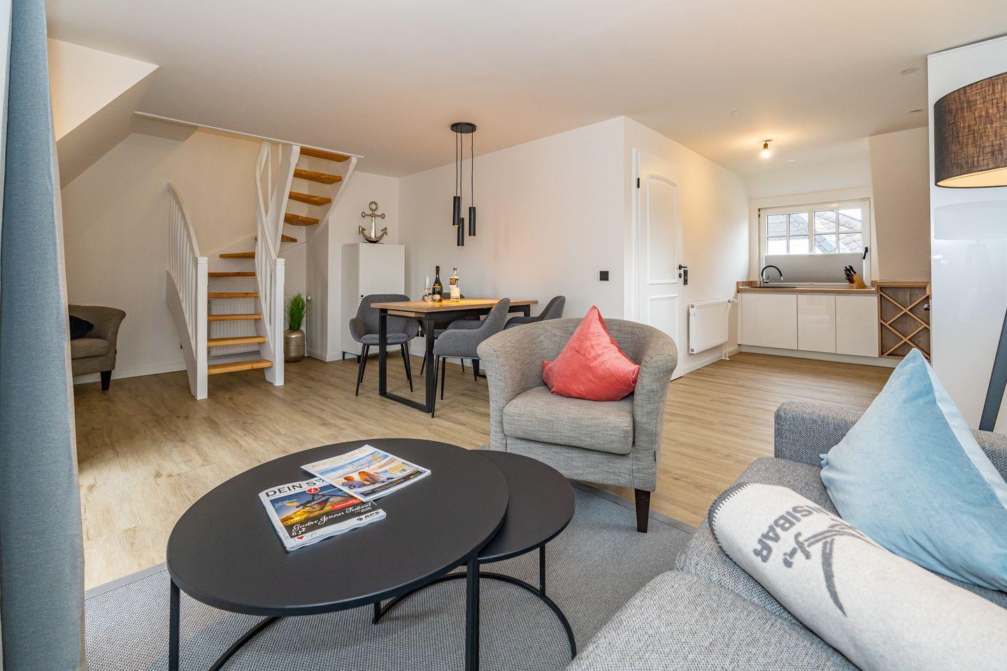 Im OG befinden sich die offen gestaltete Küche mit angrenzendem Essbereich, das Wohnzimmer und ein großzügiges Duschbad mit WC. Die Ausstattung (Backofen, Spülmaschine, Cerankochfeld, Kaffeemaschine, Nespresso Maschine, Wasserkocher und Toaster) der hochwertigen Küche lässt keine Wünsche offen. Vom Wohnzimmer haben Sie den Zugang zu dem Balkon. Eine Schlafcouch im Wohnzimmer bietet eine weitere Schlafmöglichkeiten. Im Wohnzimmer steht Ihnen ein Flachbildfernseher zur Verfügung. Im DG befindet sich das offen gestaltete Schlafzimmer mit einem Doppelbett und Fernseher.