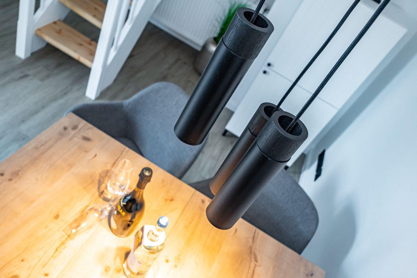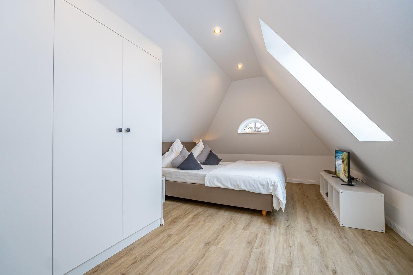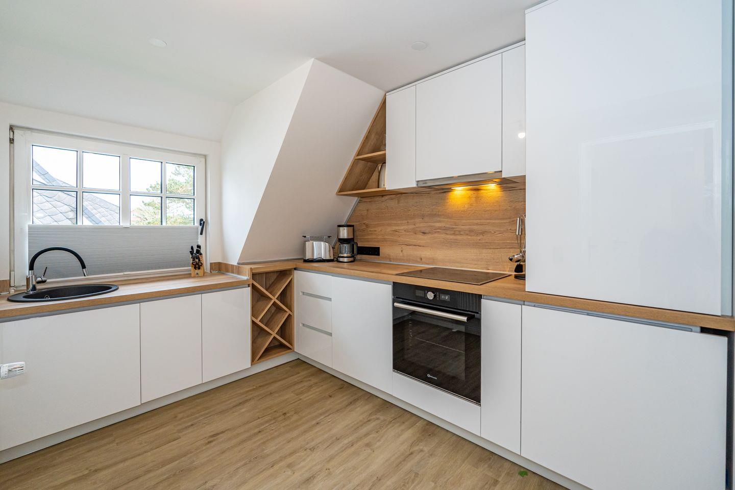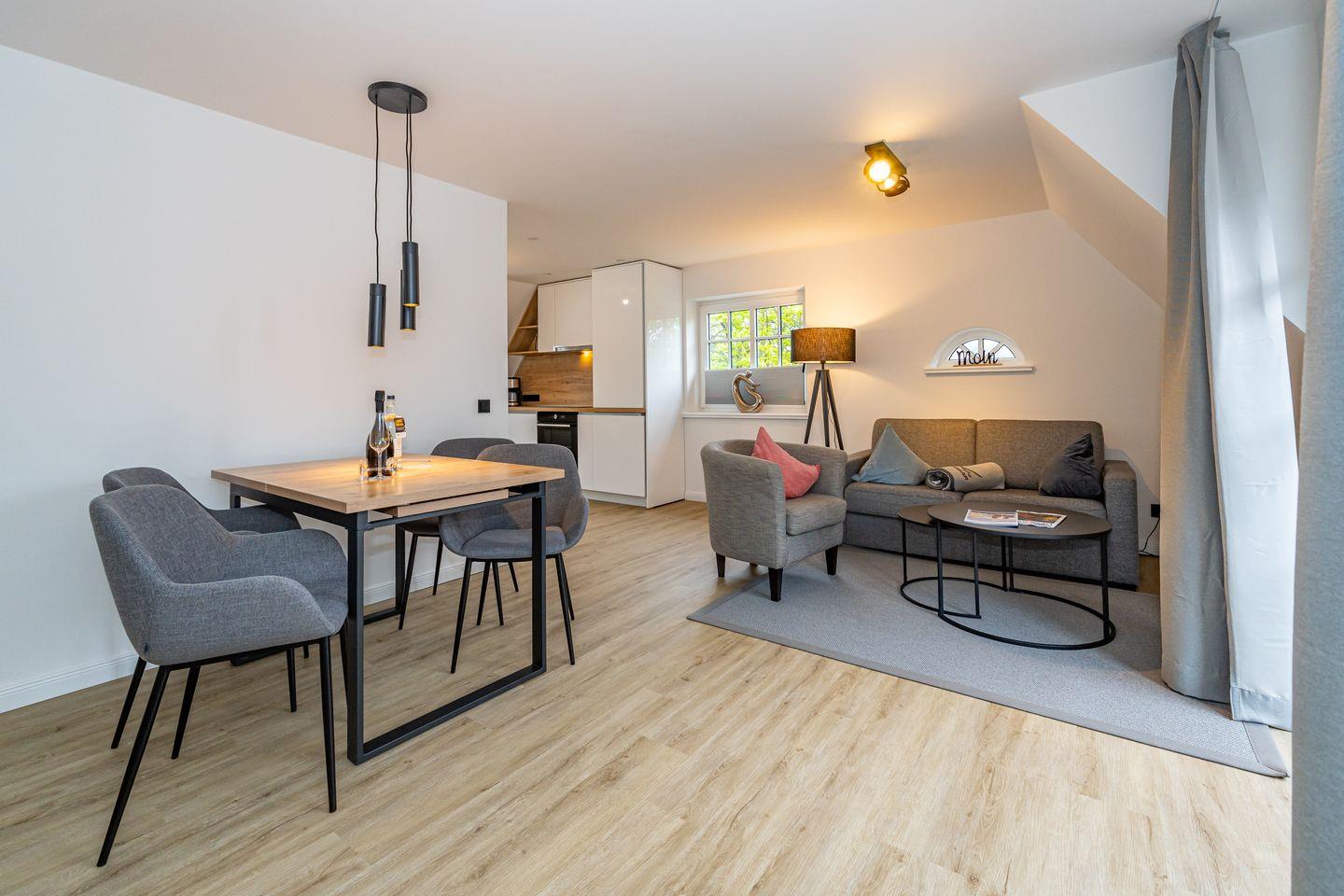 Im OG befinden sich die offen gestaltete Küche mit angrenzendem Essbereich, das Wohnzimmer und ein großzügiges Duschbad mit WC. Die Ausstattung (Backofen, Spülmaschine, Cerankochfeld, Kaffeemaschine, Nespresso Maschine, Wasserkocher und Toaster) der hochwertigen Küche lässt keine Wünsche offen. Vom Wohnzimmer haben Sie den Zugang zu dem Balkon. Eine Schlafcouch im Wohnzimmer bietet eine weitere Schlafmöglichkeiten. Im Wohnzimmer steht Ihnen ein Flachbildfernseher zur Verfügung. Im DG befindet sich das offen gestaltete Schlafzimmer mit einem Doppelbett und Fernseher.
