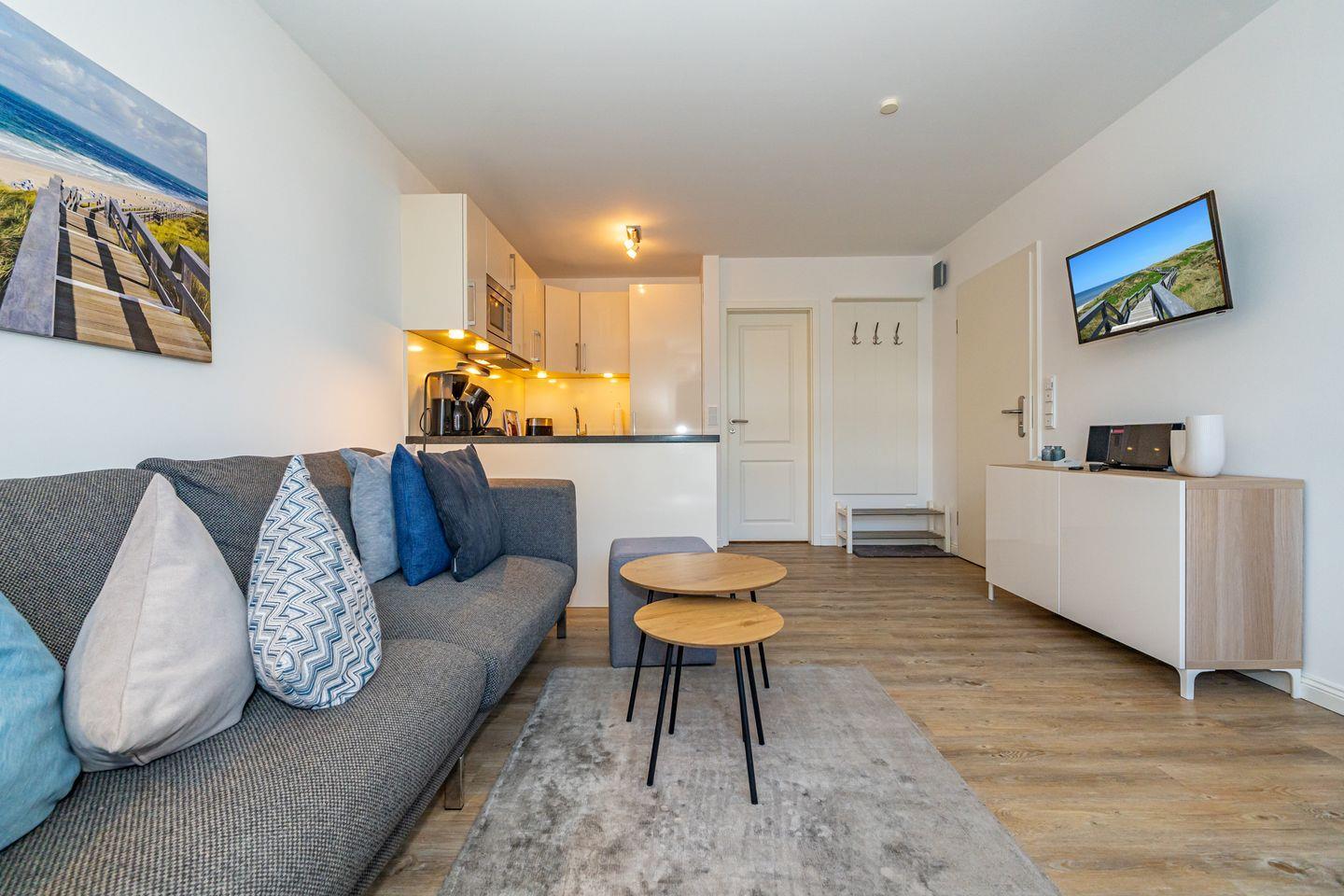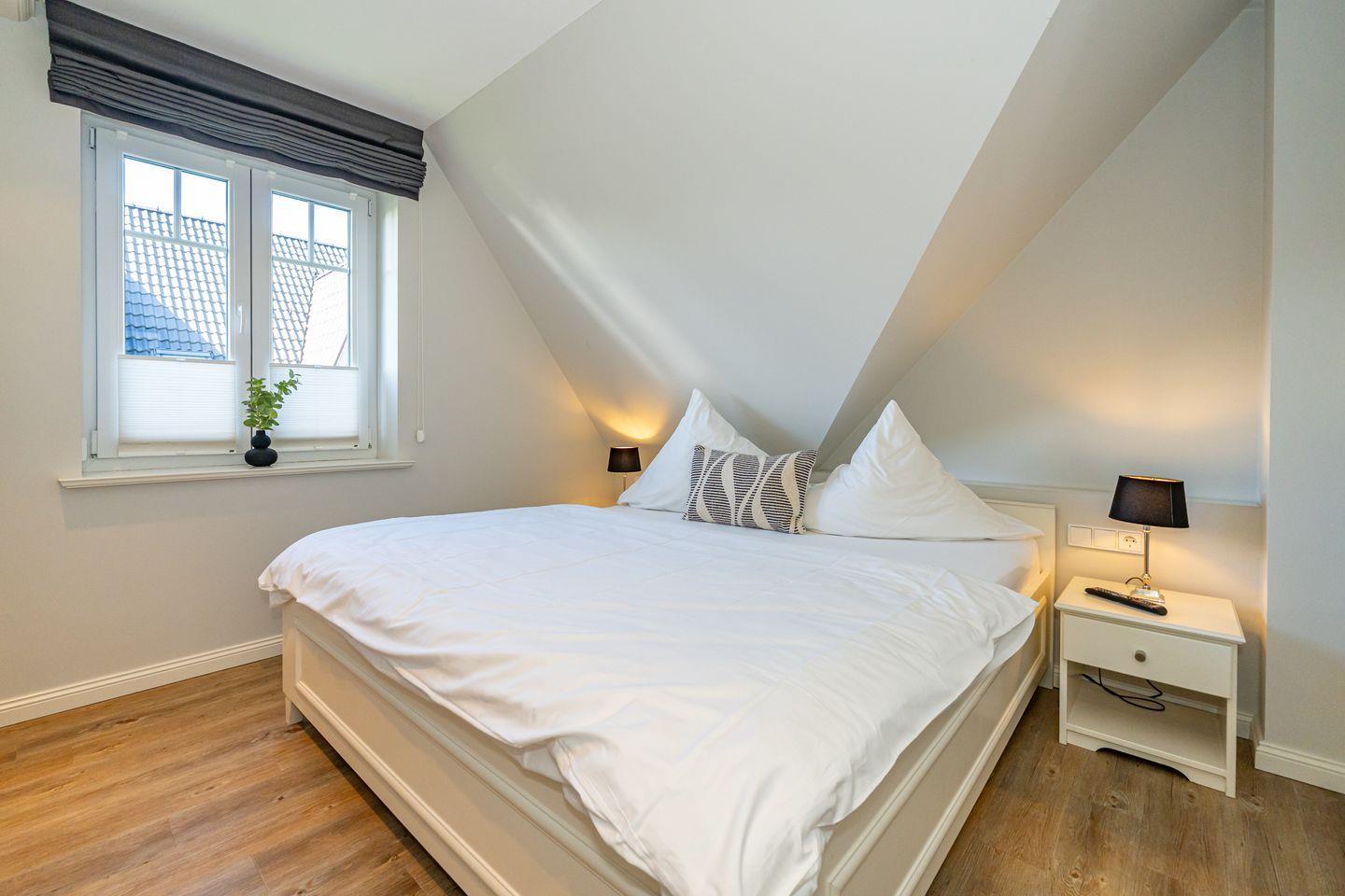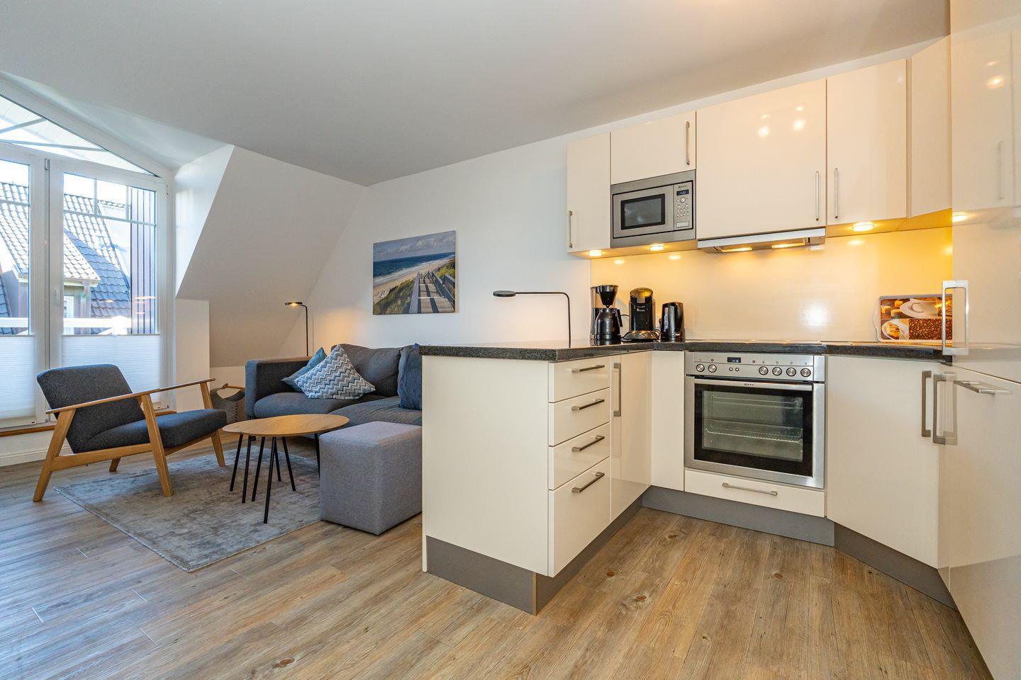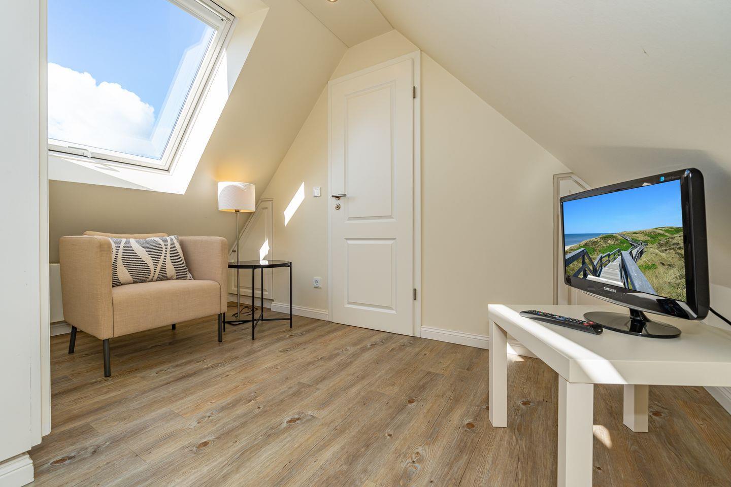 Diese 3-Zimmer-Ferienwohnung (ca. 77 qm) in einem kleinen Ferienhaus mit sechs Wohneinheiten liegt an der Ortsgrenze von Westerland zu Wenningstedt. Ein Bäcker, ein Lebensmittelgeschäft, ein Fahrradverleih und eine Bushaltestelle sind fußläufig sehr gut zu erreichen. Im 1 OG erwartet Sie ein moderner Wohn- / Essbereich mit TV von wo Sie Zugang zum Westbalkon haben, wo Sie auch noch am Nachmittag die Sonne genießen können. Ein Schlafzimmer mit gemütlichen Doppelbett (180 x 200 cm) und ein Badezimmer mit Wanne, Dusche, WC und Waschtrockner befinden sich ebenfalls auf dieser Ebene, genauso wie die moderne, offene Küche. Über eine Treppe gelangen Sie in das Dachgeschoss. Dort befindet sich das zweite Schlafzimmer mit Kojenbett (160 x 200 cm) und das angrenzende, kleine Badezimmer mit WC und Waschtisch. Beide Schlafzimmer verfügen über einen Fernseher. In der Ferienwohnung sind hochwertige, weiße Tischlereinbauten vorhanden für viel Stauraum. Ein Pkw-Stellplatz befindet sich am Haus. Tiere sind in dieser Ferienwohnung nicht erlaubt.