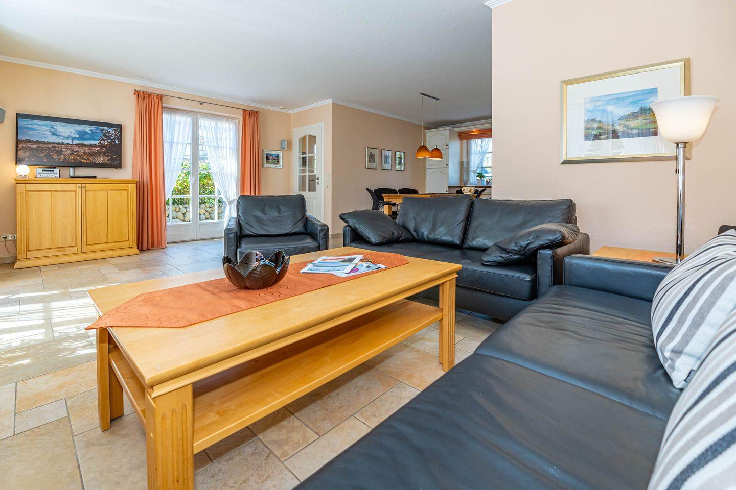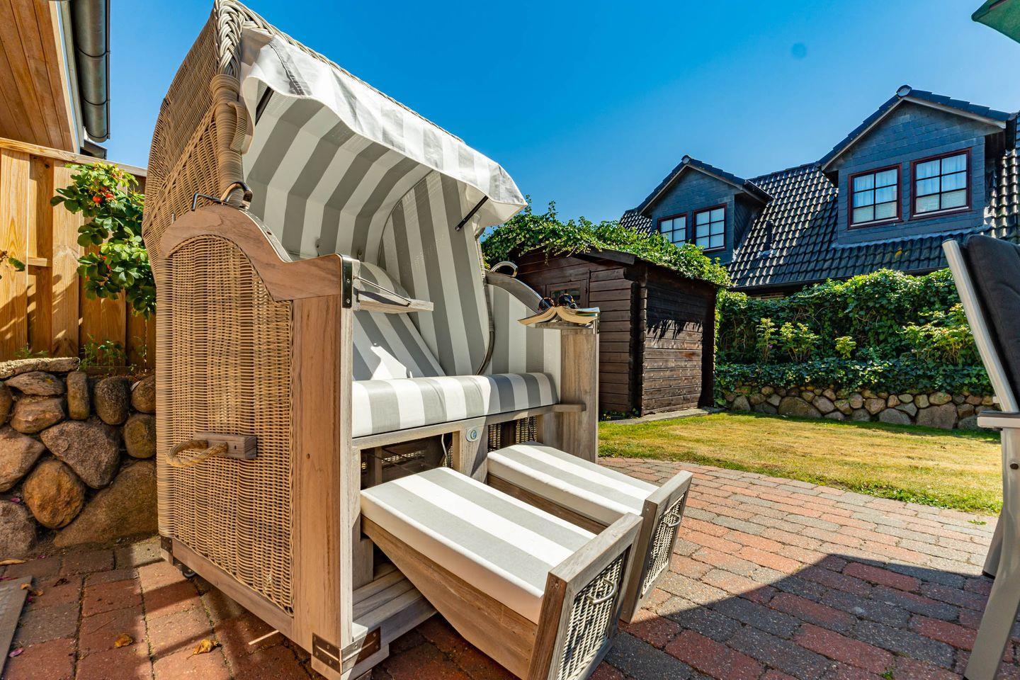 Hineingetreten in das Erdgeschoss, mit Gäste WC, präsentiert sich der lichtdurchflutete, großzügige Wohnraum (Flachbildschirm, Blue-Ray-Player, Stereoanlage, CD-Player) mit hochwertiger Leder-Couchgarnitur und großem Essbereich. Daran grenzt eine offene, komplett ausgestatteter Küche (Ceranfeld, Backofen, Mikrowelle, Espressomaschine (Nespresso), Filtermaschine, Geschirrspülmaschine, Kühlschrank (mit Tiefkühlfach) in der es Ihnen an nichts fehlt. Von hier aus haben Sie Zugang zur möblierten Terrasse mit klassischem Sylter Strandkorb und Gartenanteil mit einem festen Holzkohlegrill. Über eine Treppe gelangen Sie in das Untergeschoss mit den beiden Doppelschlafzimmern (1x 200x200 cm / 1x 180x200 cm), jeweils mit Zugang zum eigenen Badezimmer Duschbad. In den Bädern und in der Küche ist eine Fußbodenheizung verbaut. Eine Waschmaschine und ein Trockner gehören neben Bügelbrett und Bügeleisen zur Ausstattung der Wohnung. Bitte beachten Sie, dass diese Ferienwohnung eine Nichtraucherwohnung ist und die Haustierhaltung nicht gestattet ist. Ein Pkw-Stellplatz ist am Ferienhaus verfügbar.