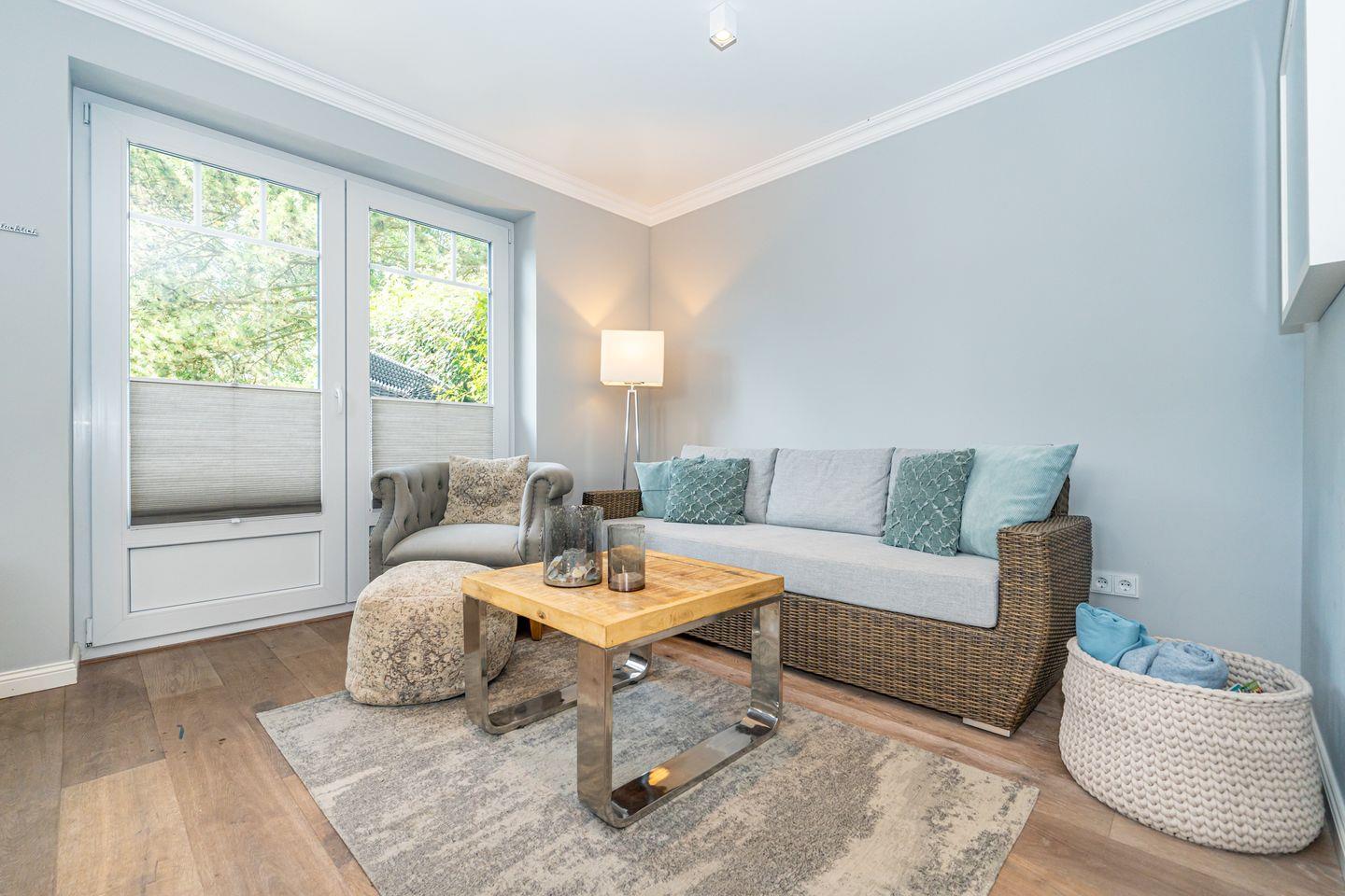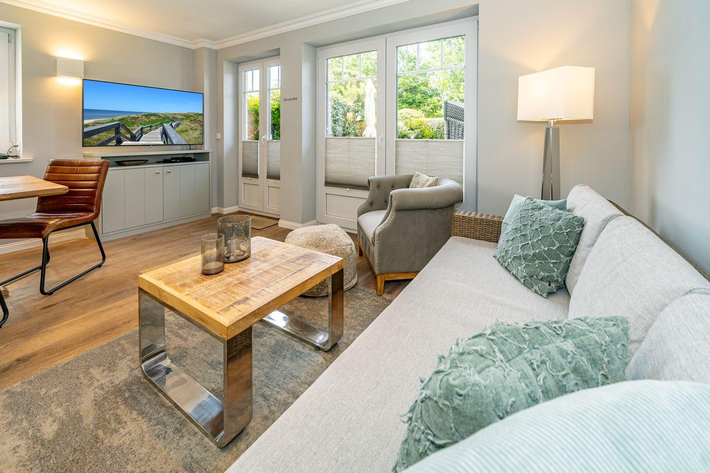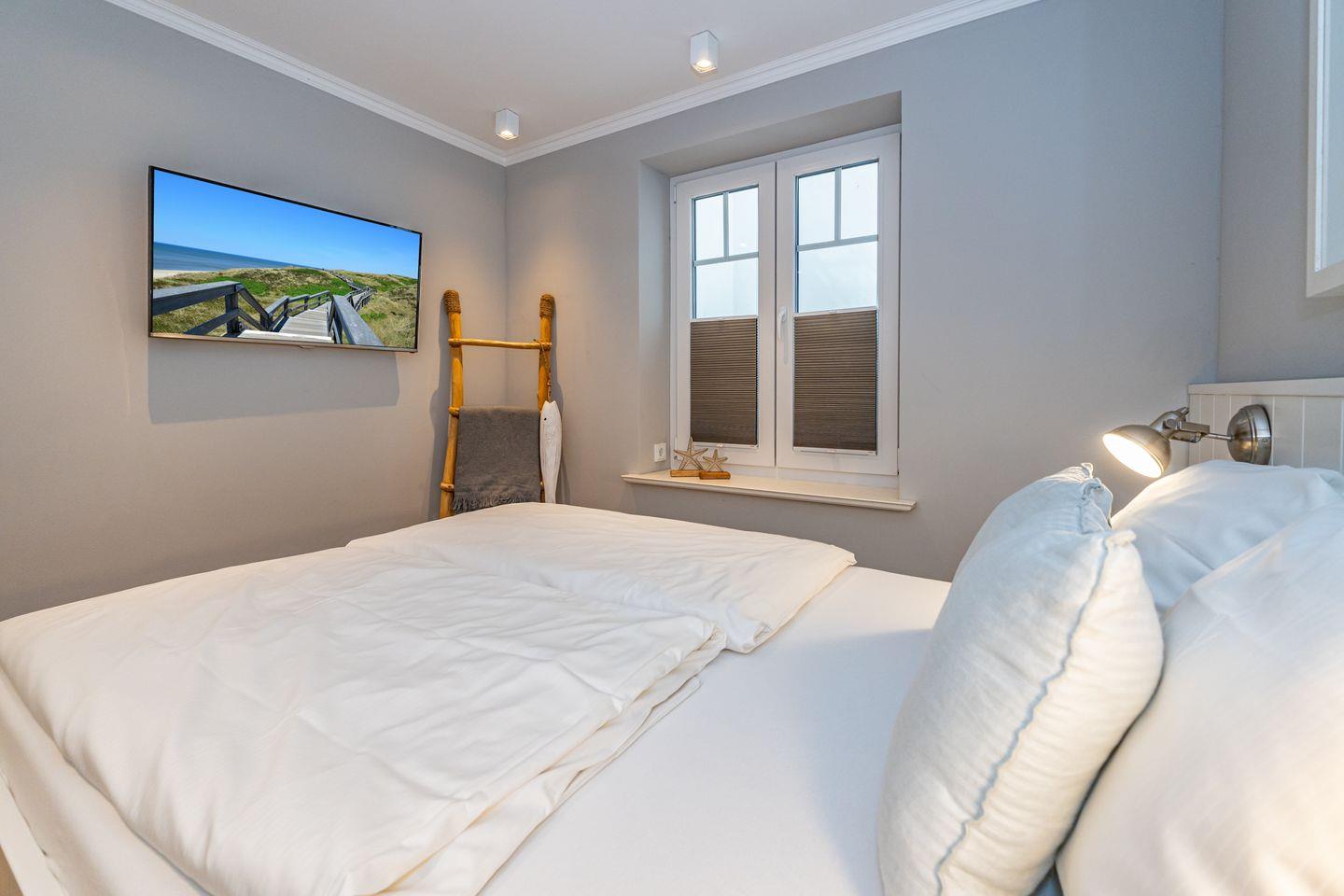 Die 3- Zimmer- Ferienwohnung (Endteil) (ca. 76 qm) in einem kleinen Ferienhaus mit sechs Einheiten befindet sich im Süden von Westerland. Im Erdgeschoss erwartet Sie ein gemütlicher Wohnbereich mit großem Flat-TV, Blue- Ray- Player und Wohlfühlsofa auf dem Sie Ihre Auszeit in vollen Zügen genießen können. Angrenzend daran befindet sich die vollausgestattete, hochwertige, offene Küchenzeile (Nespressomaschine, Kühlschrank mit Gefrierfach, Spülmaschine, Ceranfeld, Mikrowelle und Backofen) mit Essplatz. Auf dieser Ebene liegen zudem das Gäste-Bad mit bodengleicher Dusche und der Hauswirtschaftsraum mit Waschmaschine, Trockner, Garderobe und Schuhregal. In der Zeit von April bis Oktober stehen Ihnen hochwertige Gartenmöbel und ein Sylter Strandkorb zur Verfügung. Eine Etage tiefer, im Souterrain, befinden sich zwei Schlafzimmer mit unterschiedlich großen Einbaubetten: ein Doppelbett ist 180 x 200 cm groß, das andere Bett misst 140 x 200 cm. Beide Zimmer verfügen über einen Flatscreen, Leselampen und hochwertige, weiße Tischlereinbauschränke, die für genügend Stauraum sorgen. Ein weiteres Highlight in dieser Ferienwohnung ist die eigene Sauna mit großer Dusche und WC im Untergeschoss. Hier können Sie zu jeder Jahreszeit einen Saunagang genießen, um einfach mal abzuschalten. Die Lette Suite ist eine Nichtraucherwohnung und Ihren gut erzogenen, bis mittelgroßen Hund können Sie nach Anmeldung gerne mitbringen Ein guterzogener Hund ist nach vorheriger Anmeldung erlaubt (10,- € pro Tier/Tag). Bitte beachten Sie, dass wir keine Katzen aufnehmen können. Ein Pkw-Stellplatz ist am Haus verfügbar.