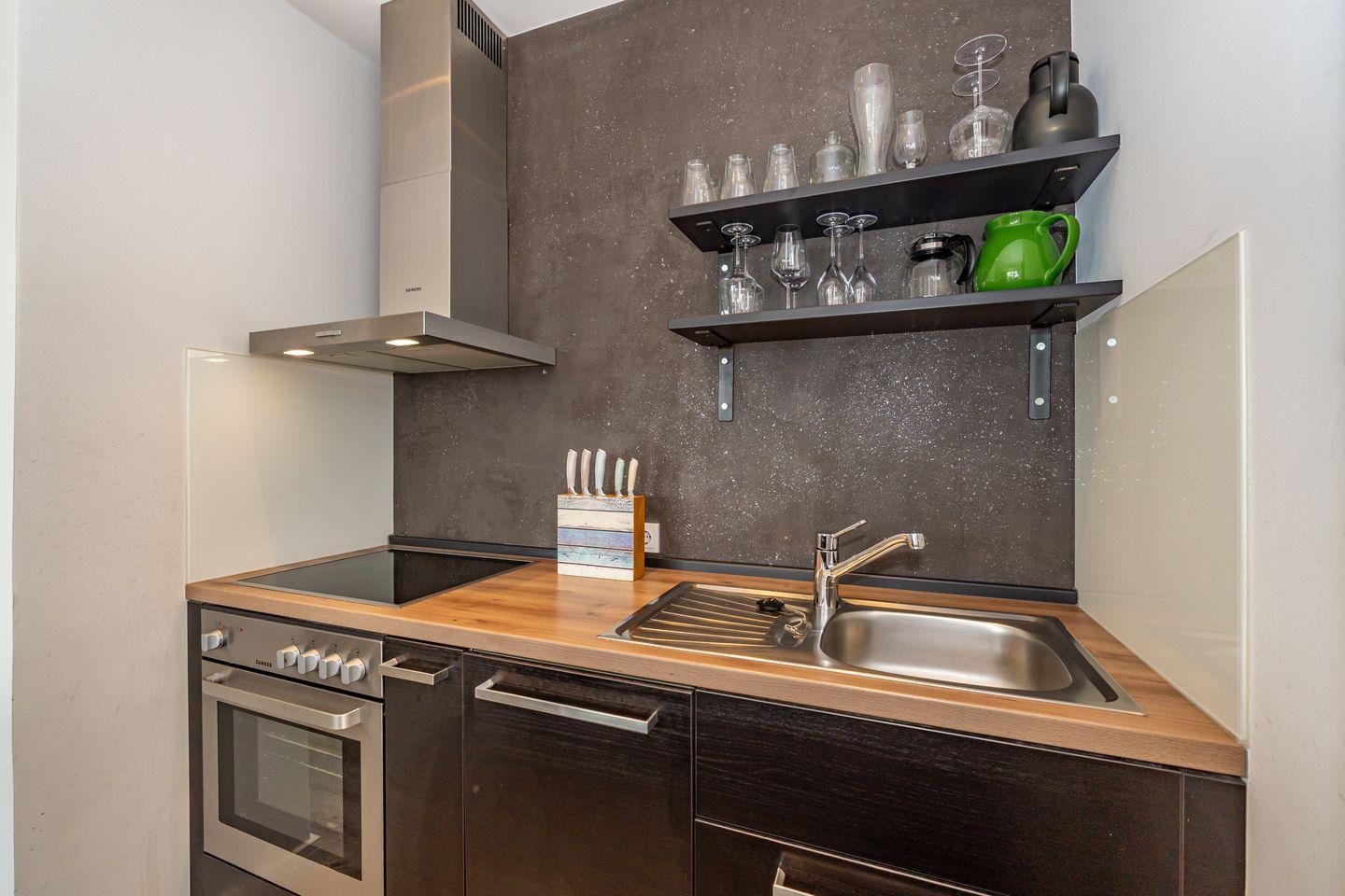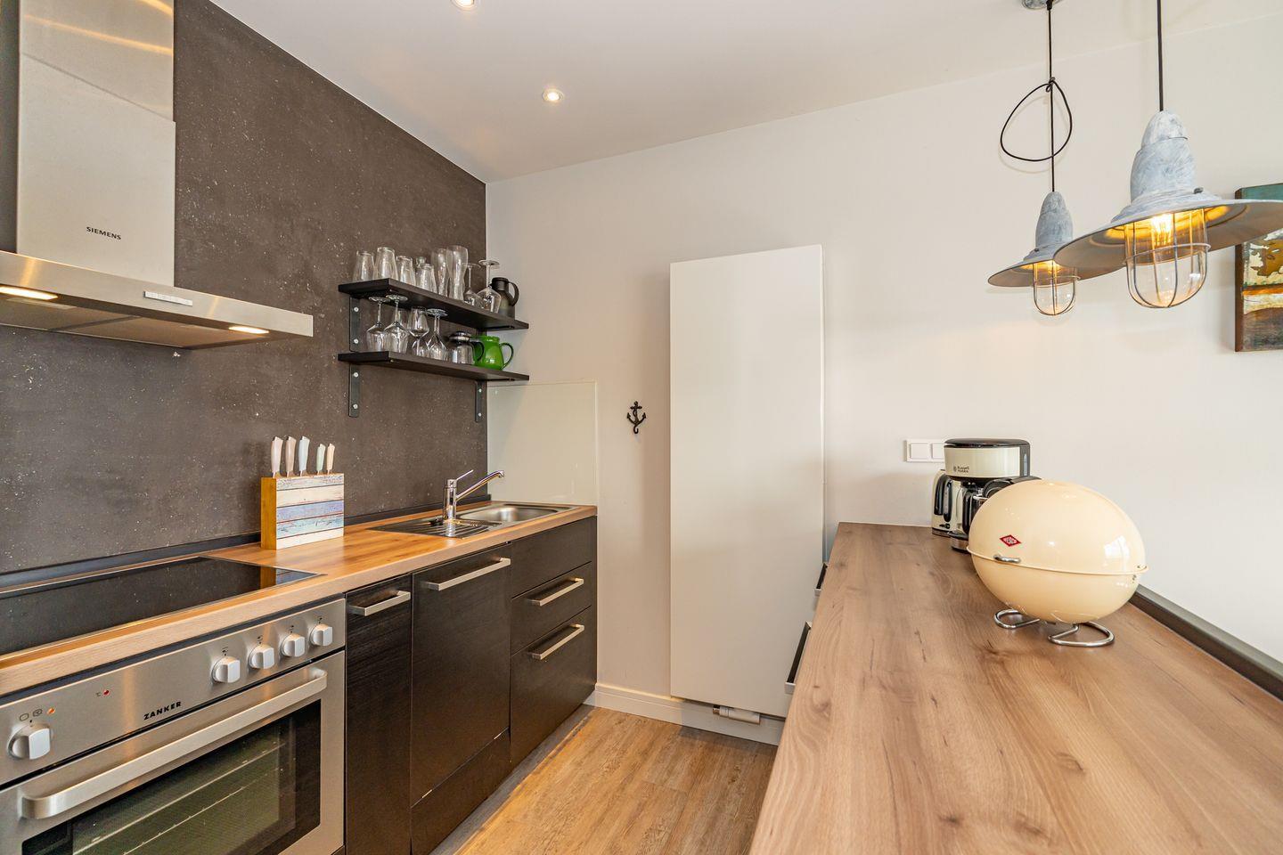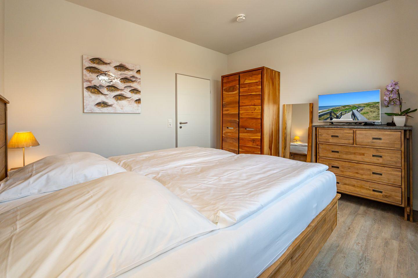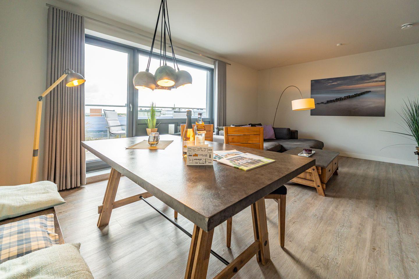 2- Zimmer Penthouse Ferienwohnung im Herzen von Westerland (65 qm) mit seitlichem Meerblick, über eine Ebene für bis zu 2 Personen. Sehr hochwertig und geschmackvoll eingerichtet. Ein stylisches Wohnzimmer mit Couch und Flatscreen., angrenzend ein einladender, offener Essbereich mit Esstisch, zwei Stühlen und eine Bank. Offene Küche mit Kapselkaffeeautomat, Geschirrspüler, Ceranfeld, Backofen und dem üblichen Komfort. Ein helles Schlafzimmer mit Doppelbett (2x 90x200cm), Kleiderschrank und TV. Badezimmer (Duschbad) mit Dusche, WC, Waschbecken, Handtuchwärmer und Föhn. Zur Wohnung gehört ein Tiefgaragenparkplatz, von hier aus erreichen Sie die Penthouse Ferienwohnung mit dem Fahrstuhl. Bitte beachten Sie, dass Haustiere in dieser Ferienwohnung nicht erlaubt sind und diese Ferienwohnung eine Nichtraucherwohnung ist. Vom Wohnbereich und vom Schlafzimmer haben Sie Zutritt zum Balkon mit Gartenmöbeln.