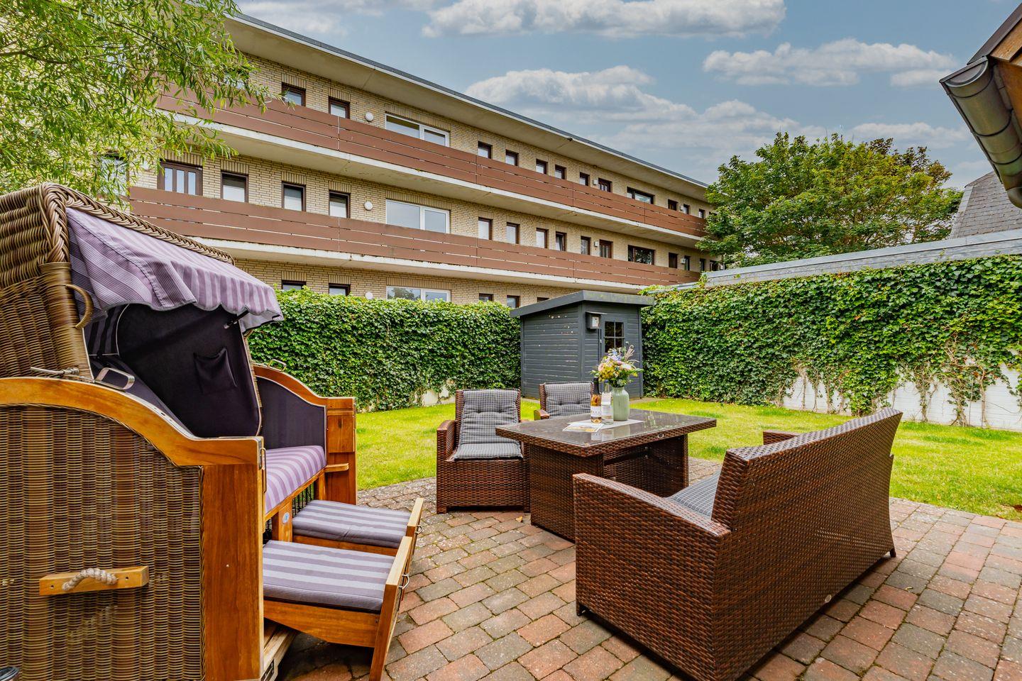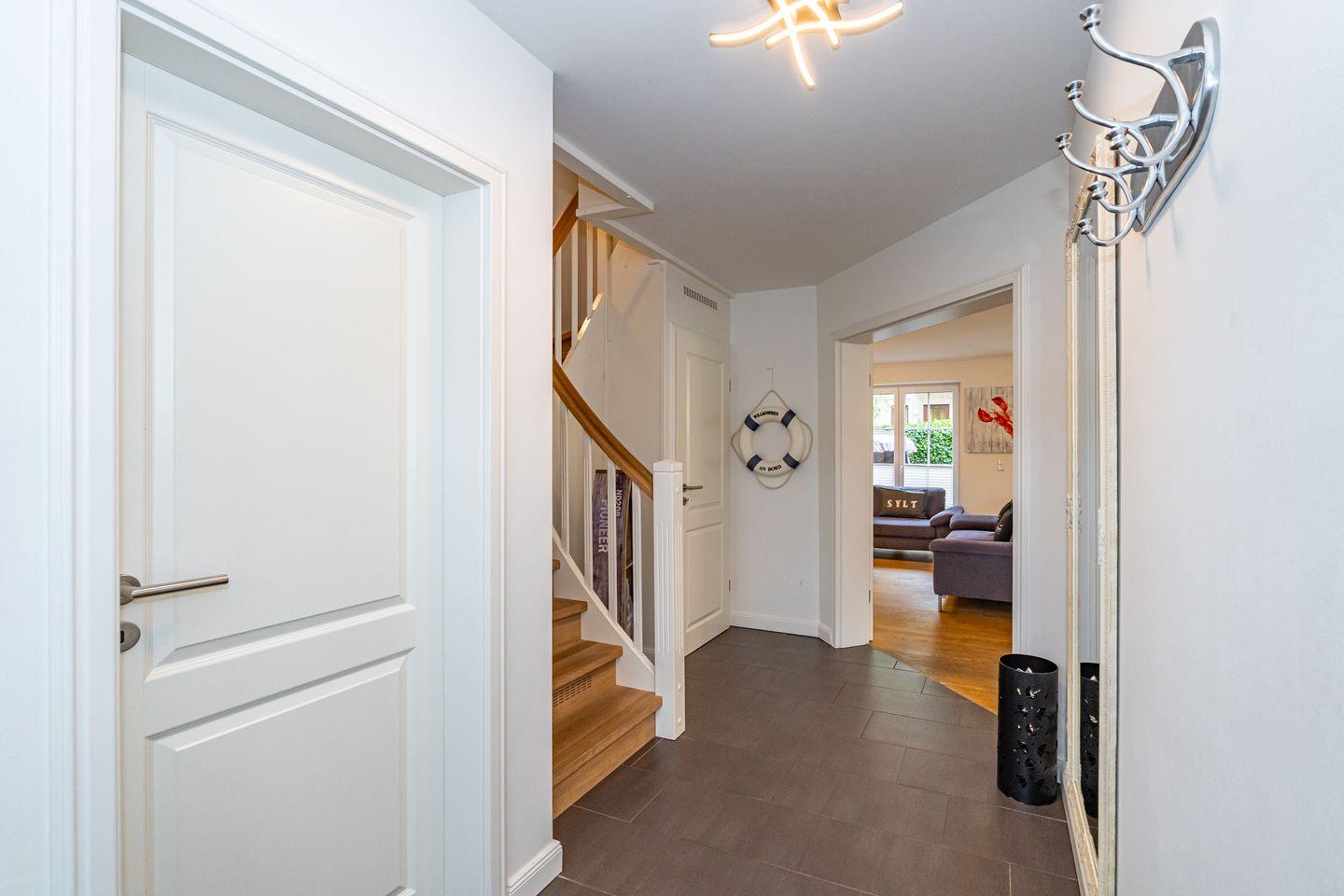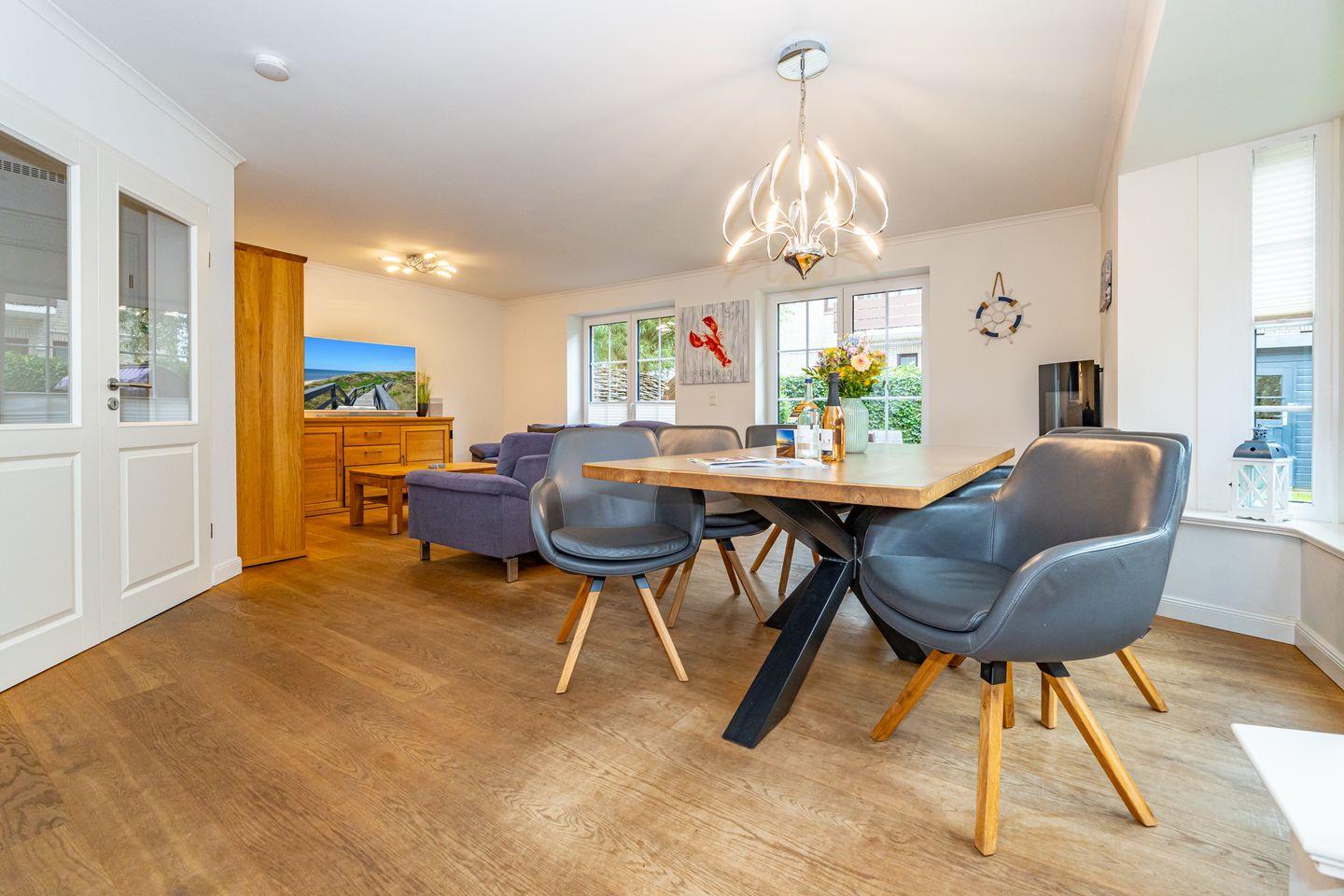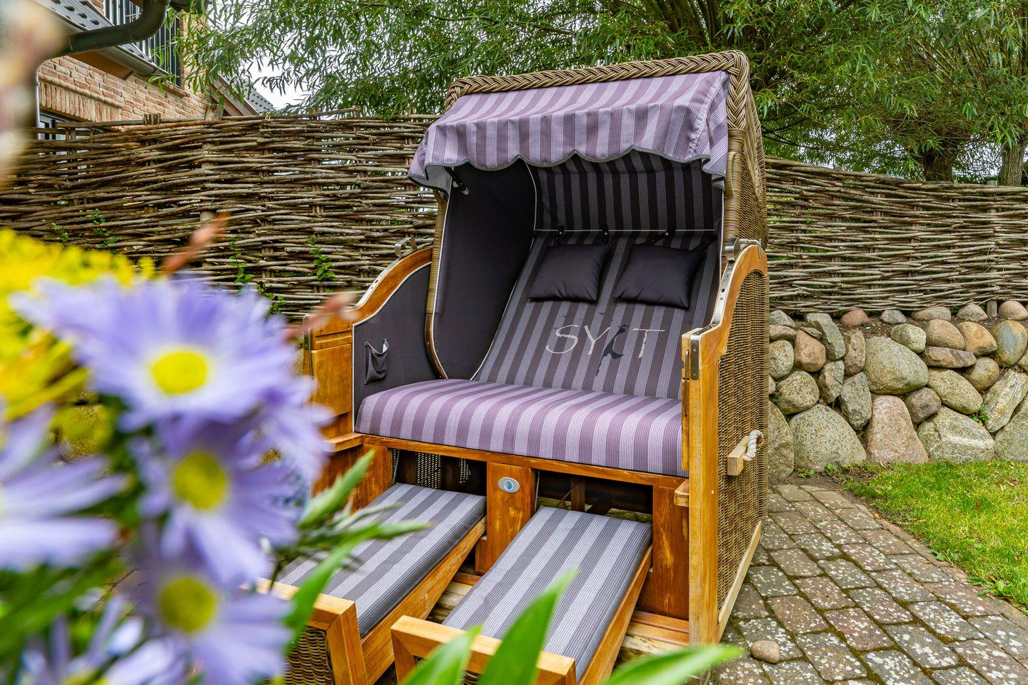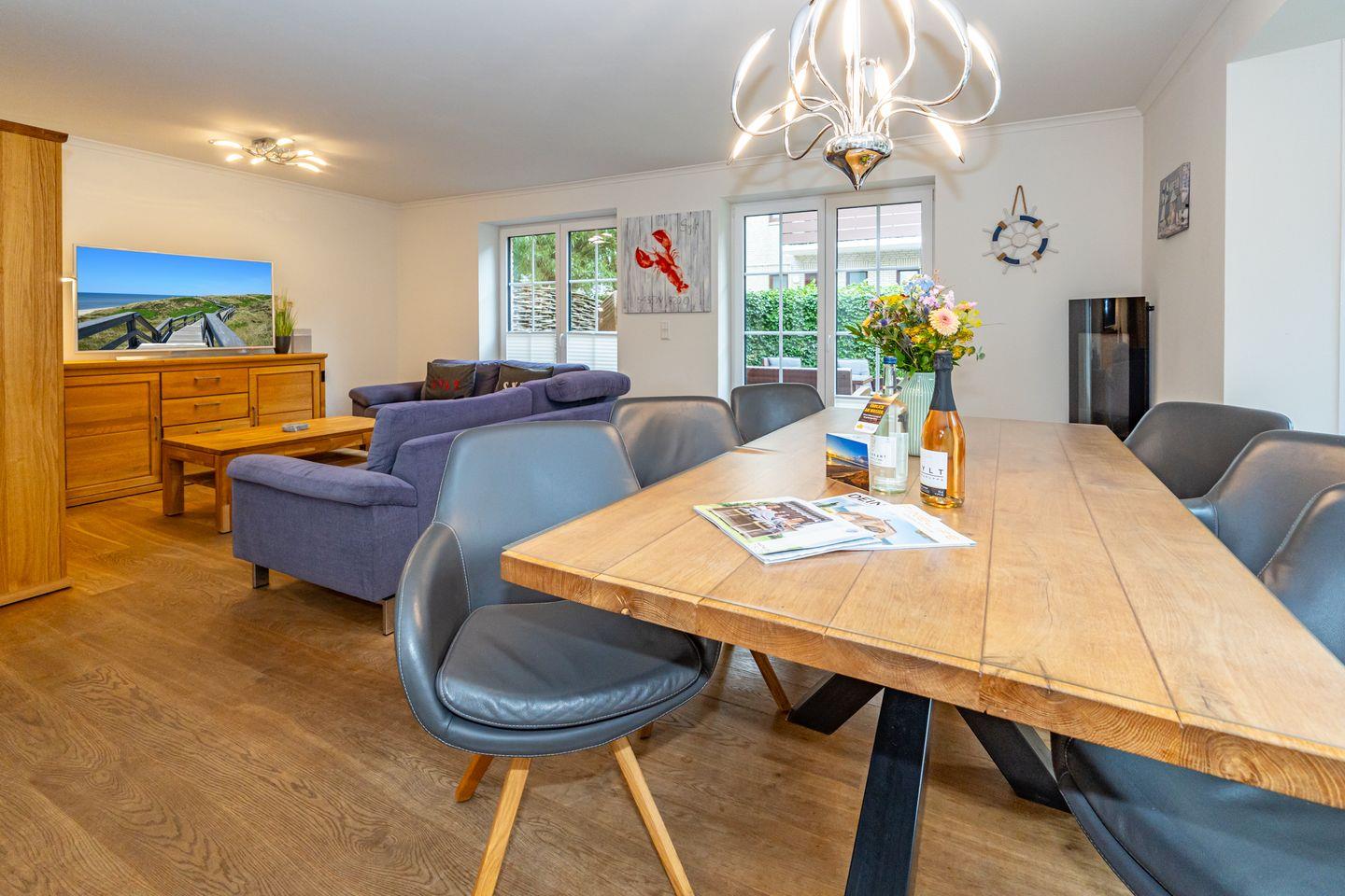 Durch die zentrale Lage der "Gode Stuv" haben Sie alle Möglichkeiten, die Insel Sylt zu erkunden. Schnell sind Sie auch fußläufig in der Westerländer Innenstadt und natürlich am wunderschönen Sandstrand. Eine gemütliche Sofalandschaft mit Elektrokamin und Blick in Ihren eigenen Garten mit Südwestterrasse, sind nur einige Höhepunkte der "Gode Stuv". Den Garten werden Sie schnell lieben lernen: Lädt Sie doch die eigene Blockhaussauna mitten im Garten zum entspannen ein. Genießen Sie auch den Strandkorb (saisonal) und die hochwertigen Lounge-Möbel. Die helle, offene Küche mit coolen Barhockern, lädt genauso wie der große Esstisch zu lauschigen Nachmittagen mit der ganzen Familie oder Freunden ein. Im Obergeschoss finden Sie zwei gleichgroße Schlafzimmer mit Boxspringbetten (180m x 200 cm), sowie das Badezimmer mit ebenerdiger Dusche. Im Dachgeschoss befindet sich das dritte Schlafzimmer mit einem Boxspringbett (160 x 200 cm). Alle Schlafzimmer verfügen über ein TV-Gerät. Auch eine Gästetoilette mit ebenerdiger Dusche, sowie eine Waschmaschine im Erdgeschoss, gehört mit zur Ausstattung. Ein Stellplatz, für Ihr Auto ist selbstverständlich direkt am Ferienhaus für Sie reserviert. Haustiere sind nach vorheriger Anmeldung und gegen Gebühr erlaubt (10,- € pro Tier/Tag).
