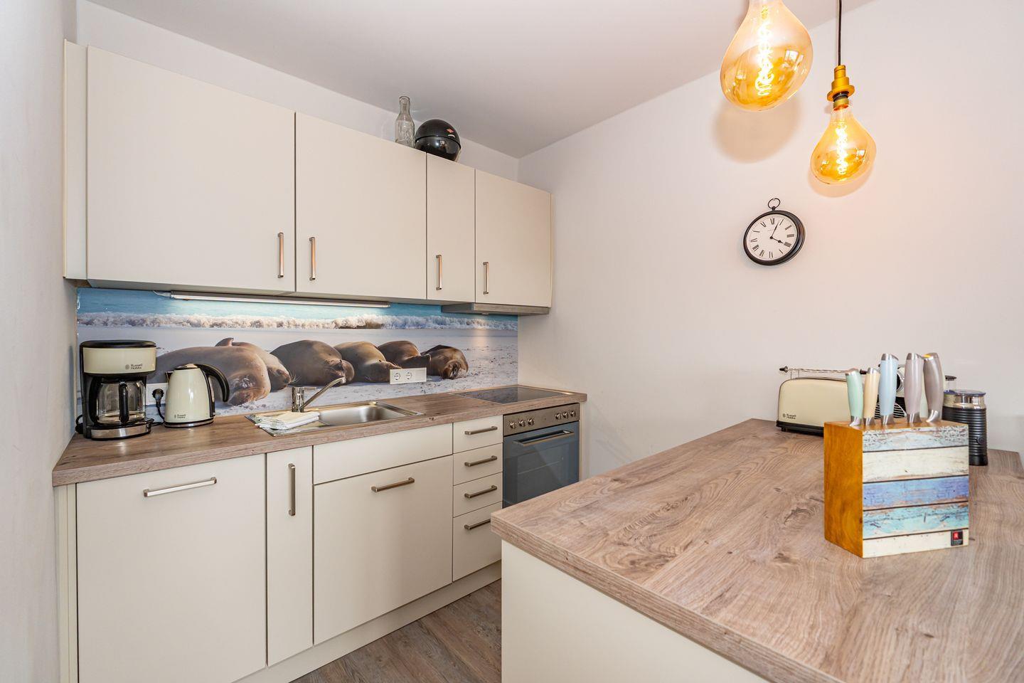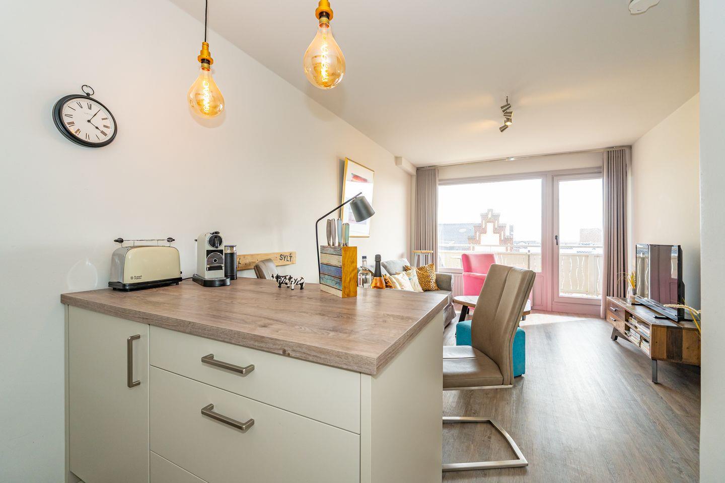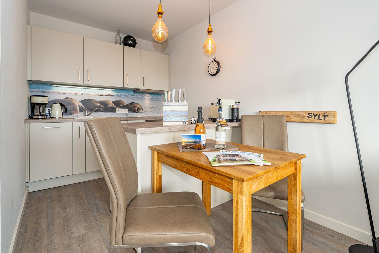 Diese ca. 50 qm große 2-Zimmer-Ferienwohnung punktet mit Ihrer hochmodernen Einrichtung. Sie befindet sich mitten in der Fußgängerzone von Westerland. Der Wohn- Essbereich ist offen gestaltet. Die integrierte, offene Küche hat einen Backofen mit einem Ceranfeld, eine Spülmaschine, Toaster, Kaffeefiltermaschine, eine Nespresso Kapselmaschine und einen Wasserkocher.