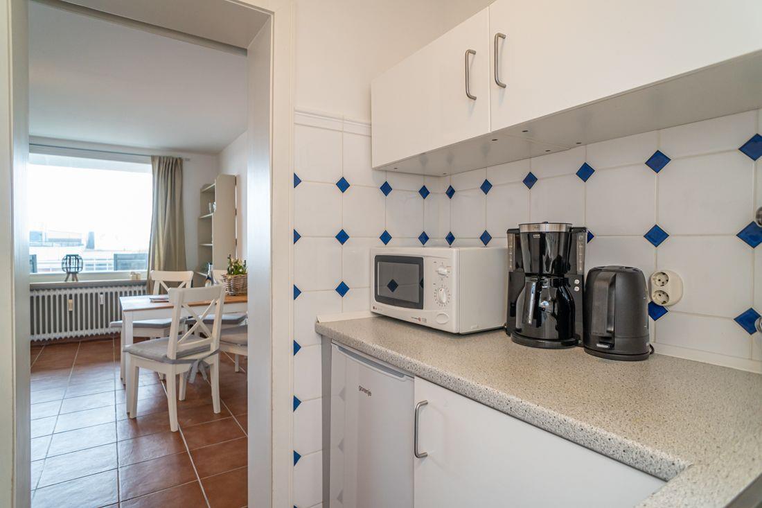 Balkon mit ganz viel Himmel- und etwas Meeresblick! Die Ferienwohnung Nr.71 liegt sehr zentral, in der 3. Etage des Ferienwohnungshaus Atlantik. Die Ferienwohnung verfügt über ein Schlafzimmer mit Kojenbett und TV, ein helles Badezimmer mit Dusche, Waschmaschine und das Wohnzimmer, welches an die Küche grenzt. Im offenen Wohn- und Essbereich steht ein TV und ein Schlafsofa, das mit wenigen, einfachen Handgriffen zu einem bequemen Doppelbett wird. Von dort aus haben Sie Zugang zum Balkon mit Gartenmöbeln und Meerblick. Die Küche ist ausgestattet mit einem Geschirrspüler, Mikrowelle und Kaffeemaschine.