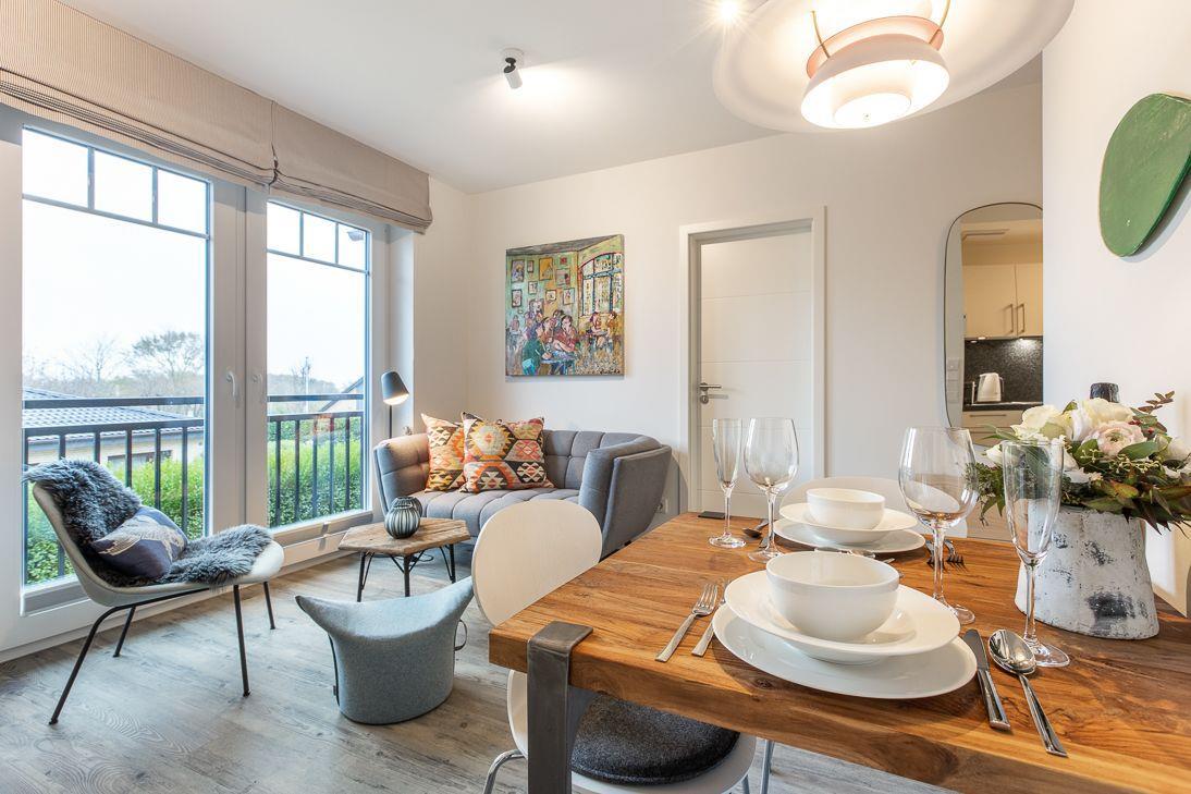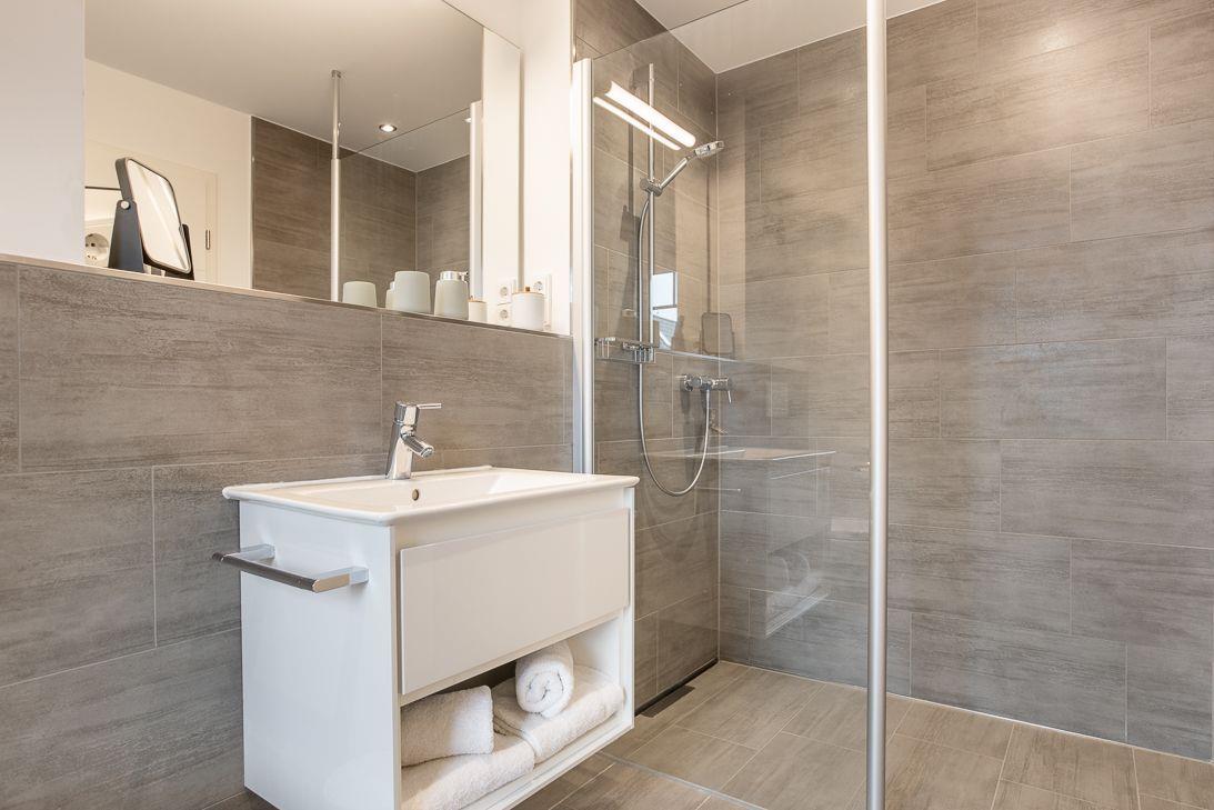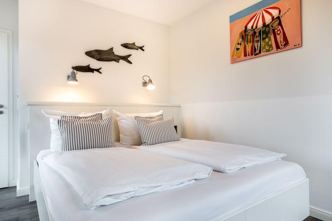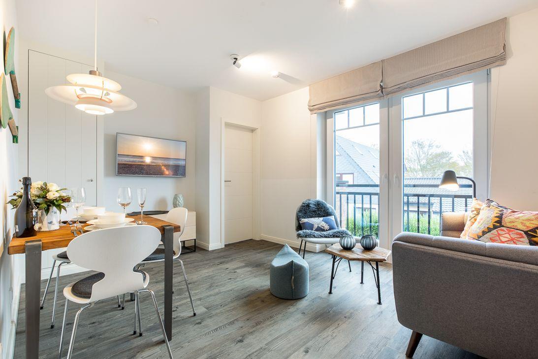 Die Ferienwohnung verfügt über ein gemütliches Wohnzimmer, ein großzügiges Tageslichtbad mit bodengleicher Dusche und eine offene Küche mit gehobener Ausstattung. Das Schlafzimmer bietet ein komfortables Doppelbett (160x200), sowie einen geräumigen Kleiderschrank.