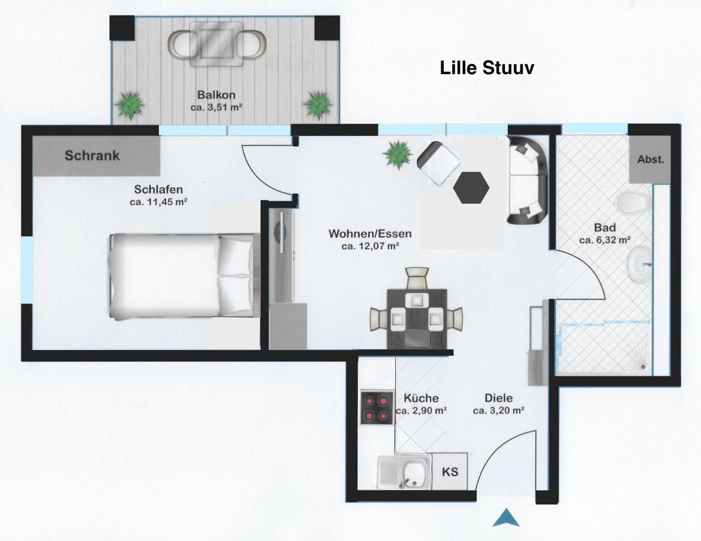 Die Lille Stuuv bietet Platz für bis zu zwei Personen und verfügt über eine gemütliche und hochwertige Ausstattung, sowie einen Balkon. Genießen Sie den zusätzlichen Komfort von WLAN, Fußbodenheizung und einem eigenen Parkplatz.