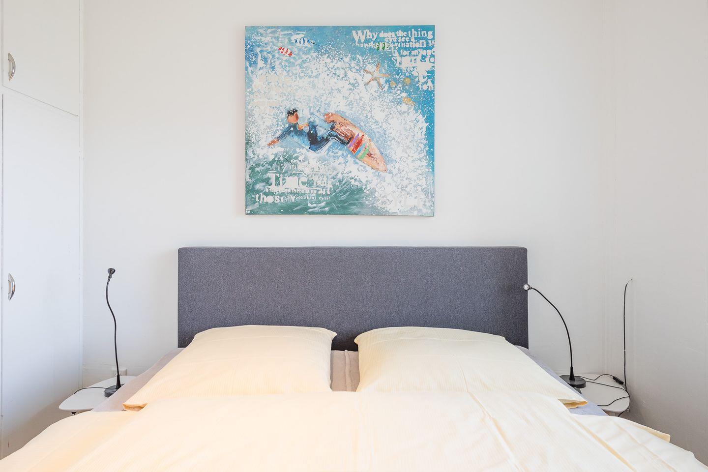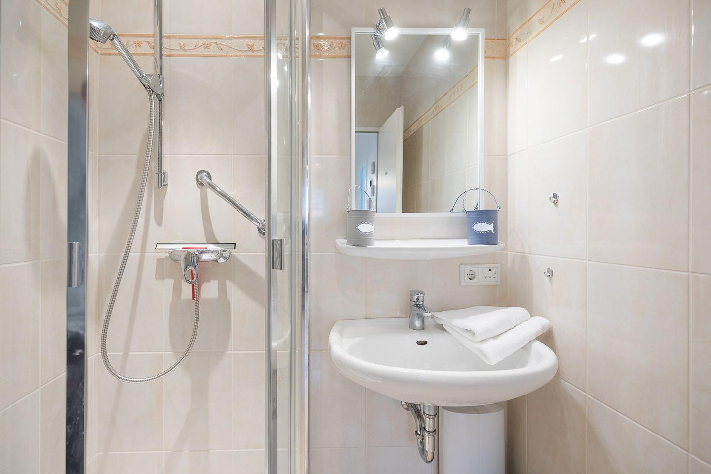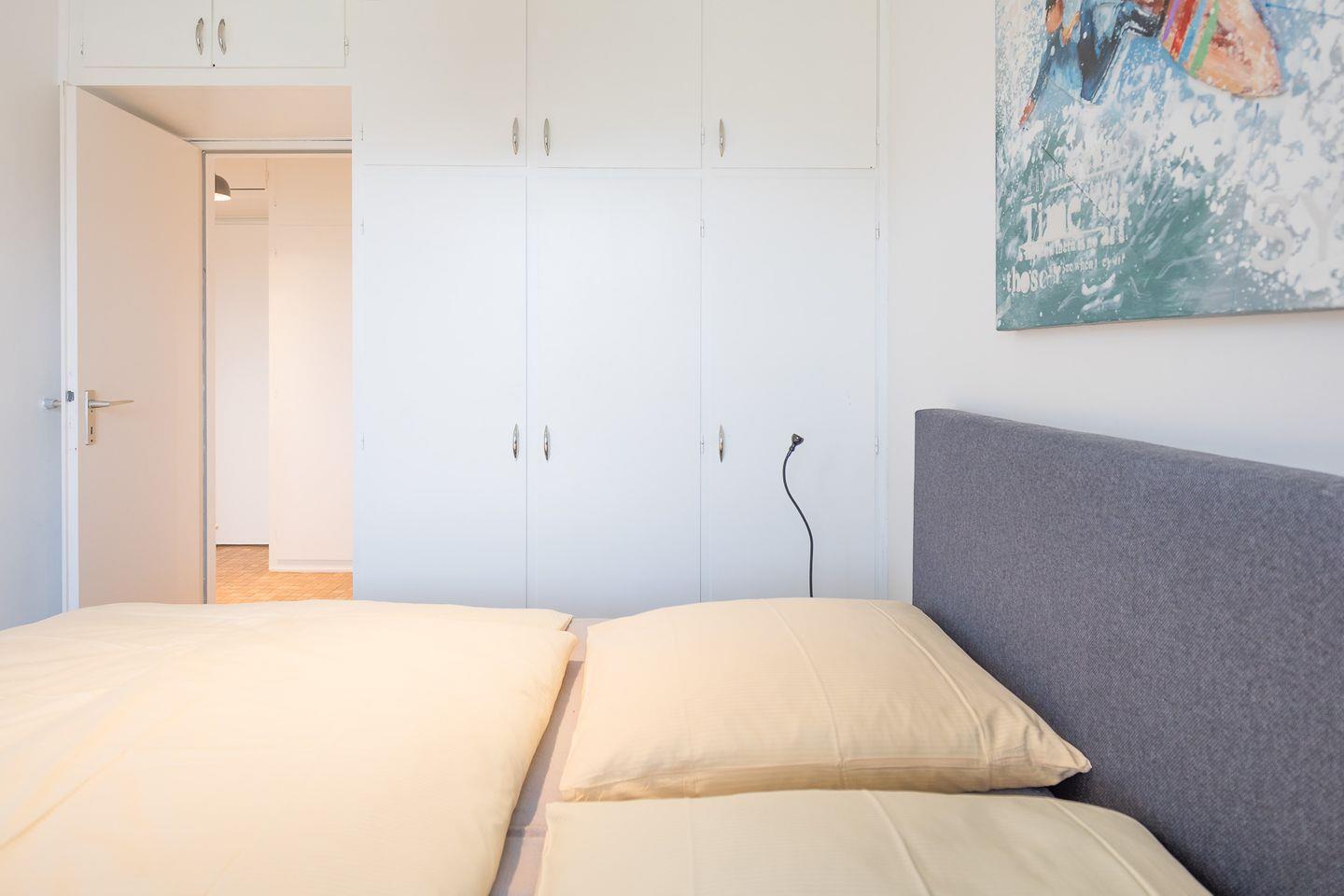 Die Ferienwohnung ist geschmackvoll und funktional eingerichtet: Ein Schlafzimmer mit einem bequemen Doppelbett (180 x 200, getrennte Matratzen mit einem durchgehenden Topper) und eine komfortable und gut ausgestattete, separate Einbauküche mit Ceranfeld, Backofen, Kaffeemaschine (Filtergröße 4). Der Wohnbereich verfügt über ein Sofa und einen Flachbild-TV. Das Badezimmer ist mit einer Dusche, WC und Waschbecken eingerichtet. Auf dem geschützten, sonnigen Balkon können Sie den Tag gemütlich ausklingen lassen.