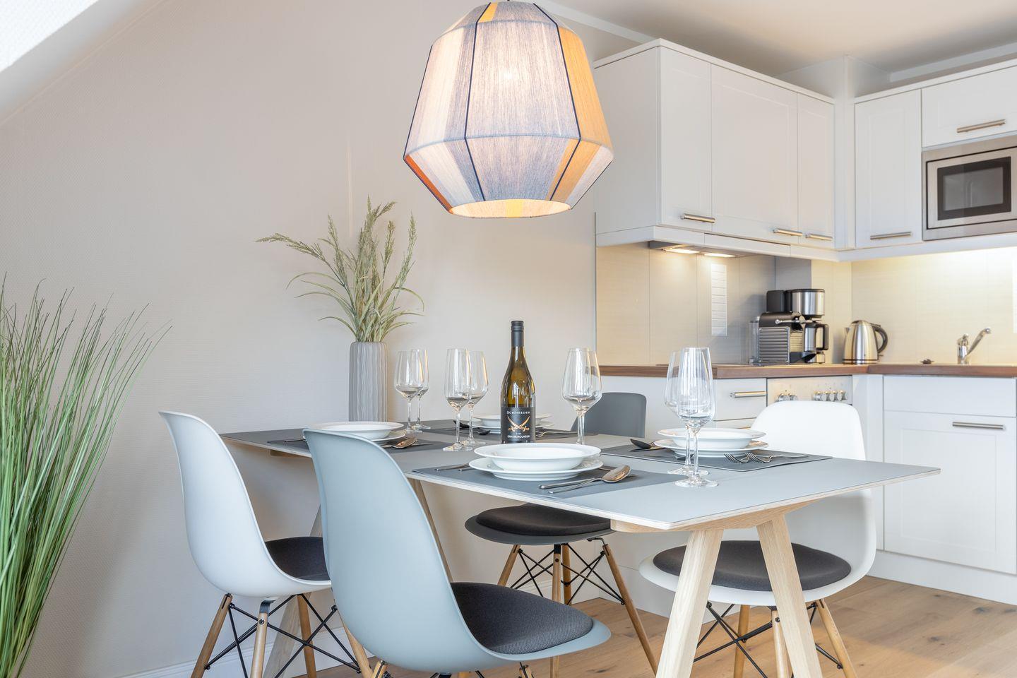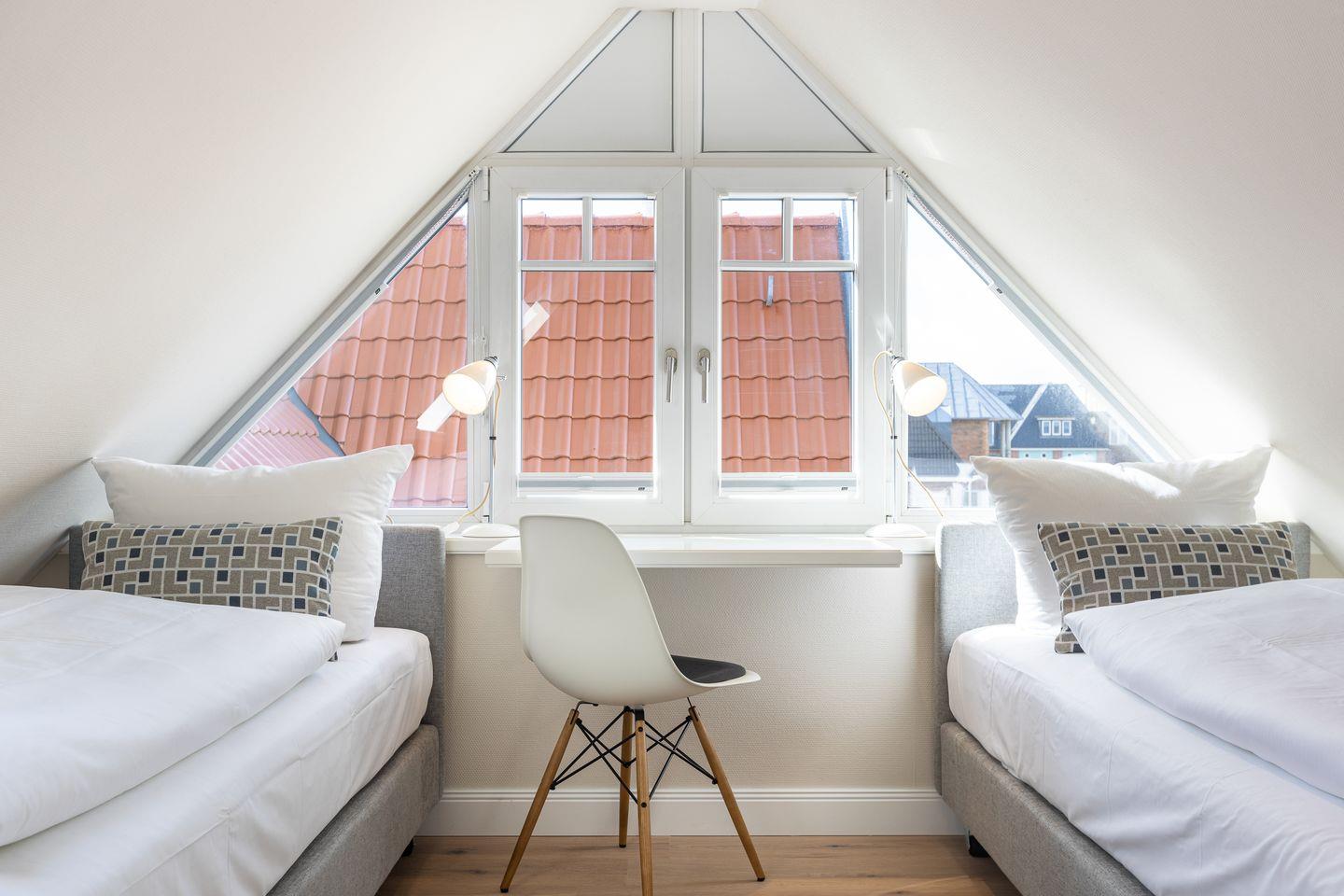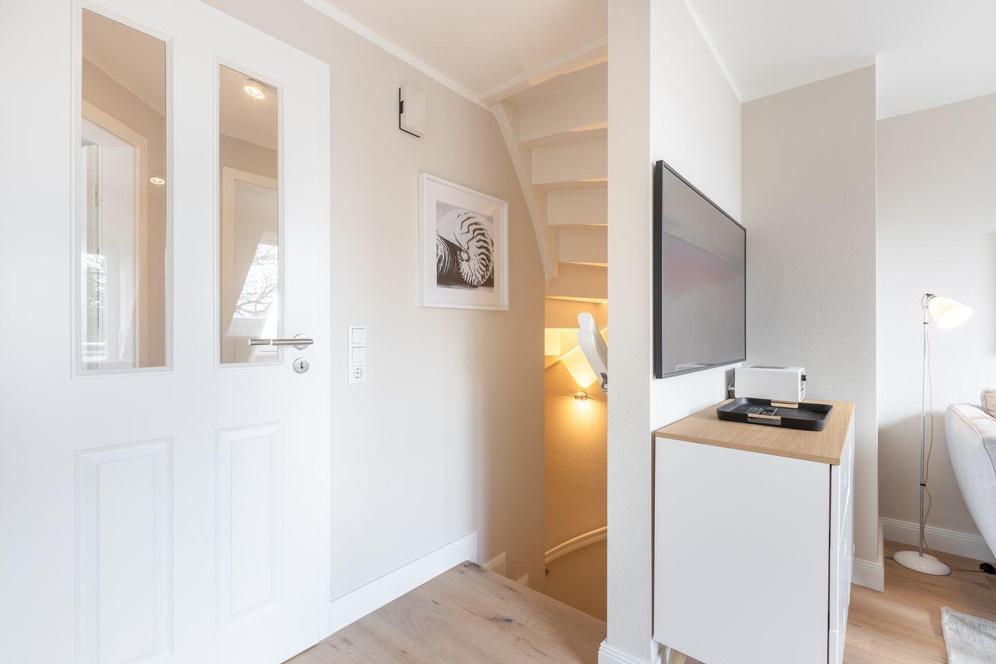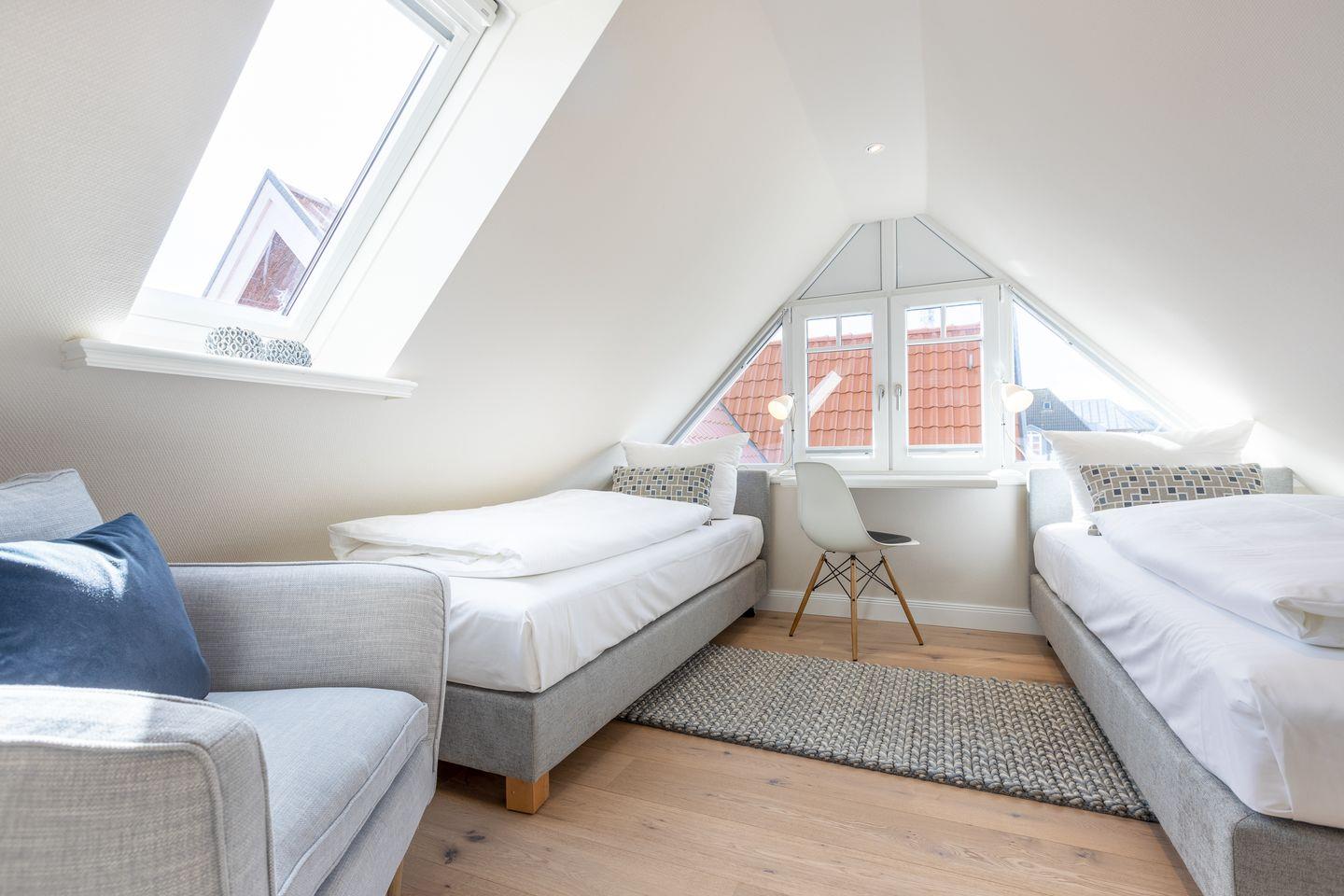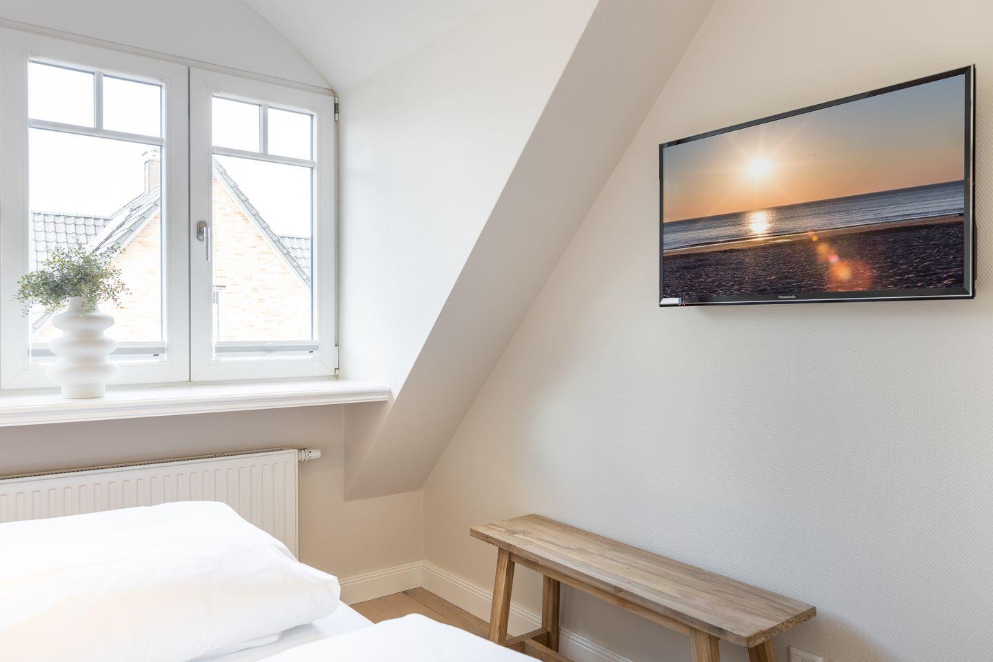Helle 3- Zimmer-Ferienwohnung im 1 Obergeschoss. Designermöbel und -Lampen sowie Eichenholz-Parkett in der gesamten Ferienwohnung. Komplett designt durch „Homestaging Sylt“. Ein helles Wohn- / Esszimmer mit einer hochwertigen Markenküche (Geschirrspüler Herd, Mikrowelle, Gefrierfach Kaffeefiltermaschine) und einem vorgelagerten Sonnenbalkon. Des Weiteren befindet sich auf dieser Ebene ein Schlafzimmer mit Boxspringbett, ein Flur und ein komplett neues Duschbad-WC mit Fußbodenheizung. Der Spitzboden ist ausgebaut und bietet einen weiteren Schlafraum mit zwei Einzelbetten. Das Ambiente wird durch hochwertige Tischlereinbauten in beiden Schlafzimmern und Bad abgerundet. Im Wohnzimmer und in den beiden Schlafzimmern befinden sich jeweils ein Smart-TV (2 x Samsung Frame) . WLAN ist selbstverständlich vorhanden. In der Ferienwohnung sind keine Haustiere erlaubt. Dies ist eine Nichtraucherwohnung. Ein kostenfreier Stellplatz gehört zur Ferienwohnung. Ein Fahrradständer steht dem gesamten Wohnkomplex vor dem Haus zur Verfügung. Im Haus befinden sich Waschmaschine und Trockner gegen Gebühr in einem Gemeinschaftskeller.