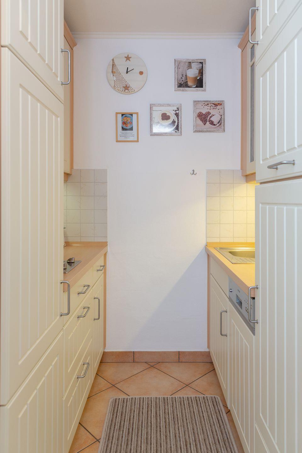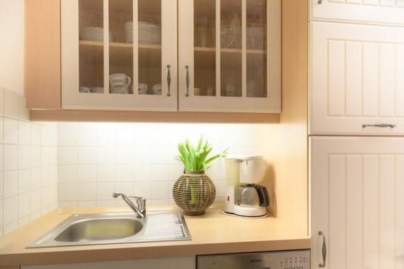Die separate Küche ist mit modernen Geräten wie Cerankochfeld, Mikrowelle, Spülmaschine, Kühlschrank mit Gefrierfach, Toaster, Wasserkocher, Nespresso und Kaffeemaschine ausgestattet. Geschirr, Besteck und Küchenutensilien sind ebenso vorhanden wie Geschirrhandtücher. Damit haben Sie alle Möglichkeiten, sich selbst zu versorgen und den Tag nach Ihren Wünschen zu gestalten. Ein raffinierter Essbereich mit Esstisch steht Ihnen für gemeinsame Mahlzeiten zur Verfügung.