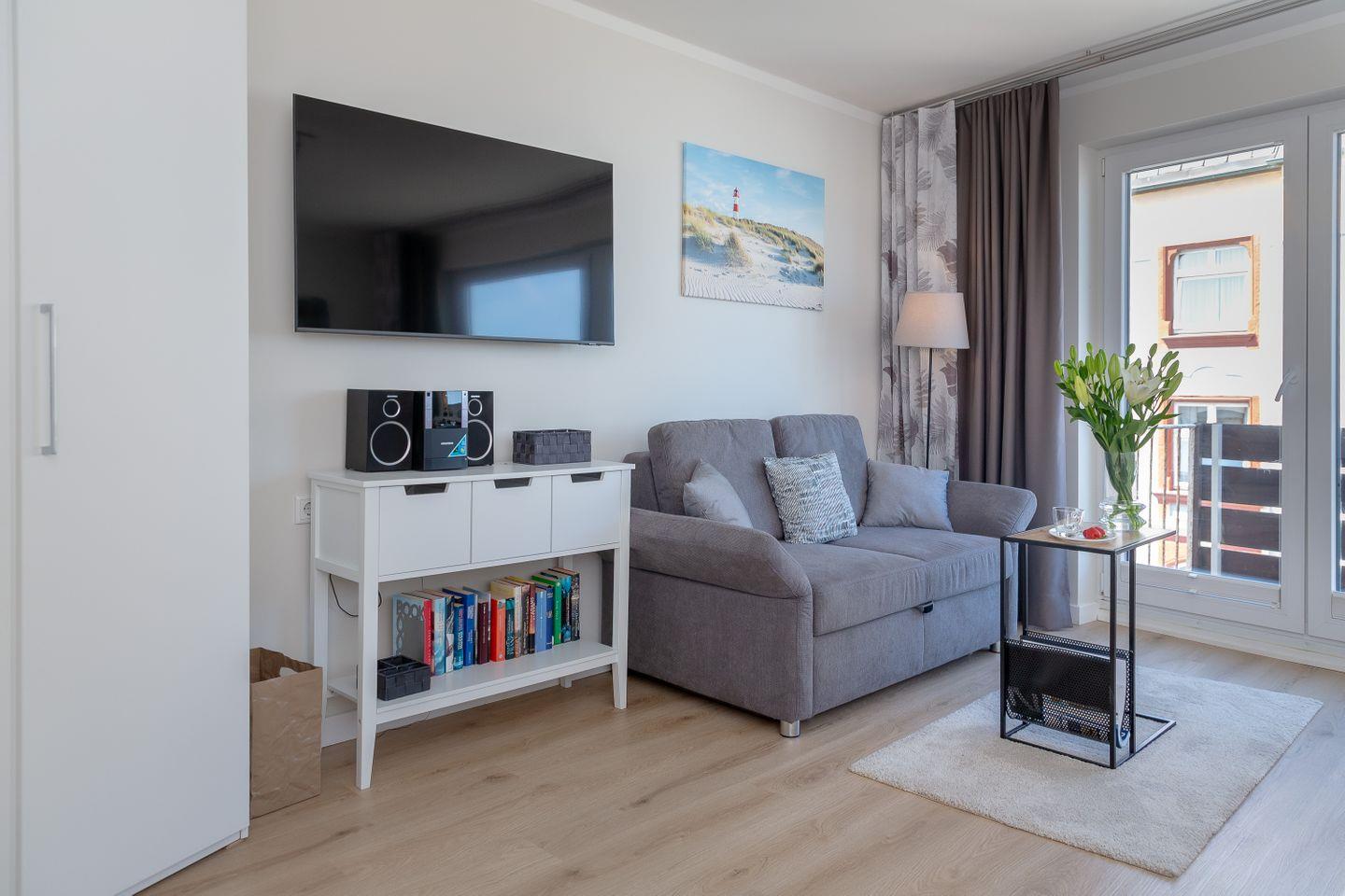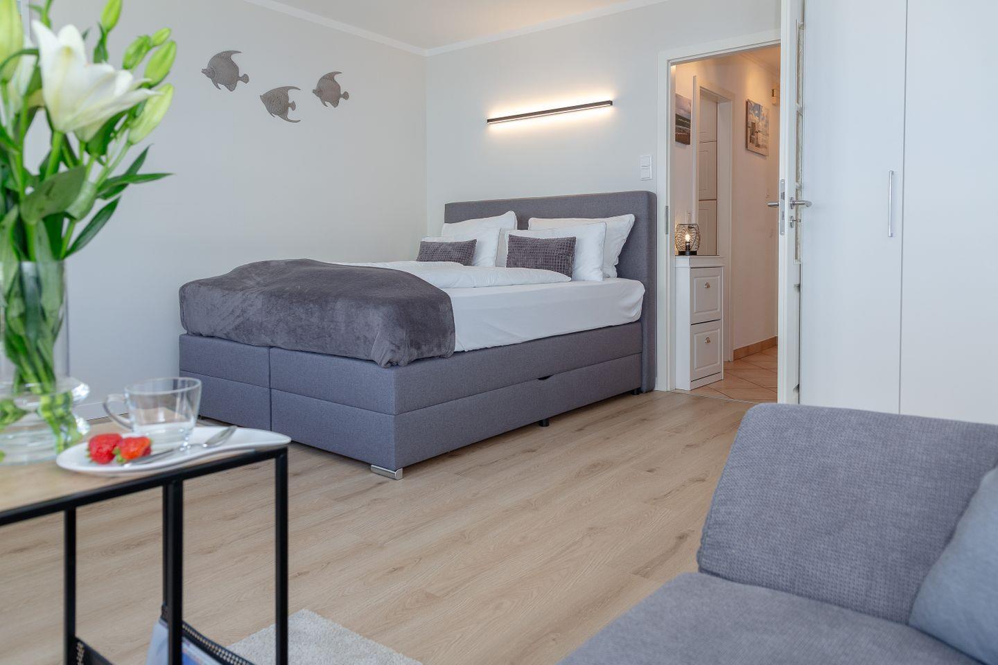 Das Wohnzimmer überzeugt durch ein durchdachtes Raumkonzept mit Sofa, sowie TV und kostenfreiem WLAN. Große Fenster sorgen für viel Tageslicht. Mit dem 160x200cm großem Boxspringbett werden Sie einen erholsamen Schlaf haben. Im Badezimmer mit Dusche, WC, modernem Waschbecken, Kosmetikspiegel, Spiegel, Haartrockner sowie Hand- und Badetüchern finden Sie alles, was Sie für einen entspannten Aufenthalt benötigen.