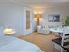Das komfortable Bett ist mit einem hochwertigen Bouclé-Stoff bezogen und bietet mit 160 x 200 cm angenehmen Schlafkomfort. Zwei bequeme Modulsessel schaffen eine gemütliche Sitzgelegenheit – perfekt, um nach einem Strandspaziergang bei einem Buch oder einem Glas Wein zu entspannen.