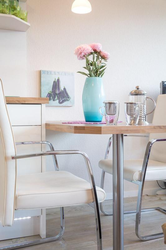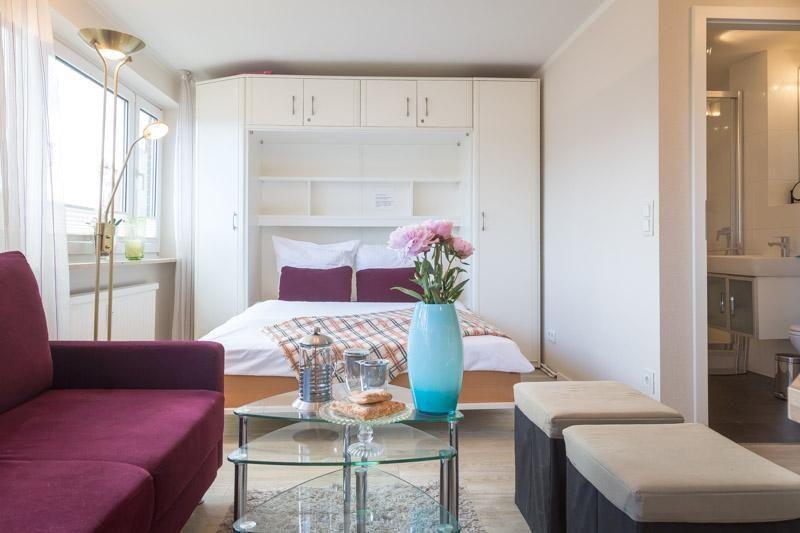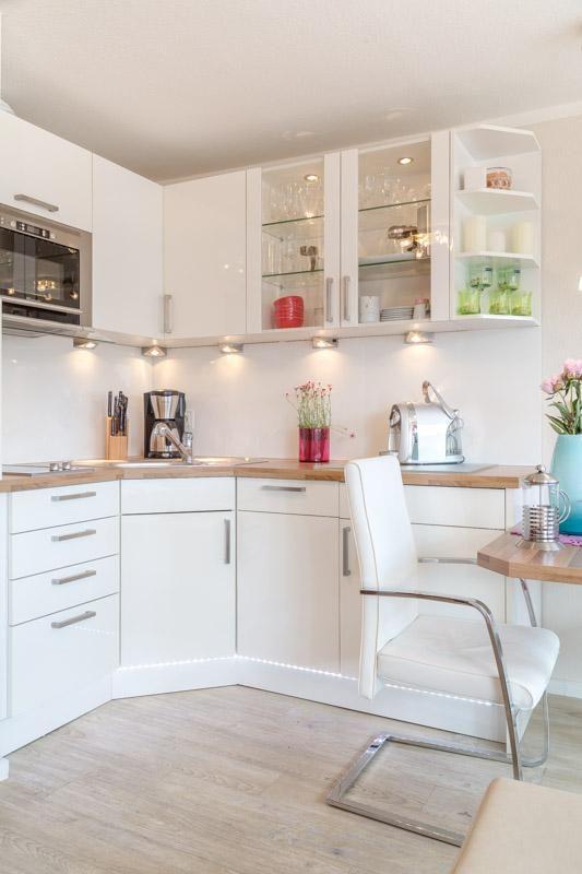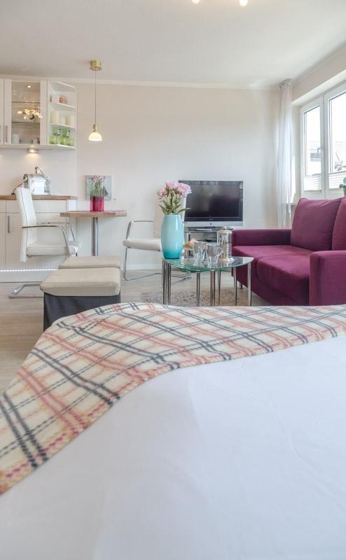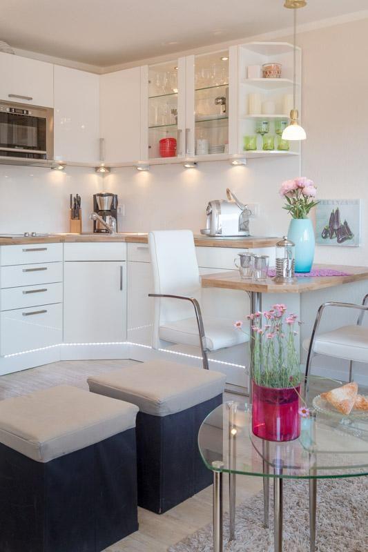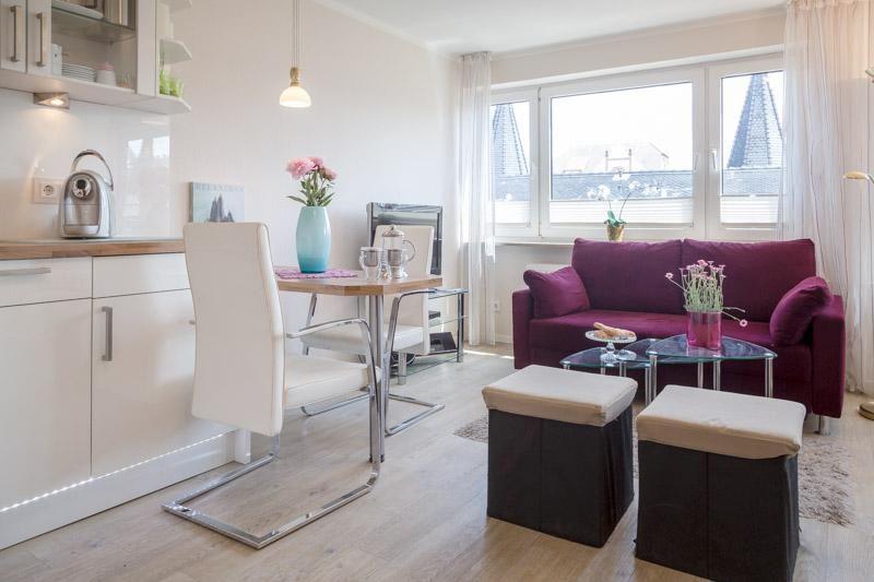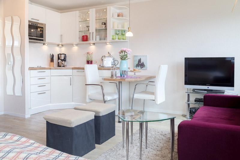Mit ihren 26 m² bietet die Wohnung genügend Platz für zwei Gäste und ist optimal gestaltet, um höchsten Komfort und Gemütlichkeit zu gewährleisten. Das lichtdurchflutete Wohnzimmer ist offen zum Küchenbereich und ermöglicht einen geselligen Austausch. Die voll ausgestattete Küche verfügt über alles, was Sie brauchen, darunter eine Spülmaschine und eine Mikrowelle, sodass Sie auch im Urlaub nicht auf Ihre gewohnte Kochroutine verzichten müssen.