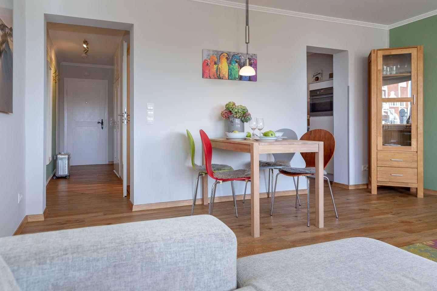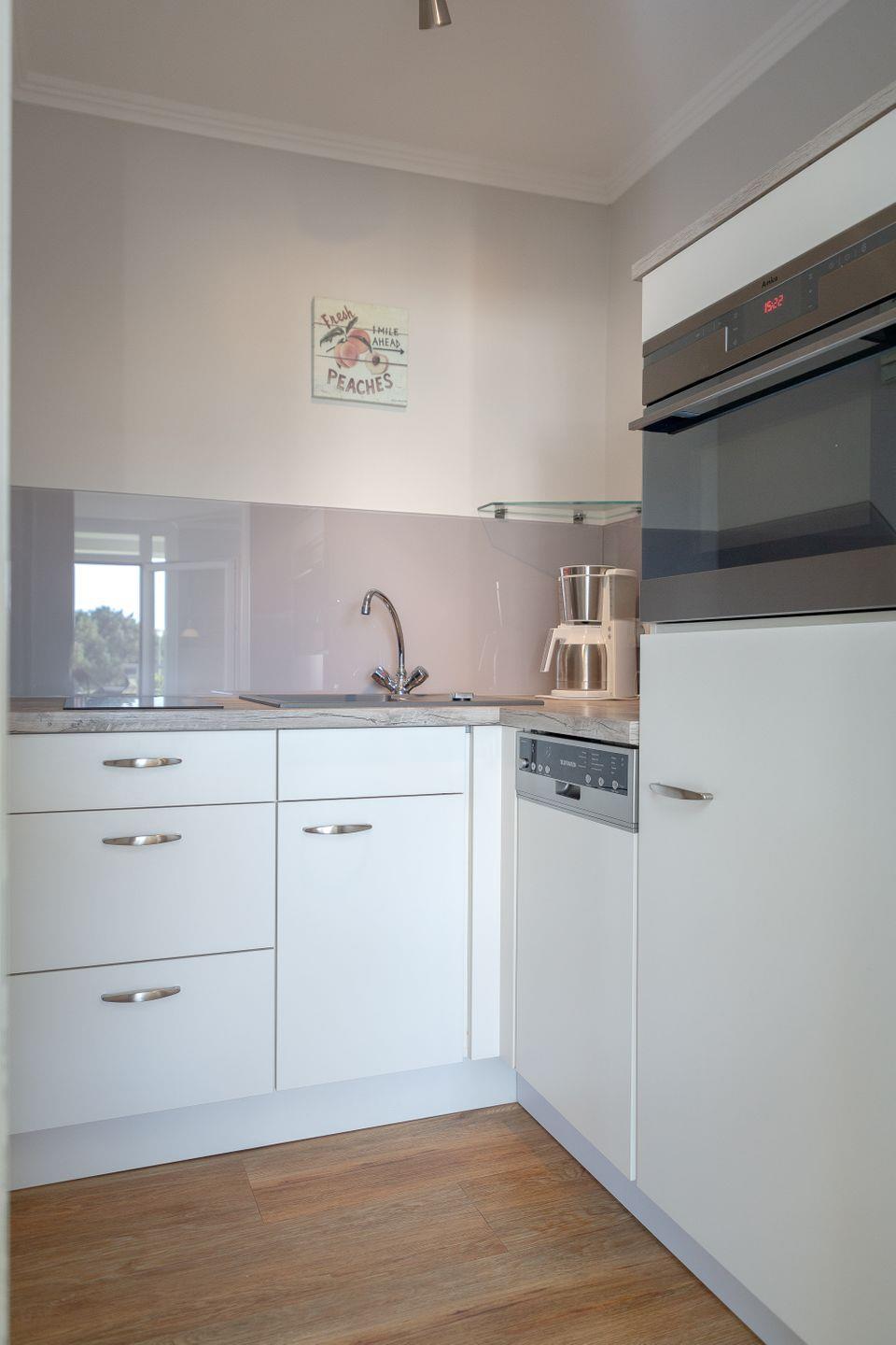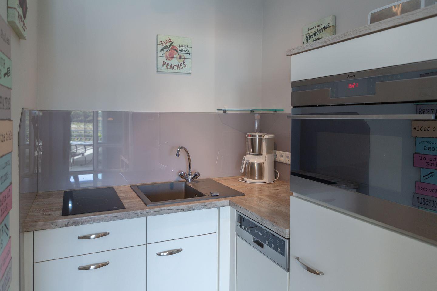 In der schicken Küchenecke mit Backofen, Wasserkocher, Kaffeemaschine und 2er Ceranfeld finden Sie alles, um Ihre Lieblingsmahlzeiten zuzubereiten. Das moderne Duschbad trägt zu Ihrem Komfort bei, und der Designboden in Dielenoptik verleiht der Wohnung eine besondere Atmosphäre.