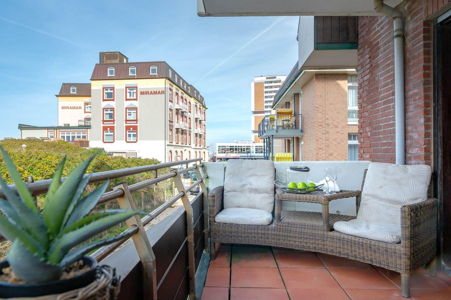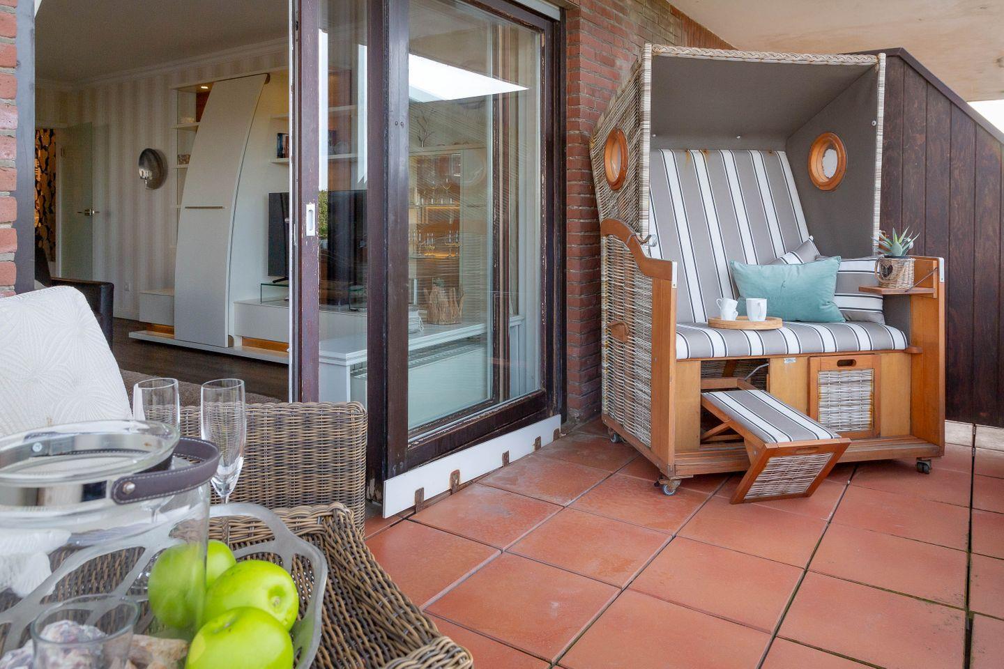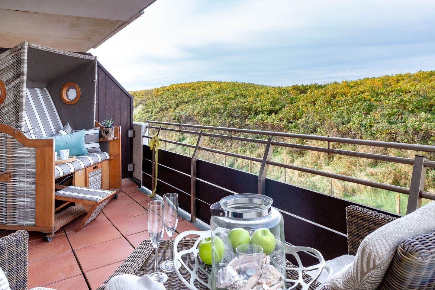 Direkt hinter dem Dünenkamm in kaum zu überbietender Wohnlage (50 Meter bis zum Strandübergang, 100 Meter bis zur Friedrichstraße), erwartet Sie auf rund 55 m² behagliche Gemütlichkeit gepaart mit allem erdenklichen Luxus. Die Wohnung befindet sich in der 1. Etage nur durch einen Fuß/Radweg und der Düne vom Strand entfernt. Statt Verkehrslärm erwartet Sie Meeresrauschen. Sie genießen den großzügigen Wohnbereich mit Schlafcouch (160 x 200), Relax-Sessel, großzügigem Flat Screen und offener, voll ausgestatteter Küche mit Essplatz. Großzügiger West-Balkon (2 x 4,3 m) mit Strandkorb und direktem Dünenblick. Daneben erwartet Sie ein separates Schlafzimmer mit Kabel-TV und elektr. verstellbarem Boxspringbett (180 x 200). Modernes Duschbad/WC mit Regendusche. Die Wohnung ist ausgestattet mit z.B. Geschirrspüler, Mikrowelle, Backofen, Ceranherd, Kabel-TV, Radio, Fön. Im Haus: Waschmaschine und Trockner zur entgeltlichen Benutzung. Die Wohnung verfügt über eine Duplexparkmöglichkeit in der TG für Kleinwagen (max. Höhe 1,5m; max. Länge 5m ;max. Gewicht 2t;). Die Benutzung erfolgt ausschließlich auf eigene Gefahr.