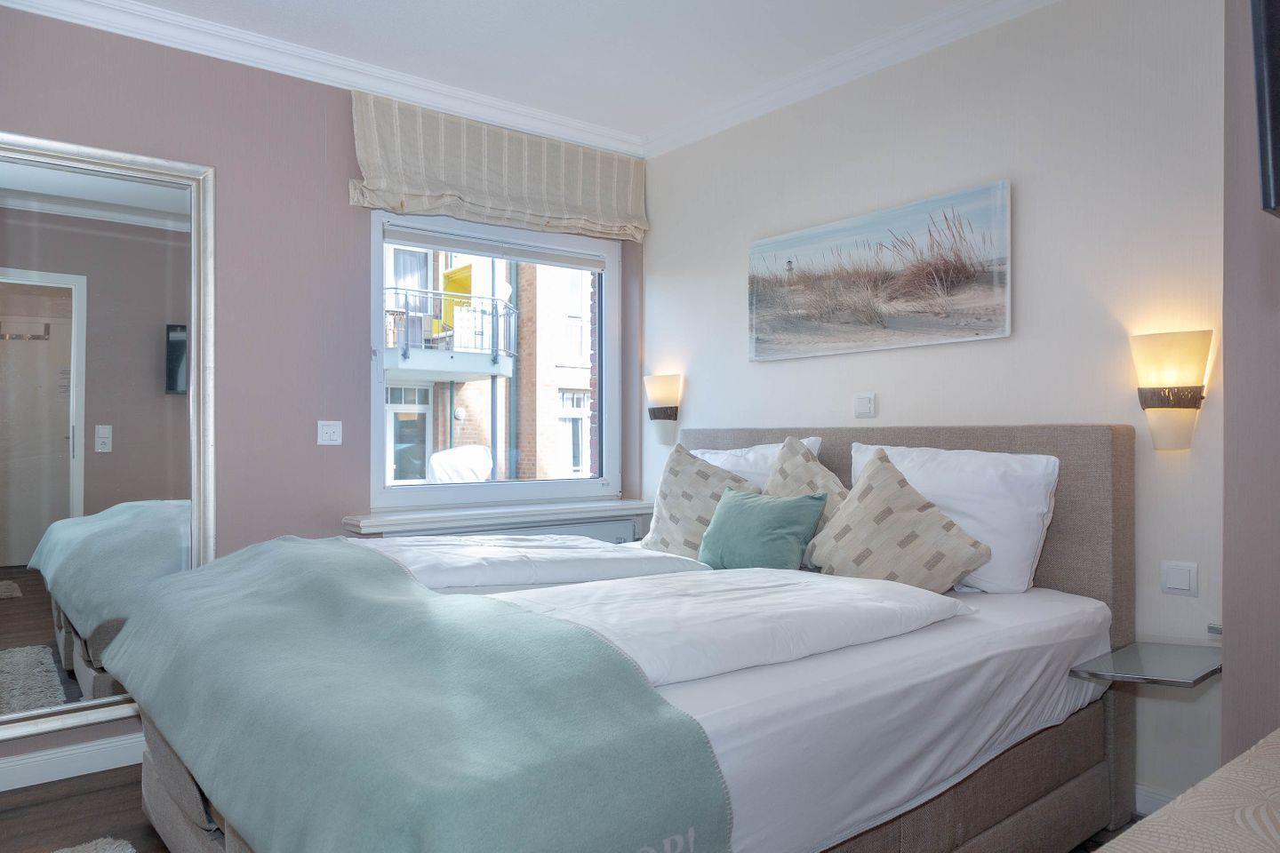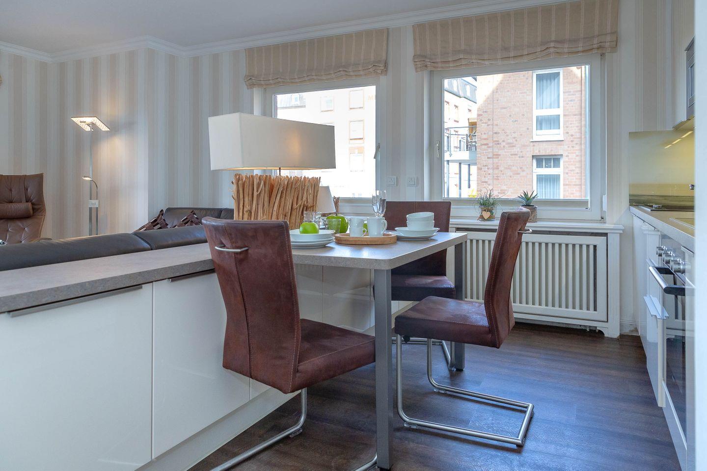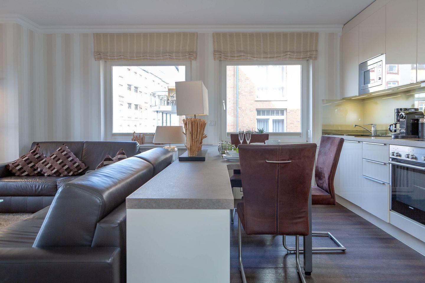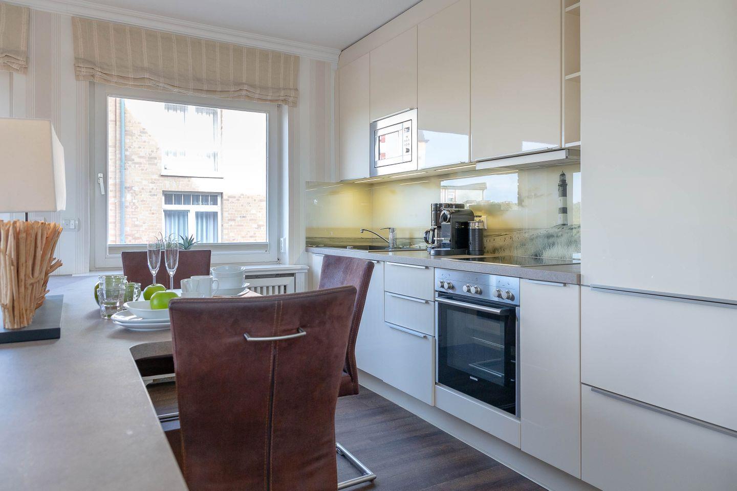 Direkt hinter dem Dünenkamm in kaum zu überbietender Wohnlage (50 Meter bis zum Strandübergang, 100 Meter bis zur Friedrichstraße), erwartet Sie auf rund 55 m² behagliche Gemütlichkeit gepaart mit allem erdenklichen Luxus. Die Wohnung befindet sich in der 1. Etage nur durch einen Fuß/Radweg und der Düne vom Strand entfernt. Statt Verkehrslärm erwartet Sie Meeresrauschen. Sie genießen den großzügigen Wohnbereich mit Schlafcouch (160 x 200), Relax-Sessel, großzügigem Flat Screen und offener, voll ausgestatteter Küche mit Essplatz. Großzügiger West-Balkon (2 x 4,3 m) mit Strandkorb und direktem Dünenblick. Daneben erwartet Sie ein separates Schlafzimmer mit Kabel-TV und elektr. verstellbarem Boxspringbett (180 x 200). Modernes Duschbad/WC mit Regendusche. Die Wohnung ist ausgestattet mit z.B. Geschirrspüler, Mikrowelle, Backofen, Ceranherd, Kabel-TV, Radio, Fön. Im Haus: Waschmaschine und Trockner zur entgeltlichen Benutzung. Die Wohnung verfügt über eine Duplexparkmöglichkeit in der TG für Kleinwagen (max. Höhe 1,5m; max. Länge 5m ;max. Gewicht 2t;). Die Benutzung erfolgt ausschließlich auf eigene Gefahr.
