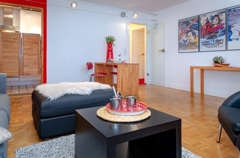 Hier wurde alt und neu gemixt. Bei ca. 50m² Wohnfläche hat der helle große Wohnraum mit sep. Küche den größten Anteil. WZ mit Parkettboden , Sofa- / und Essecke, Flat TV, Balkon (Nord), separater Küchenbereich (Backofen, kein GS). Schlafzimmer mit festen Doppelbett (180x 200) und Schrankwand. Das Bad wurde, wie die Küche komplett saniert. Der kleine Badezimmerbereich wurde geschickt ausgebaut. Im Haus: Fahrstuhl, Waschküche (Münzautomaten).