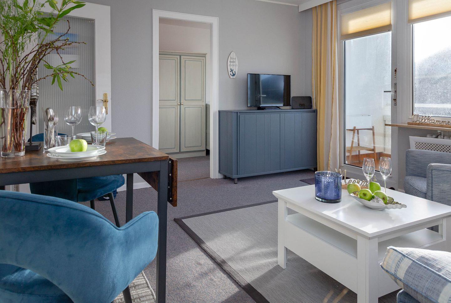 Das Appartement befindet sich in der 3. Etage in einem mehrstöckigen Appartementhaus, direkt am Strandübergang. Das sehr gepflegte 2 Zimmerappartement ist hell und gemütlich eingerichtet, ca. 42m². Im Wohnbereich befindet sich ein Essplatz und eine Sitzgruppe. Im Schlafzimmer findet man 2 Einzelbetten. Separate neue Küche mit Backofen (kein GS), Wohnzimmer mit TV und Radio. Toller Blick auf die Nordsee vom Südbalkon. Kostenpflichtige Stellplätze findet man am Haus.