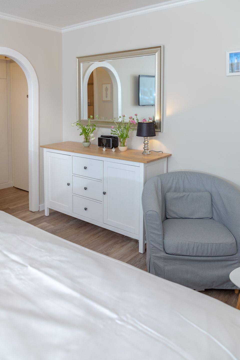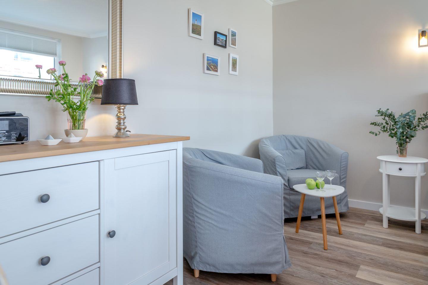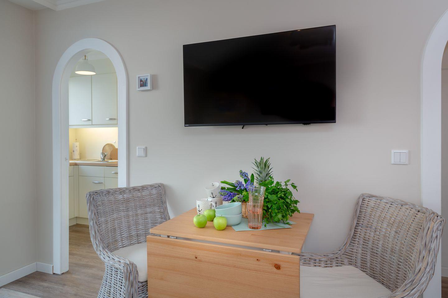 W-LAN und ein Smart TV sind ebenfalls vorhanden. Für genug Power sorgen die integrierten Steckdosen mit USB und USB C Anschluss. ebenfalls vorhanden ist ein Internetradio um z.B. Podcasts zu hören. Das Appartement befindet sich in der 1. Etage (Fahrstuhl im Haus) und ist zur ruhigen Nordseite ausgerichtet.