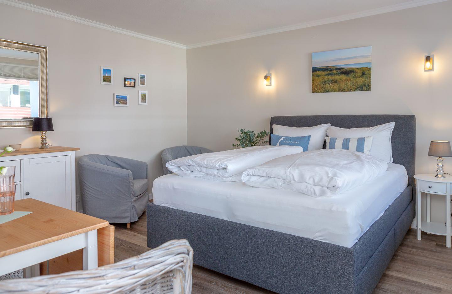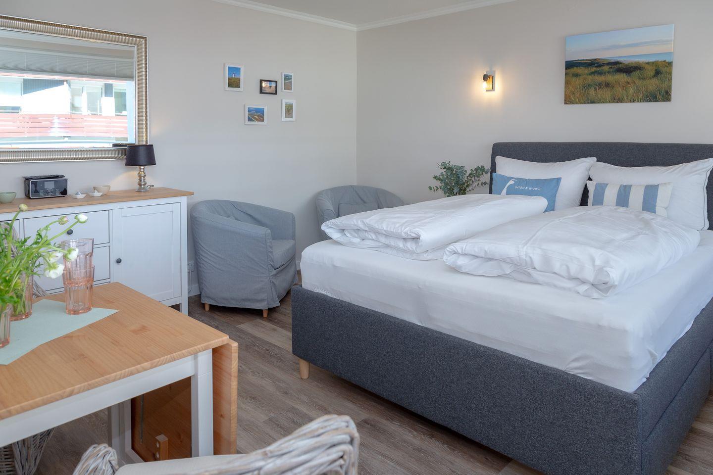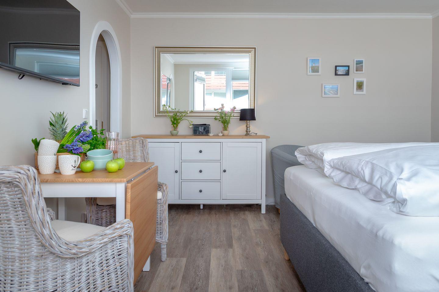 Mit seiner direkten Strandlage und der Nähe zur Fußgängerzone bietet es den idealen Ausgangspunkt für einen entspannten Urlaub am Meer. Das eben neu eingerichtete Appartement bietet auf ca. 28qm Platz für bis zu zwei Personen. Genießen Sie Ihren Morgenkaffee auf dem Balkon, während Sie das Meeresrauschen im Hintergrund hören. Ein eigener Stellplatz steht Ihnen ebenfalls zur Verfügung, sodass Sie Ihr Fahrzeug sicher unterbringen können.