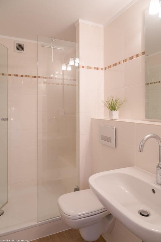 Das Badezimmer ist hell und freundlich gestaltet und bietet eine Dusche, die nach einem langen Tag am Strand für eine erfrischende Abkühlung sorgt. Die Ferienwohnung ist zudem eine Nichtraucherunterkunft, sodass Sie sich in einer sauberen und frischen Atmosphäre wohlfühlen können.