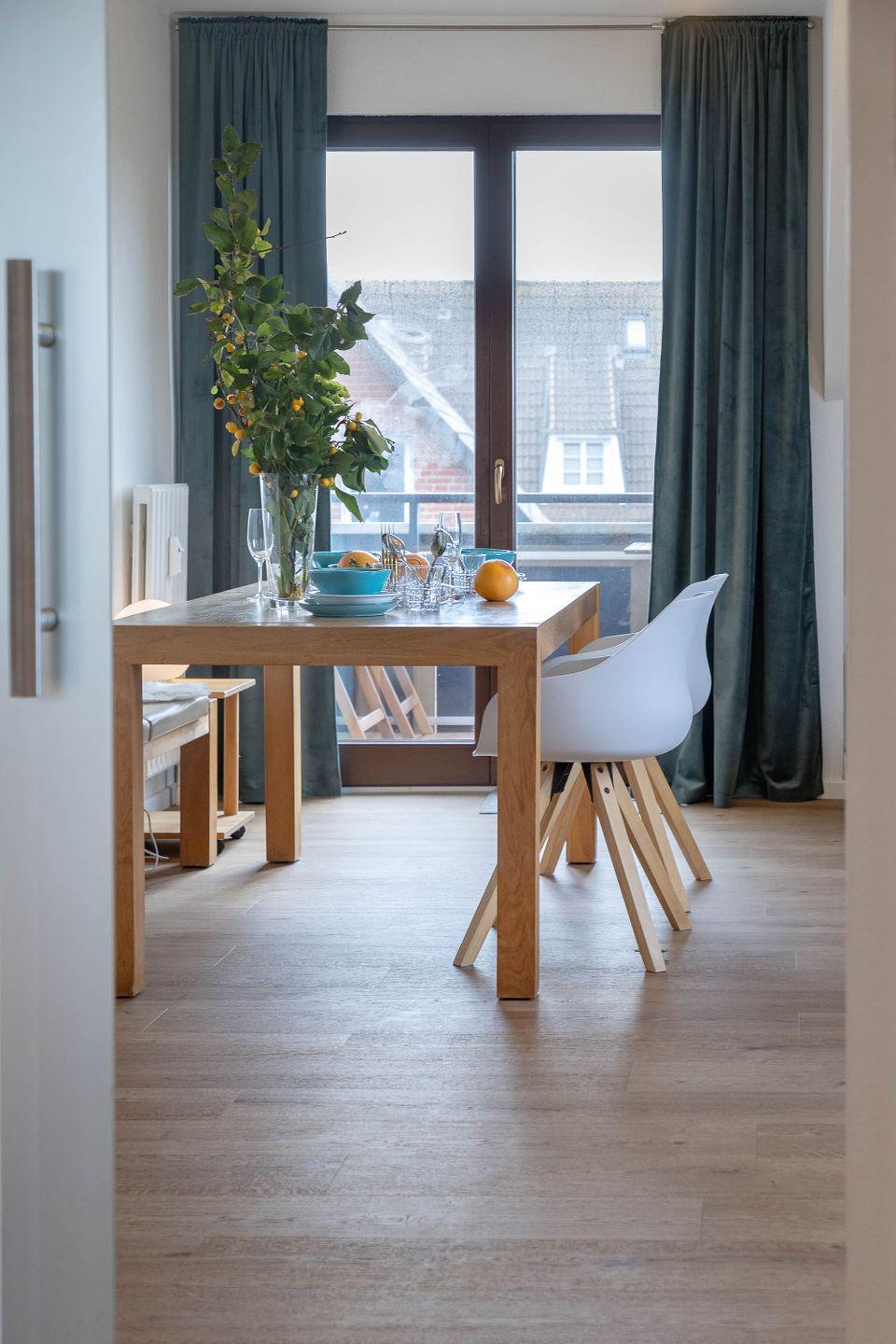 Westerland, Fischerweg, strandnah. Die 2-Zimmerwohnung bietet alles für einen komfortablen Sylt Urlaub im gehobenen Ambiente. Die direkte Nachbarschaft von Strand und Dünen bietet einen ganz besonderen Reiz. Ruhige Lage am Südwäldchen in Nähe des DORINT Hotels. Die Wohnung hat ca. 45m² und liegt in der 2. Etage eines zweigeschossigen Hauses. Geschmackvolle, hochwertige Einrichtung und modernste Technik werden Sie begeistern. Offener Wohn-/ Küchenbereich (4 Plattenherd), modernes Duschbad mit Glasmosaik, SZ mit Doppelbett (kleiner Flat TV). Im schicken Wohnraum (großer Flat TV) kann für die 3. Person das Schlafsofa genutzt werden. Wlan steht den Gästen selbstverständlich zur Verfügung. Zum Strand geht man über die Dünen ca. 4 Minuten, zur Stadt über die Promenade ca. 10 Minuten. PKW Stellflächen nach Verfügbarkeit am Haus (Innenhof). Preis bei 2erBelegung, 3. Erwachsener Aufpreis 5,00 €/Person am Tag.