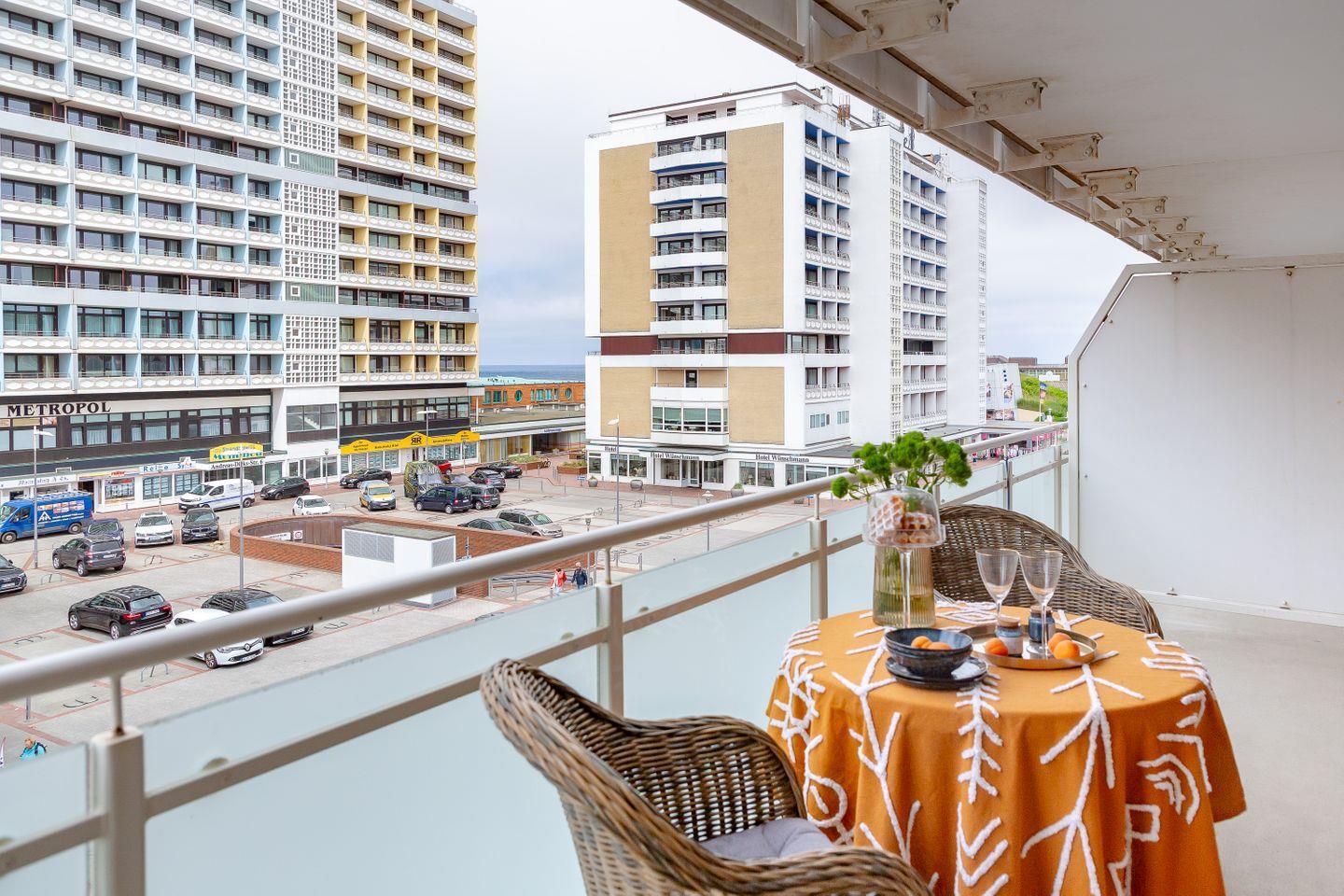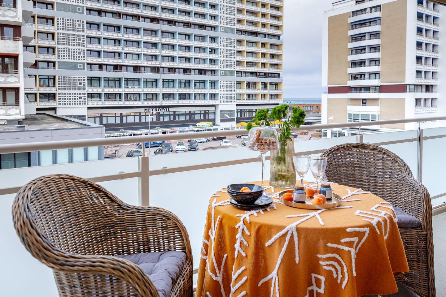 Zusätzlich haben Sie Zugang zu einem Balkon, der Ihnen die Möglichkeit bietet, die frische Nordseeluft un d den kleinen Meerblick zu genießen und vielleicht bei einem Glas Wein den Sonnenuntergang zu beobachten.