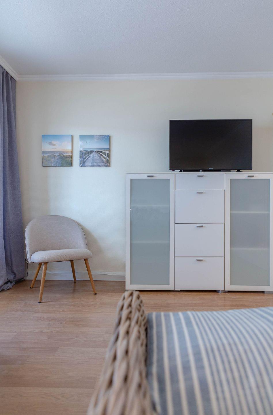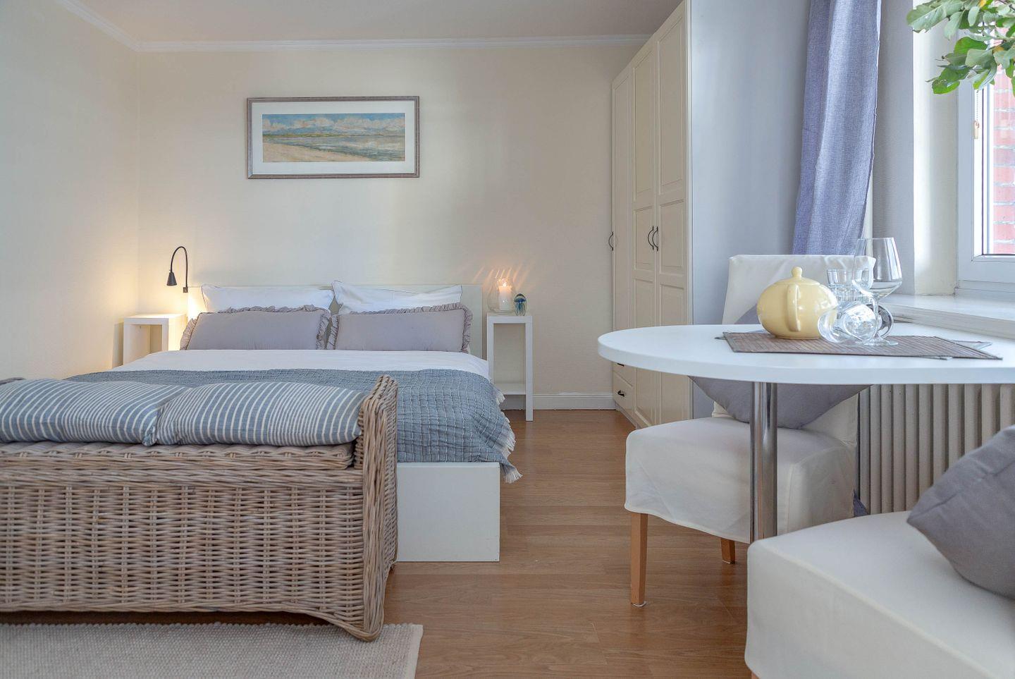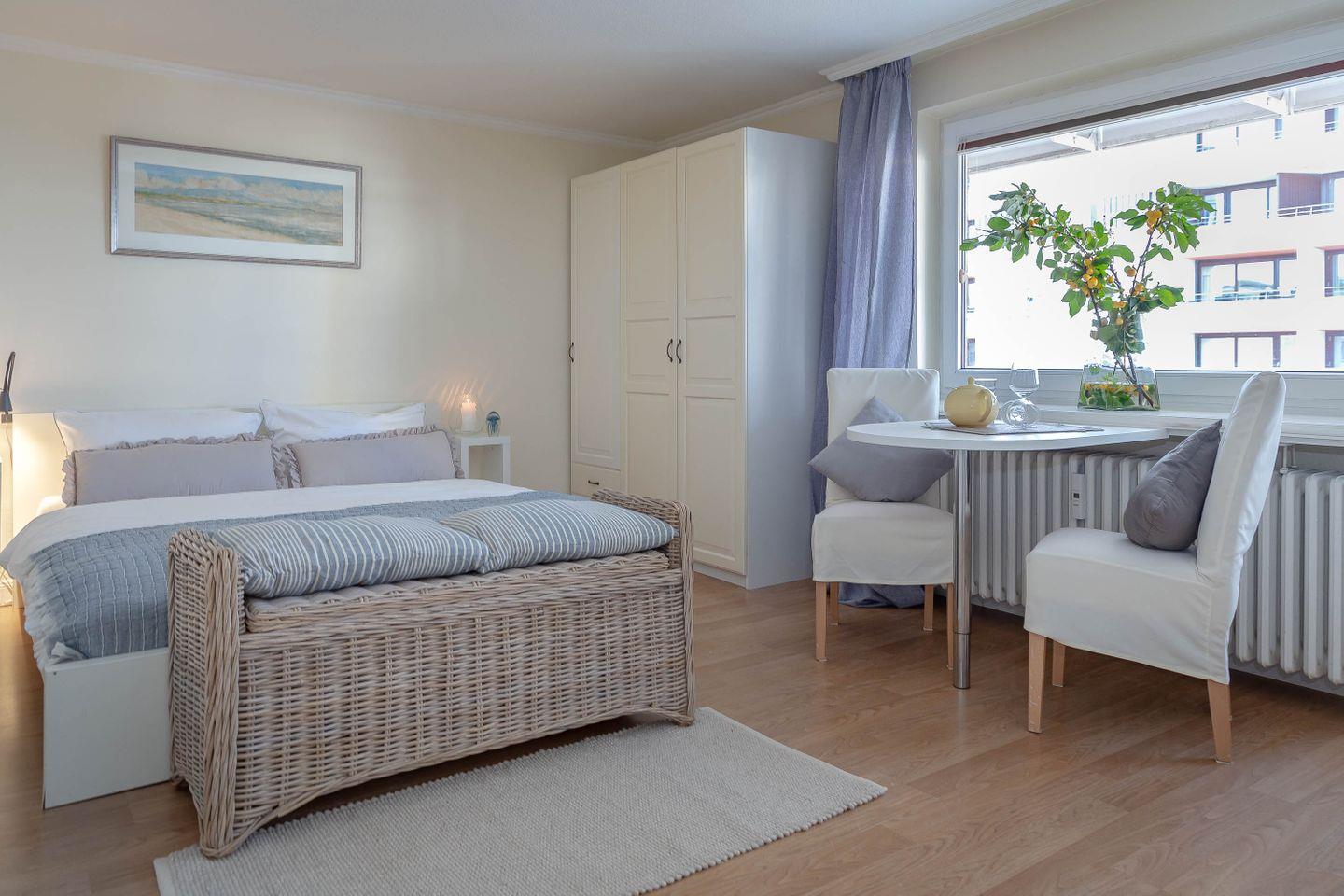 Das 1-Zimmerapp. befindet sich im 3.OG in einem mehrstöckigen Appartementhaus in kurzer Laufdistanz zum Strand, ca. 1 Minute vom Stadtkern entfernt. Das Appartement ist mit schickem Laminatboden ausgelegt. Im Wohnbereich befindet sich ein Essplatz für 2 Personen mit kleinem Blick auf das Wasser. Wohnraum mit Doppelbett. Der Balkon zeigt nach Westen und hat Nachmittagssonne und einen kleinen Meerblick. Im Haus befindet sich ein Fahrstuhl und eine Waschküche mit Münzautomaten. Von der Wohnung aus sind es nur wenige Momente ins Zentrum und dem feinsandigen Strand von Westerland. Gleich um die Ecke befindet sich ein Bäcker und ein Fahrradverleih. Kostenfreier WLAN-Hotspot im Haus. Ein Stellplatz in der TG kann, nach Verfügbarkeit, ab 15,- / Tag mit angemietet werden.