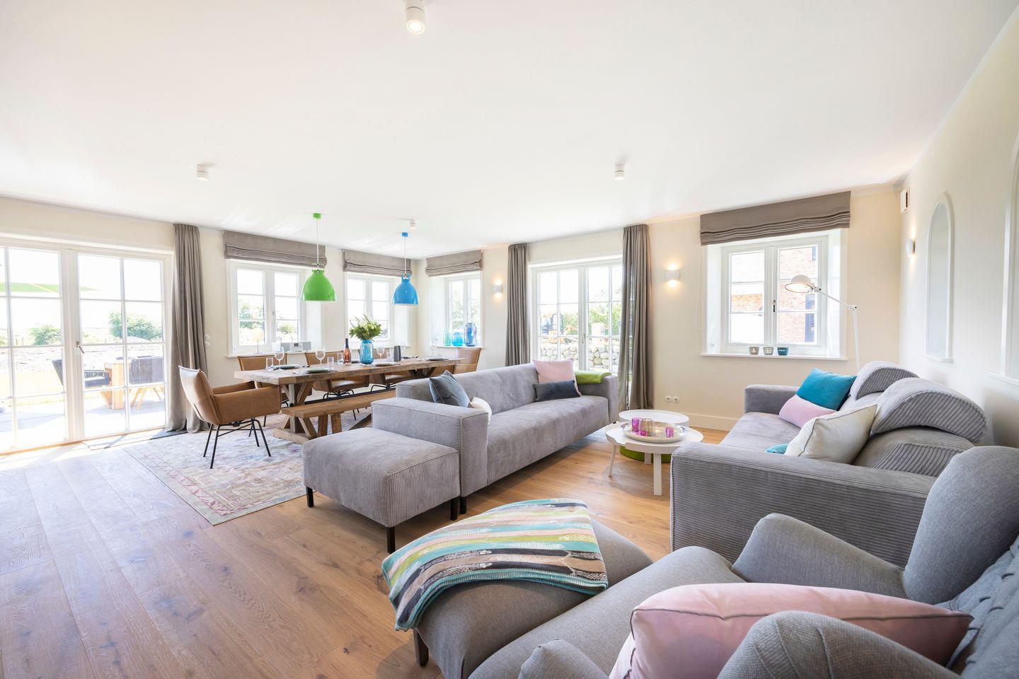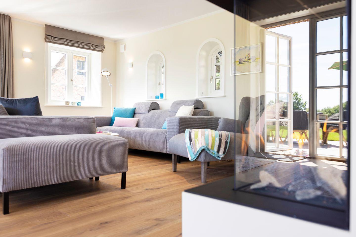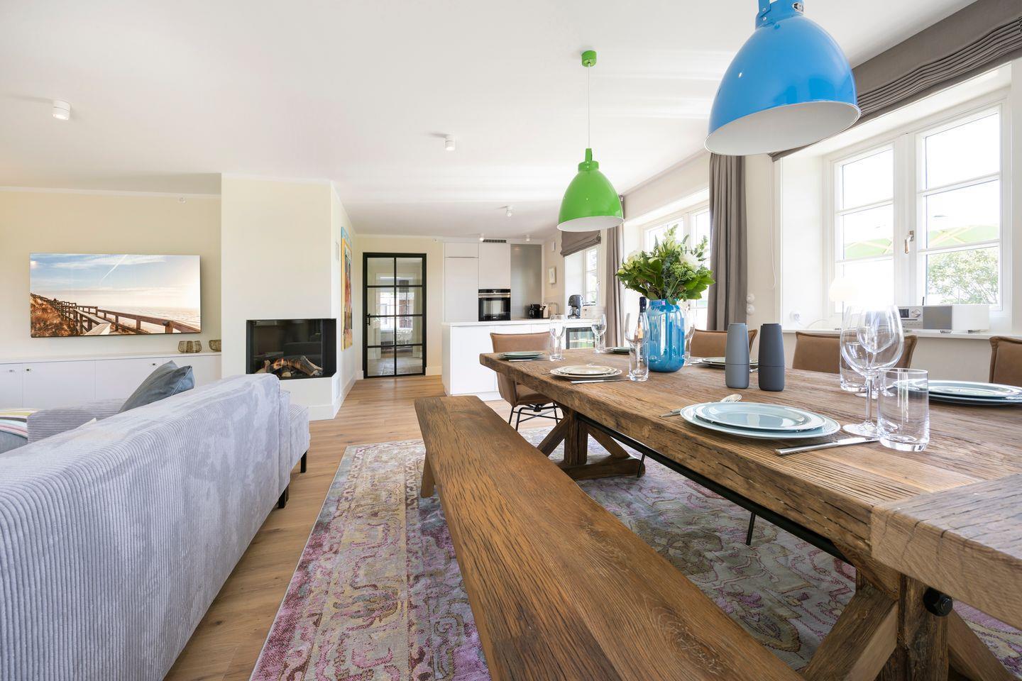 Der lichtdurchflutete Wohn- und Essbereich vereint friesische Gemütlichkeit mit modernster Ausstattung. Die gemütlichen Couchen und der Gaskamin machen den Raum zum perfekten Rückzugsort nach einem langen Tag. Der Esstisch aus 100 Jahre altem Eichenholz lädt zu ausgiebigen Mahlzeiten und geselligen Abenden ein. Die offene, hochwertige Wohnküche ist mit sämtlichen modernen Annehmlichkeiten ausgestattet und verfügt über einen Weinkühlschrank.