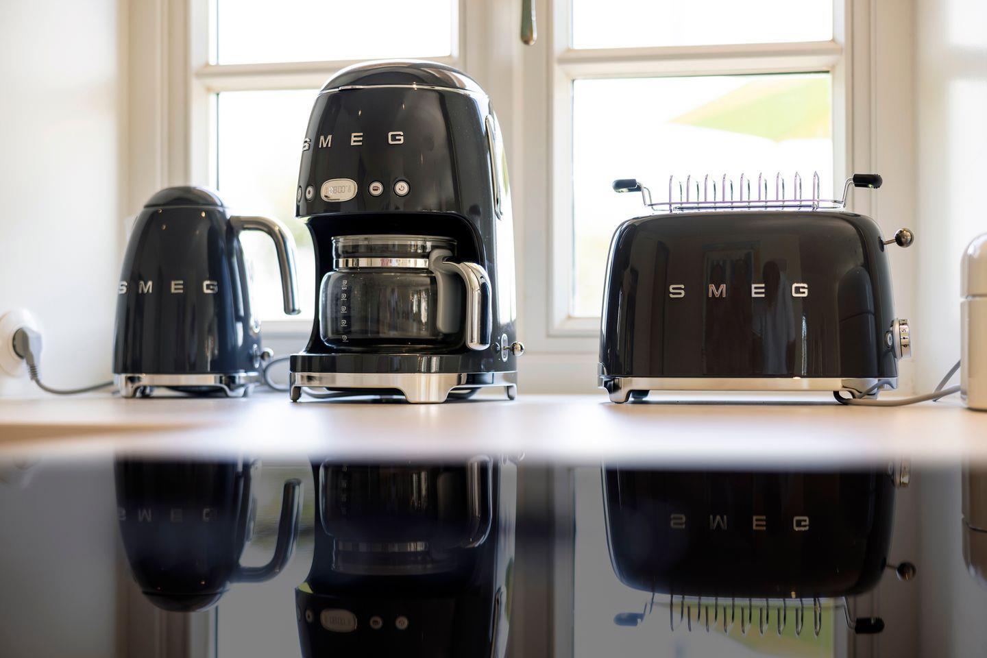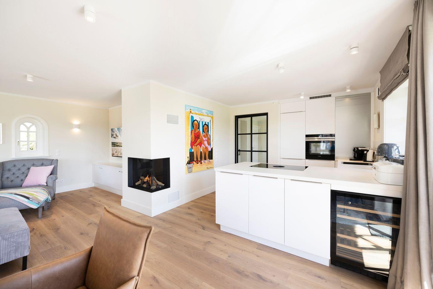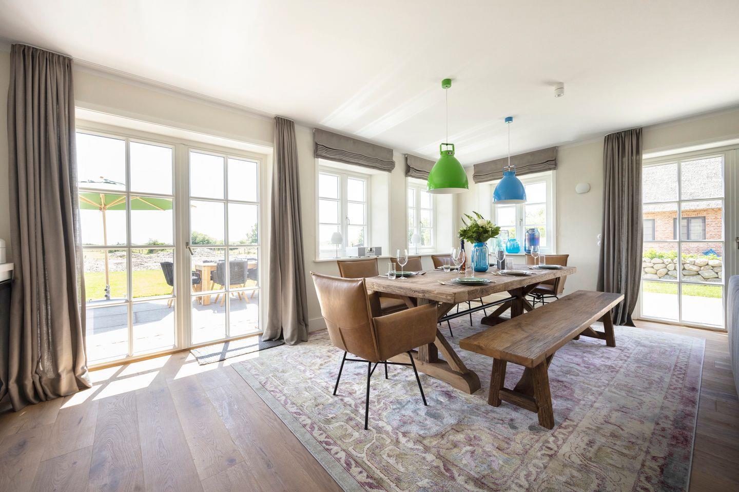 Der lichtdurchflutete Wohn- und Essbereich vereint friesische Gemütlichkeit mit modernster Ausstattung. Die gemütlichen Couchen und der Gaskamin machen den Raum zum perfekten Rückzugsort nach einem langen Tag. Der Esstisch aus 100 Jahre altem Eichenholz lädt zu ausgiebigen Mahlzeiten und geselligen Abenden ein. Die offene, hochwertige Wohnküche ist mit sämtlichen modernen Annehmlichkeiten ausgestattet und verfügt über einen Weinkühlschrank.