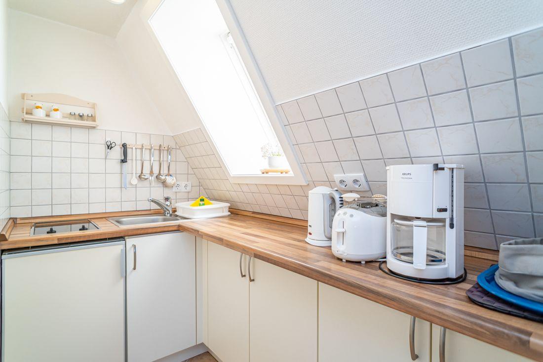 Küchenzeile verfügt u.a. über 2er Cerankochfeld, Kaffeemaschine und Kühlschrank