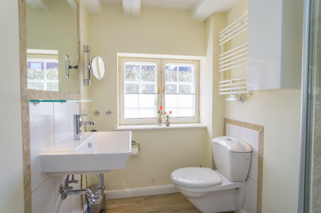 Ebenfalls ebenerdig liegt das Bad mit Dusche und WC.