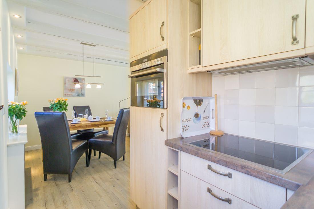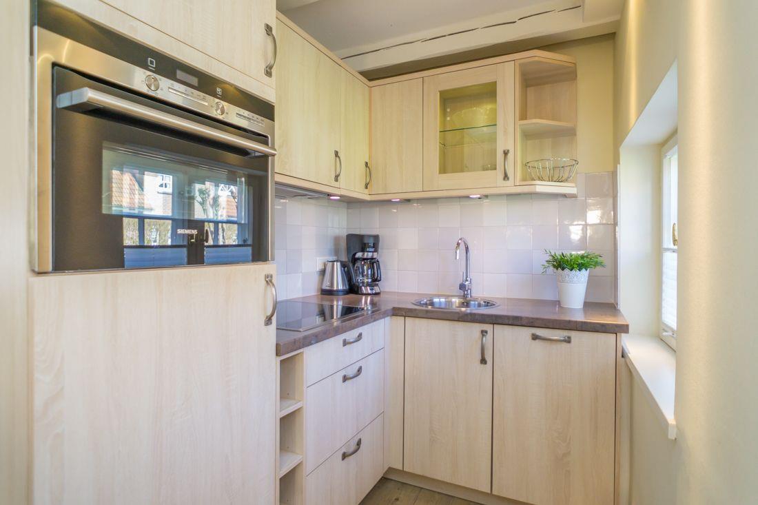 Die kleine Küchenzeile mit u.a. einer Spülmaschine, verbirgt sich in einer an den Wohnraum grenzenden Nische.
