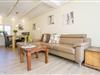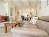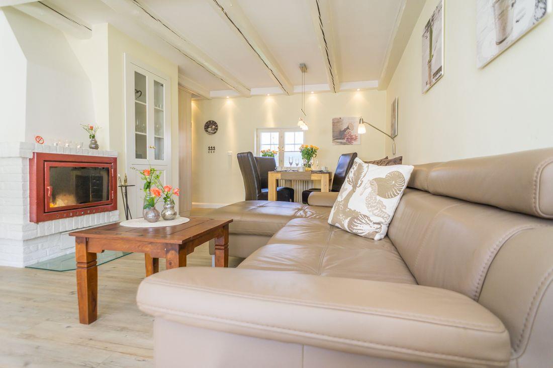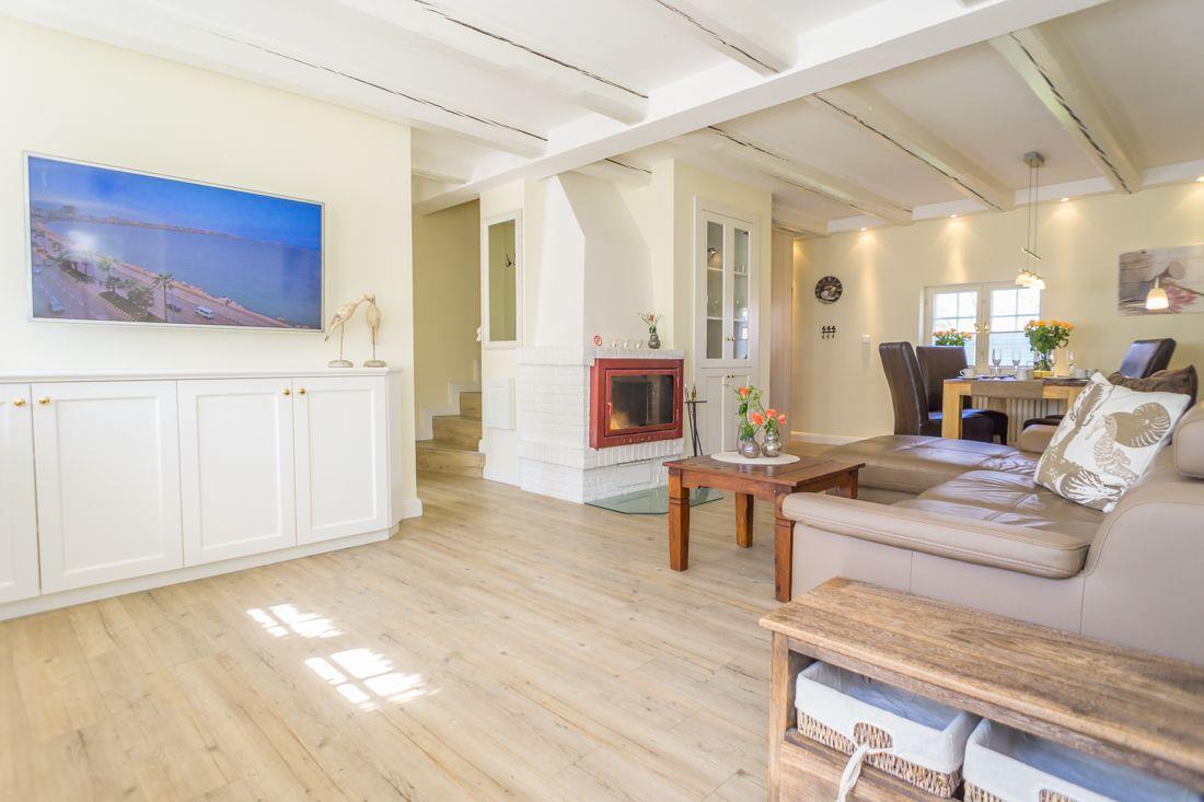 Zu ebener Erde liegt der einladende Wohn- und Eßraum mit Kamin.