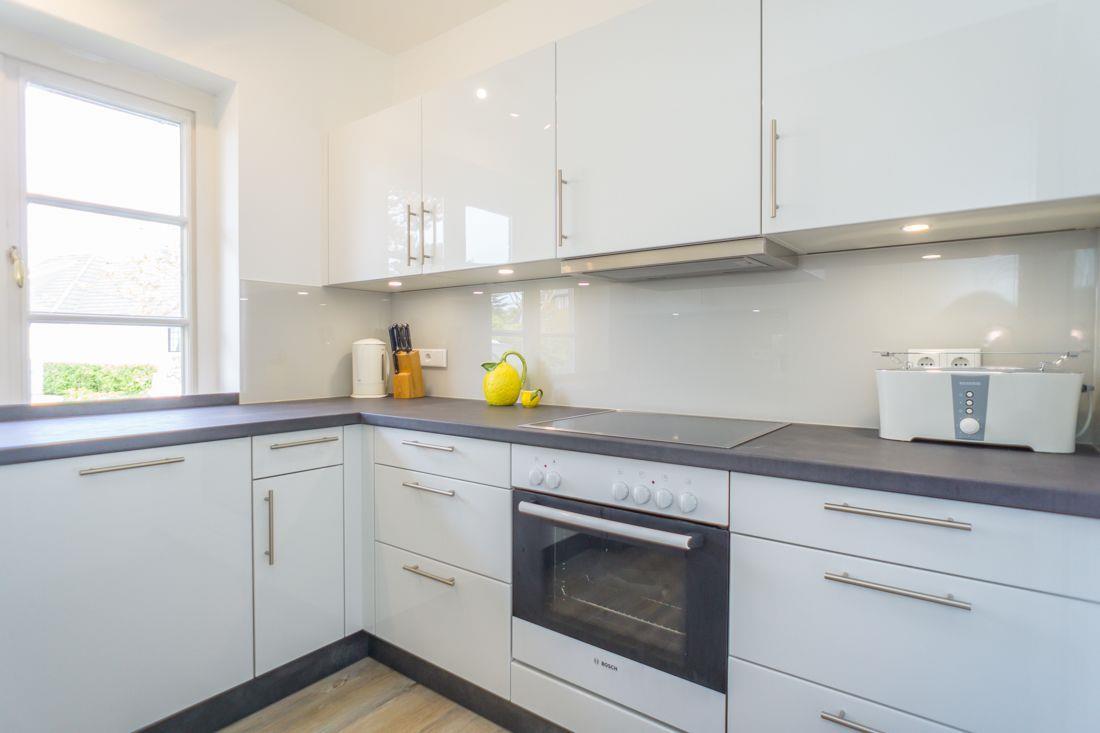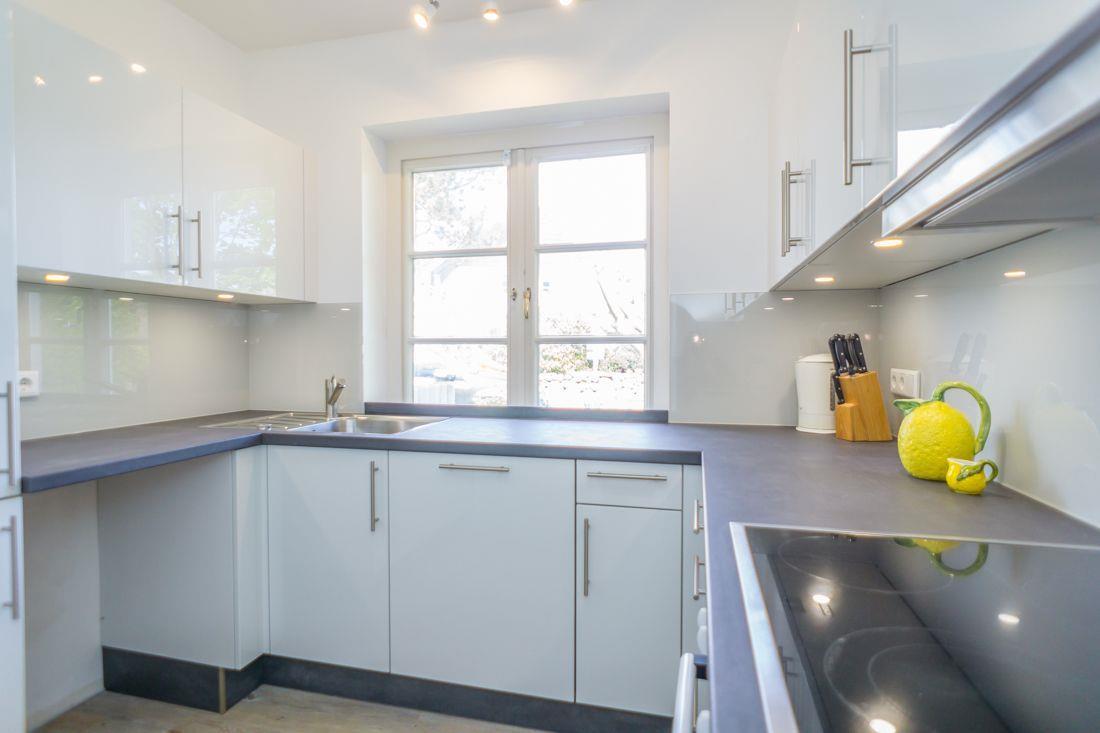 voll eingerichtete Küche mit u. a. 4er Ceranfeld, Backofen, Spülmaschine und Nespresso Kaffeemaschine.