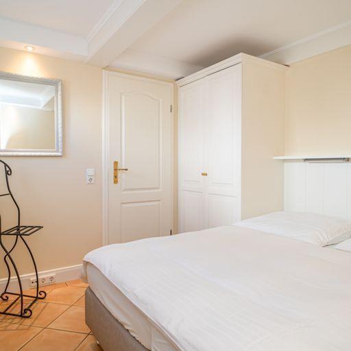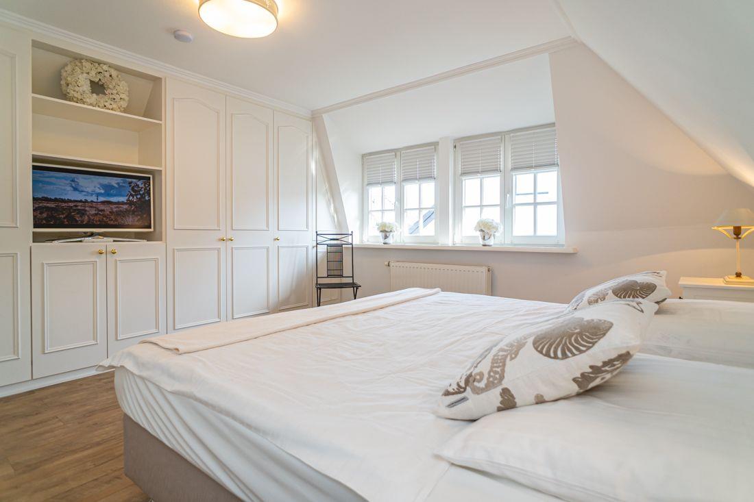 Ein Schlafzimmer eingerichtet mit einem Doppelbett ( Boxspringbett) und LCD Flat TV.