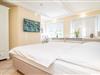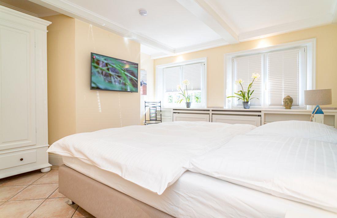 Ein Schlafzimmer eingerichtet mit einem Doppelbett ( Boxspringbett) und LCD Flat TV.