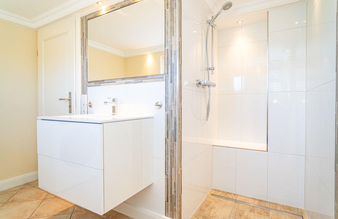 Ein Bad mit Dusche, Doppelwaschtisch und WC